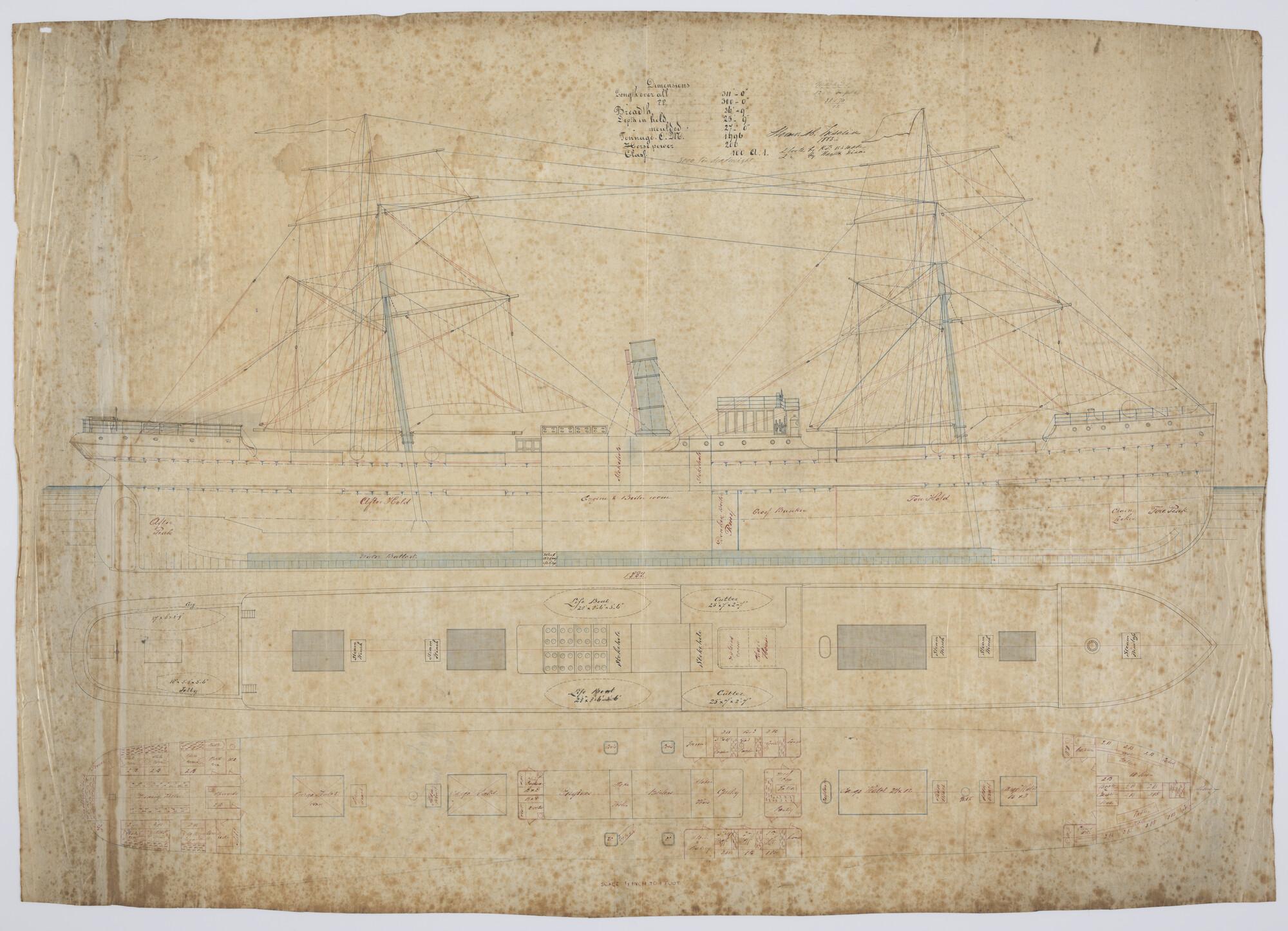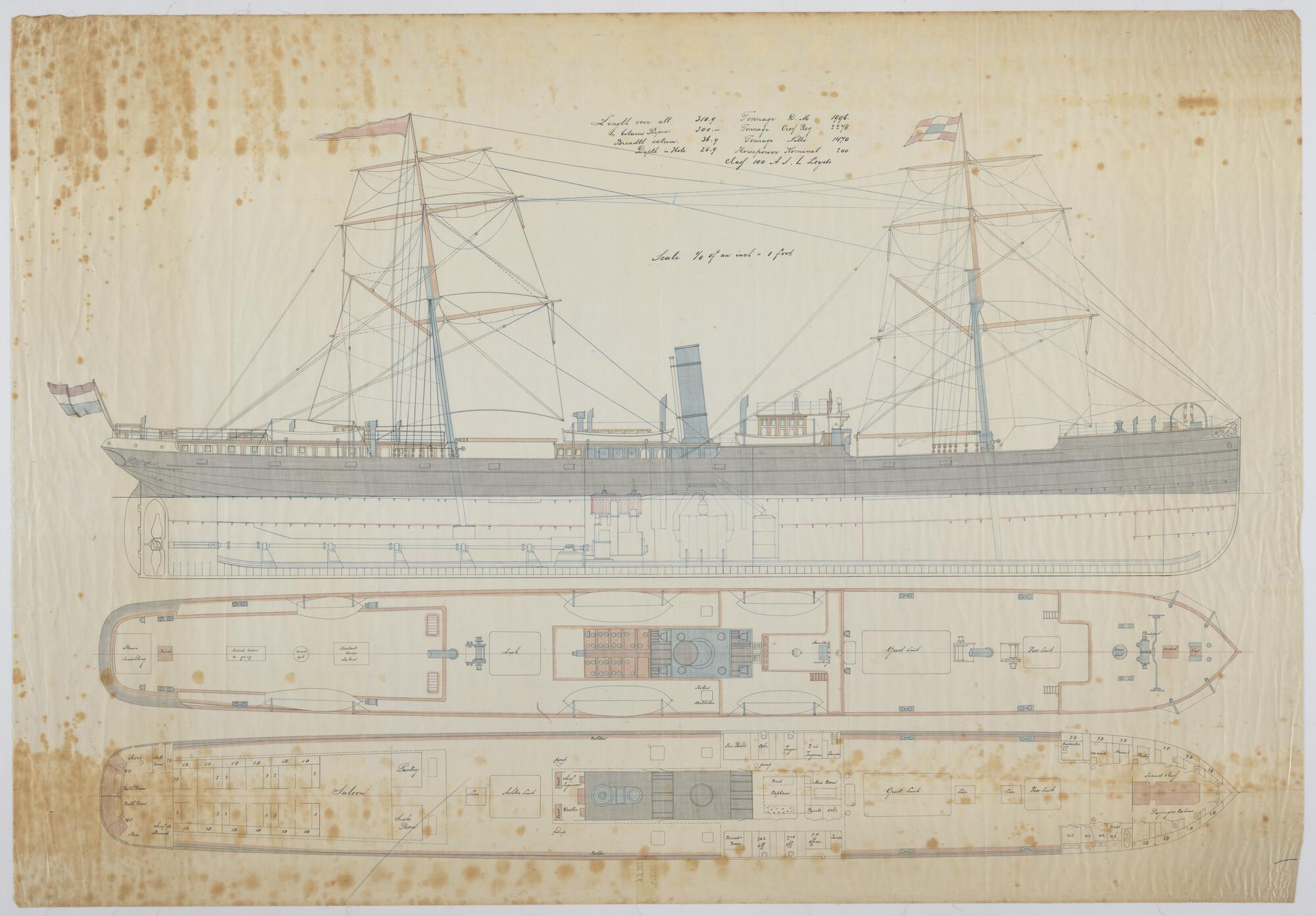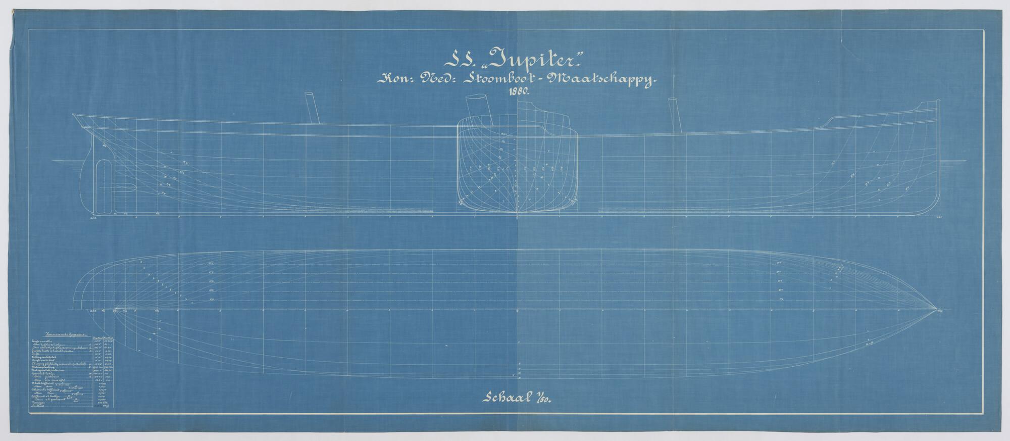 Zijaanzicht, lijnenplan, spantenraam, 'Jupiter' van ...
