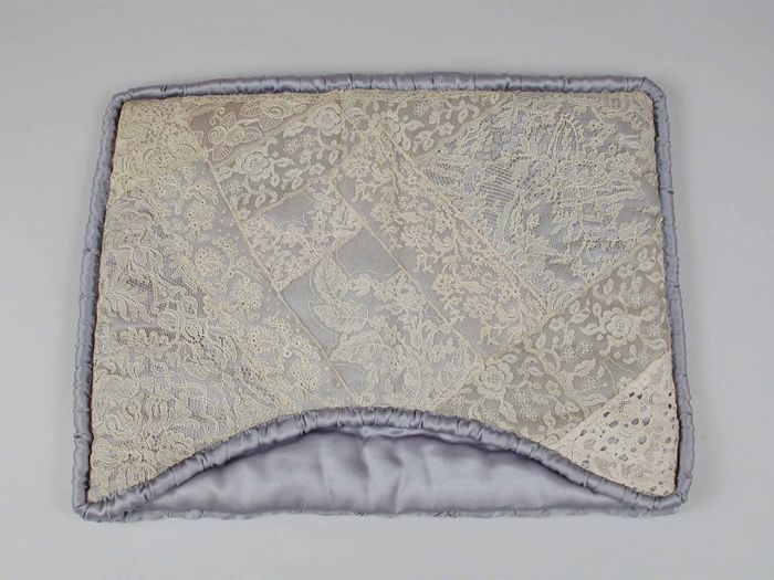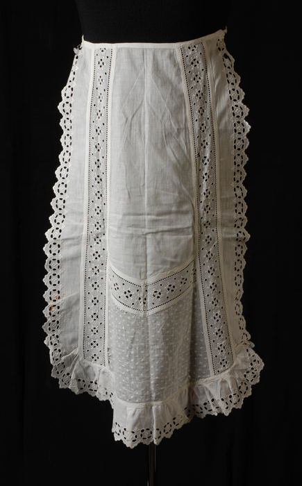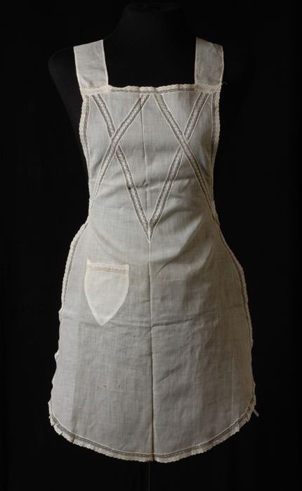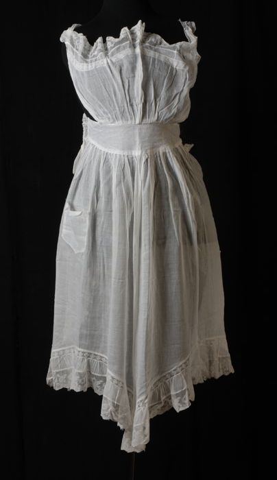 Donkerblauw glanzend schort afgebiesd met zwart kant