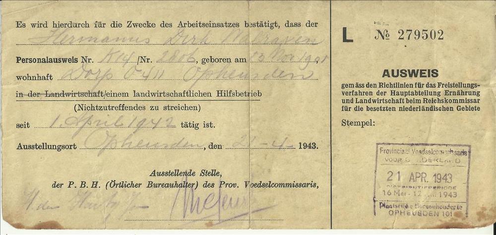 Ausweis L no 279502 van H.D. Walraven 21 april 1943