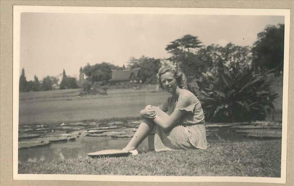 Lid Vrouwenkorps KNIL in de tuin van een palei in Ne...
