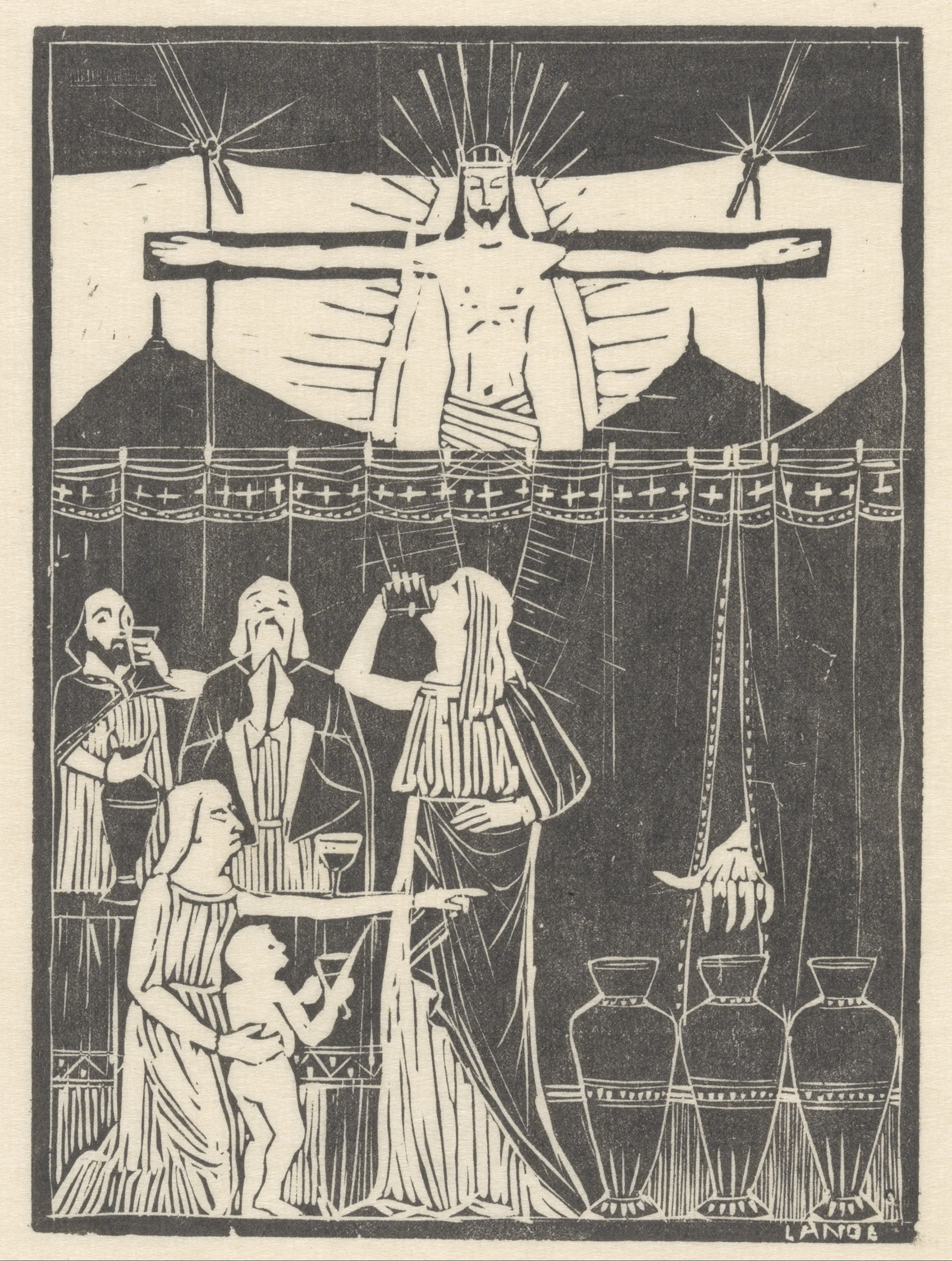 Drinkende mensen bij gekruisigde Christus