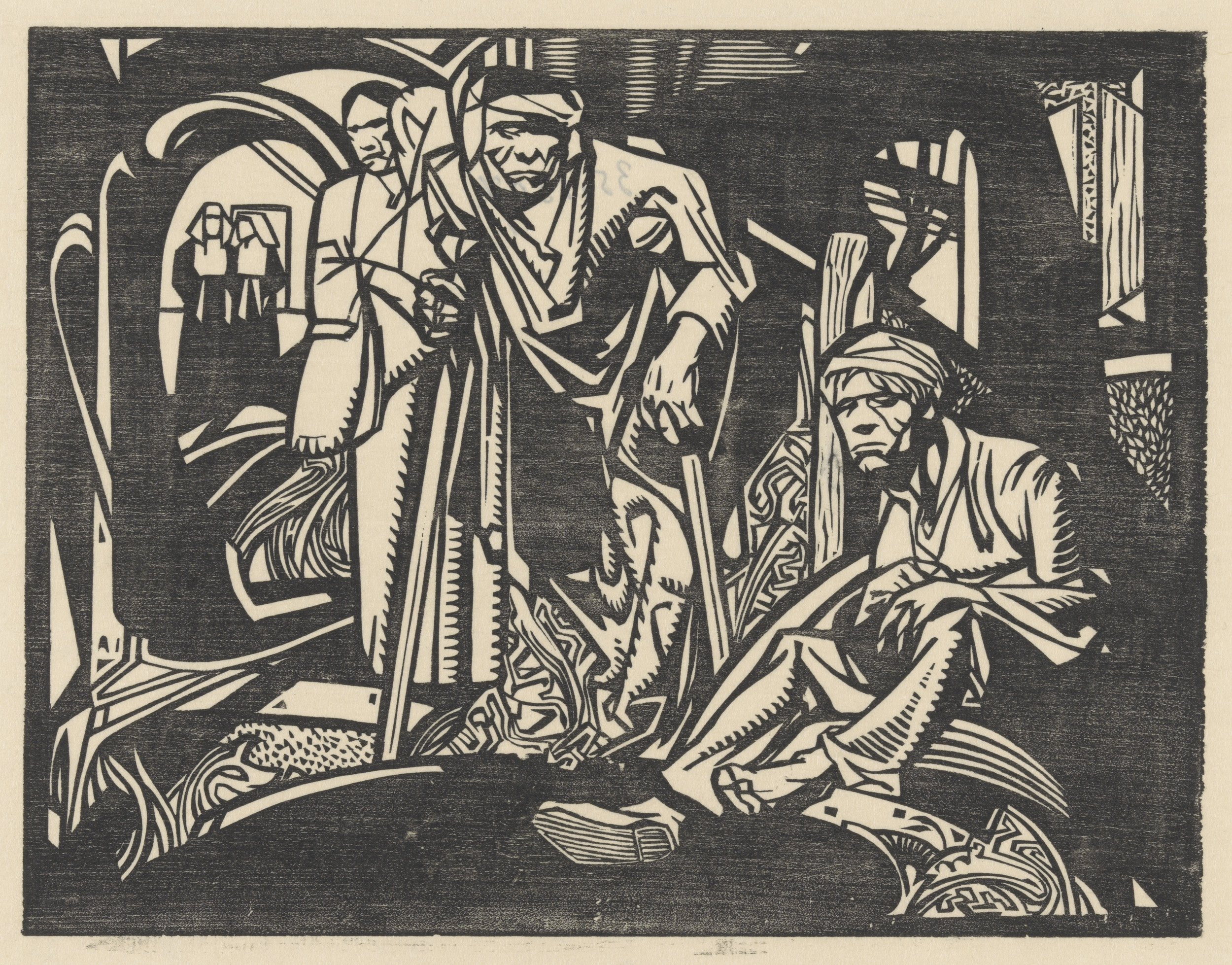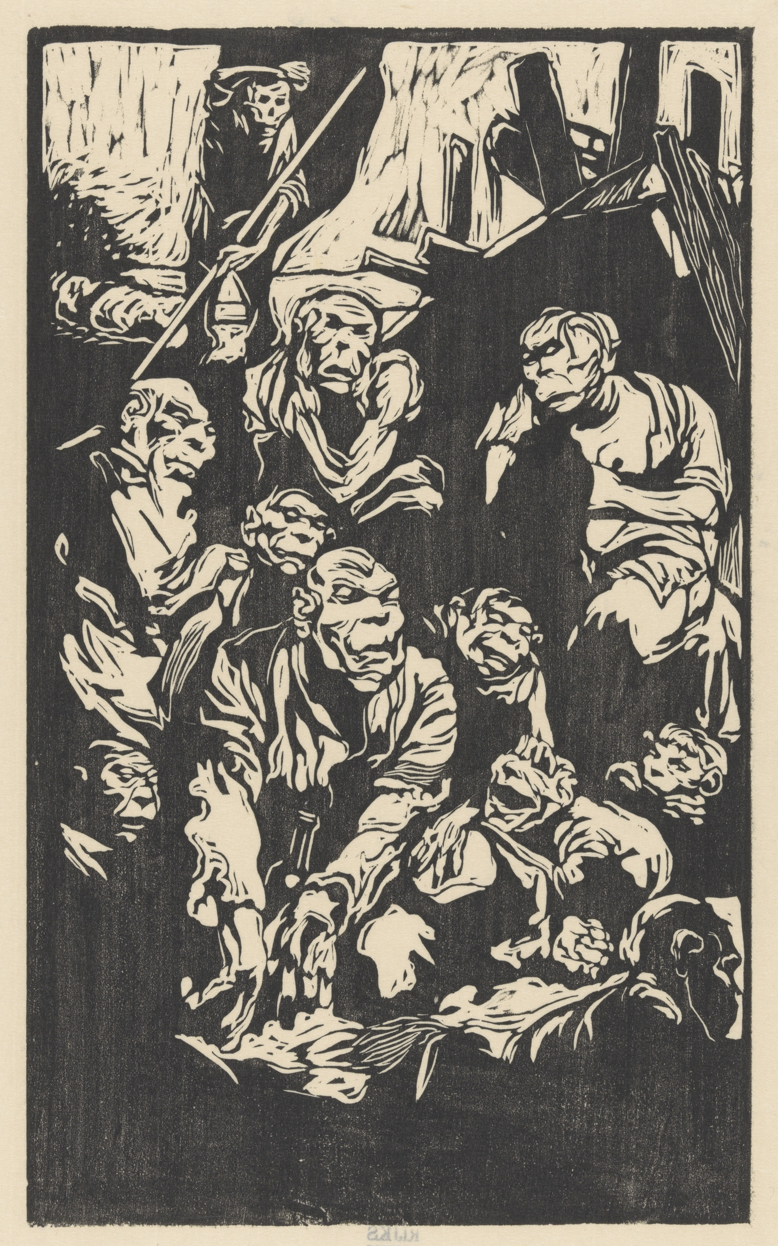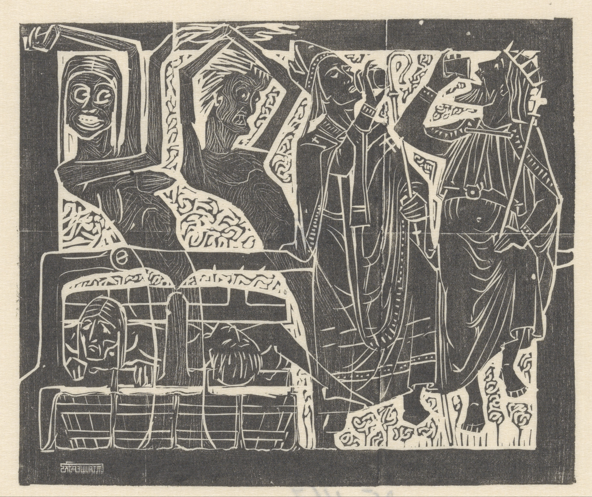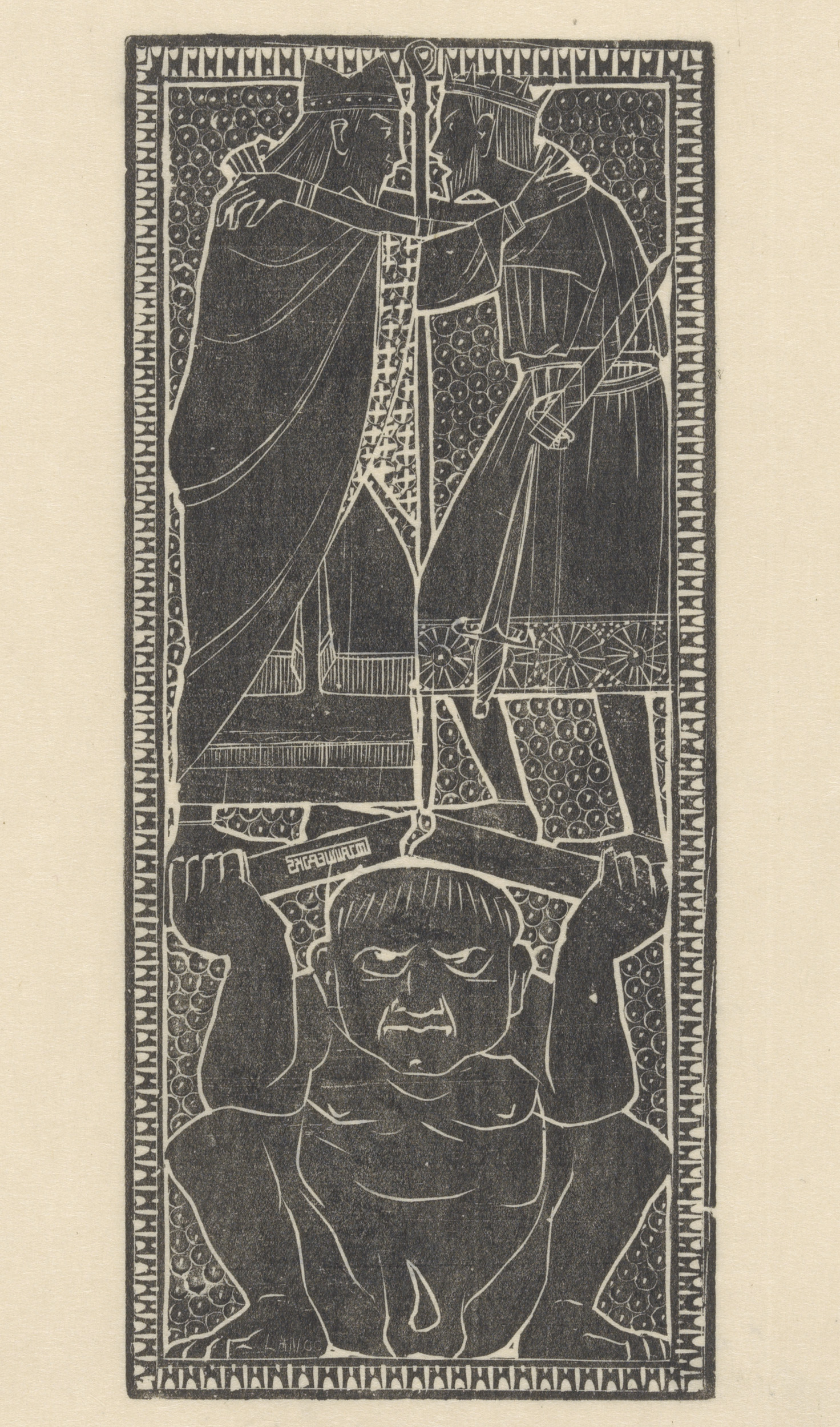 Gehurkte figuur en twee gekroonde mannen