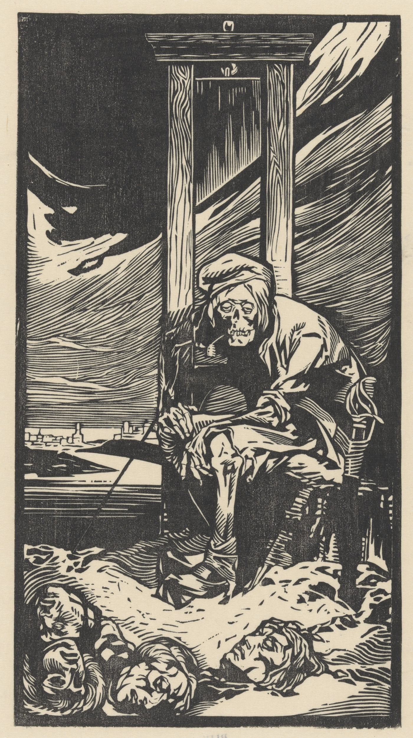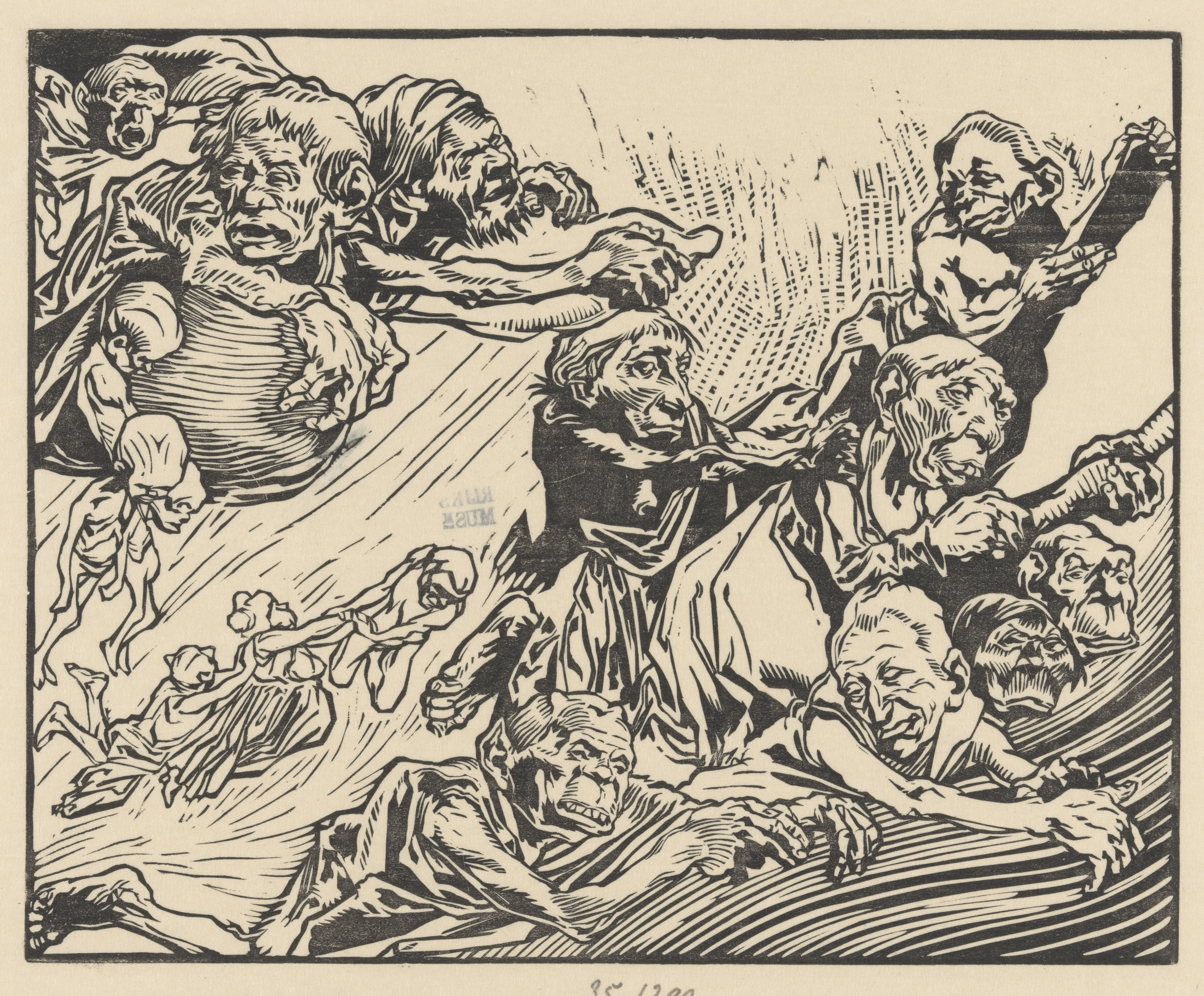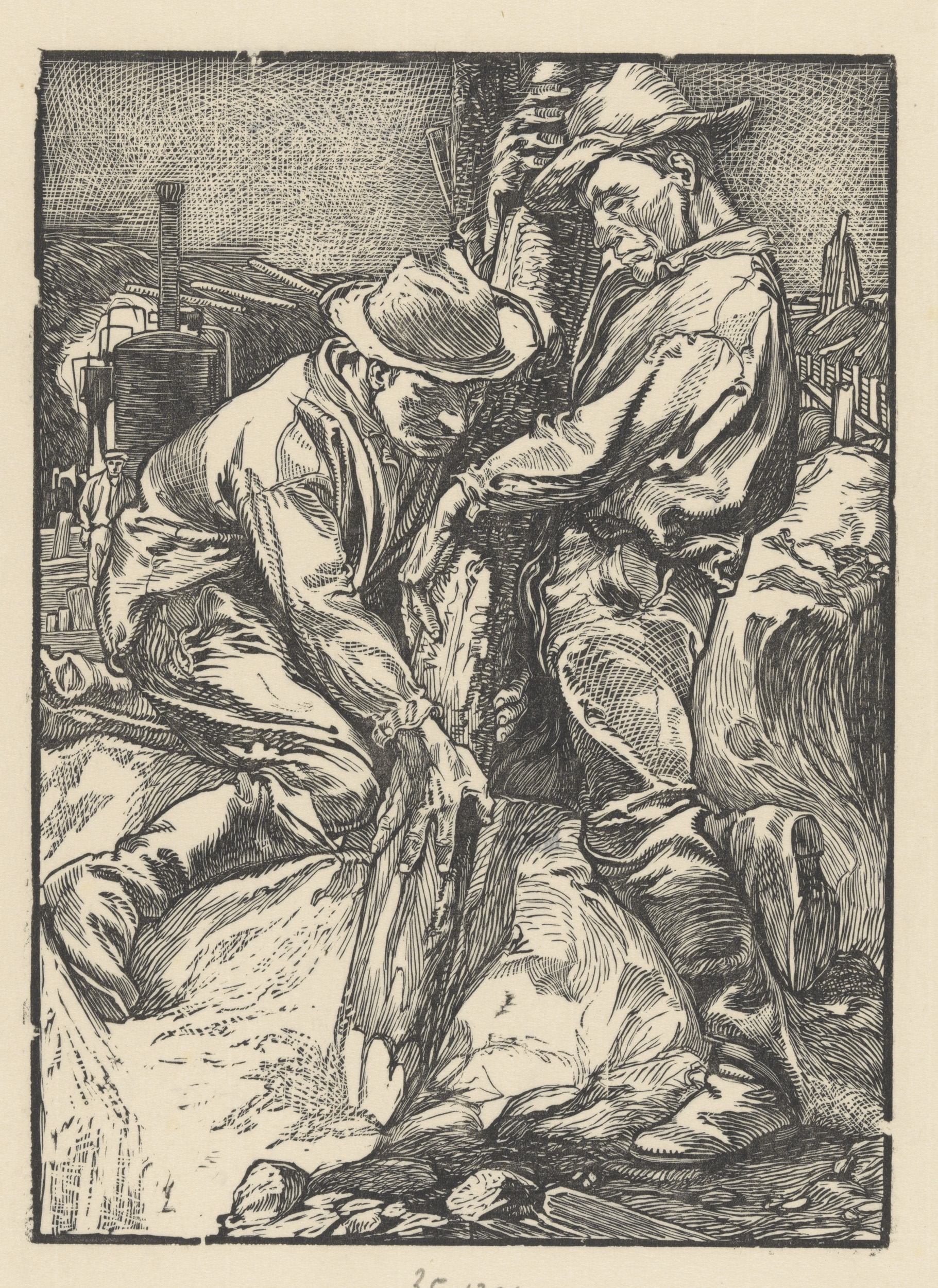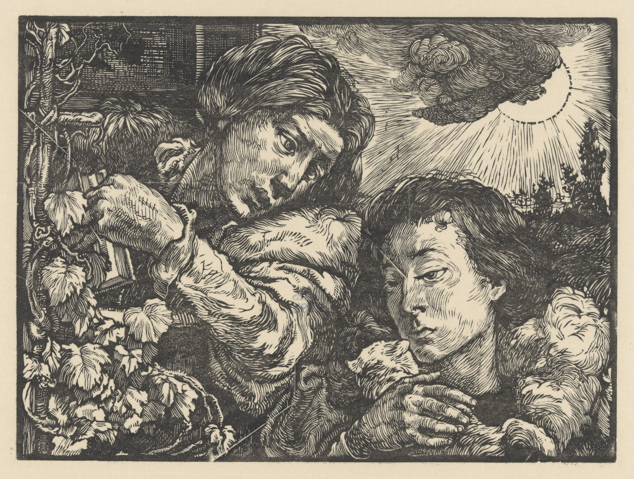 Gehurkte figuur en twee gekroonde mannen