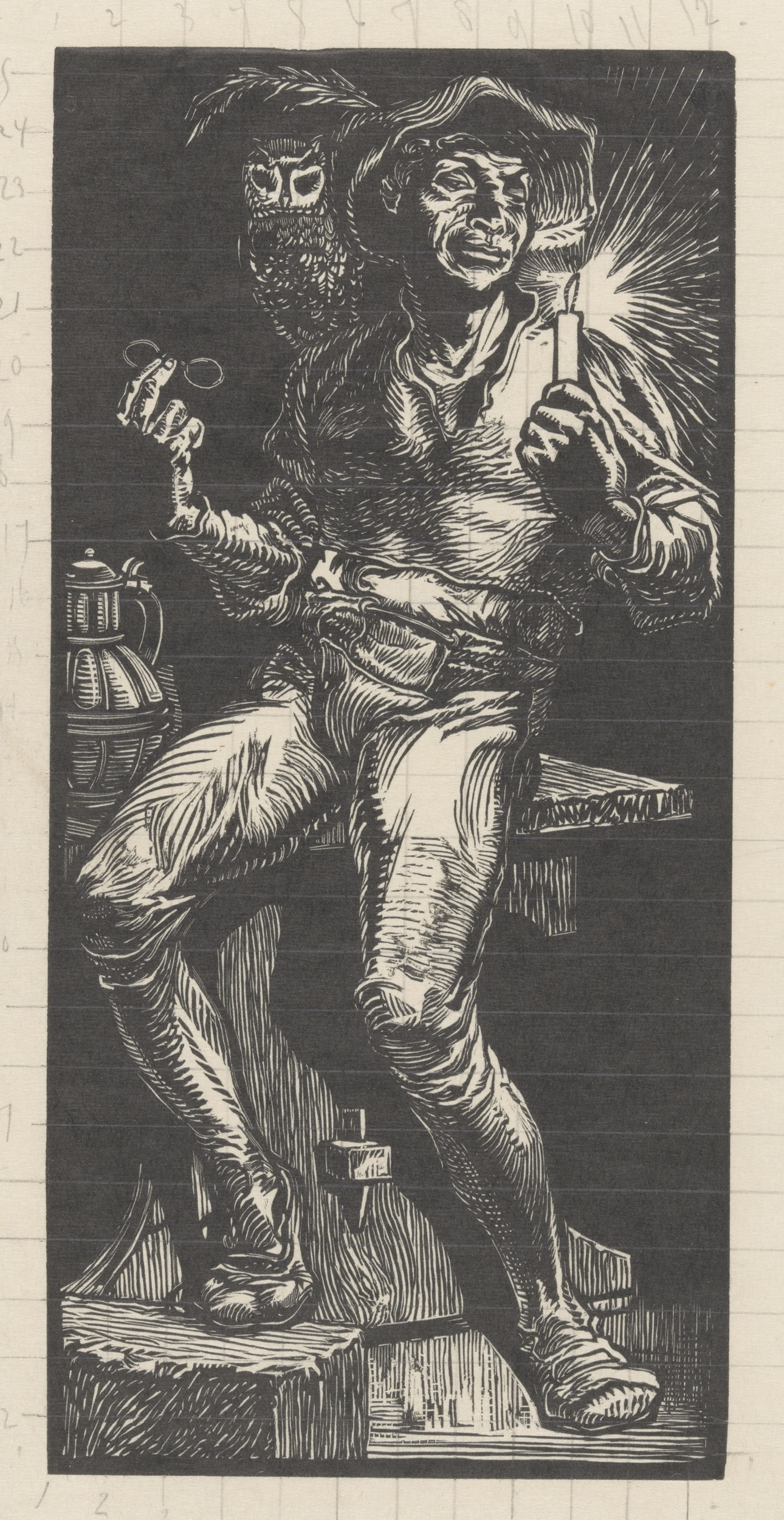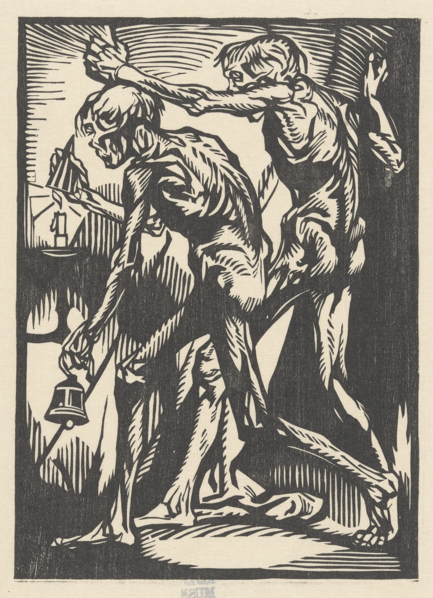 Staande figuur en mannenhoofd met opengesperde mond
