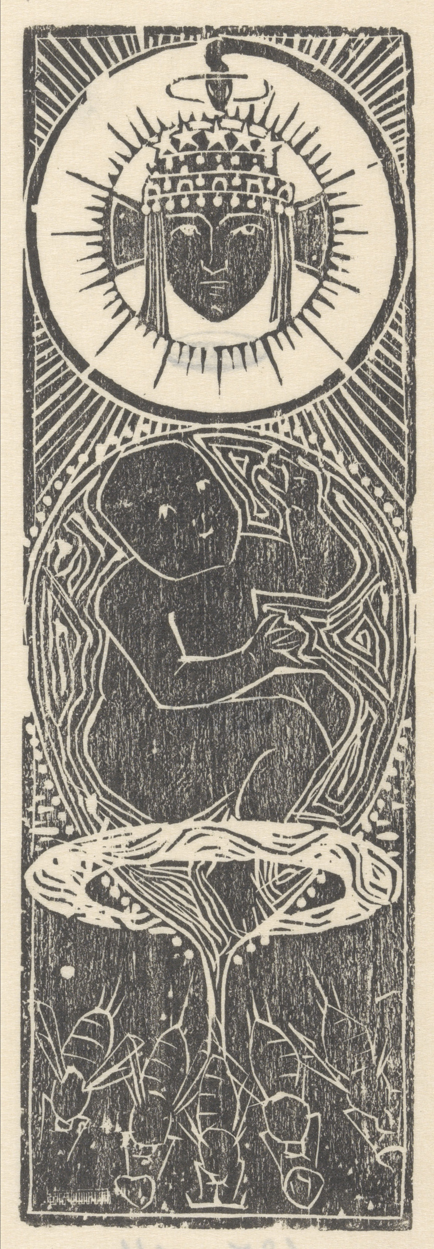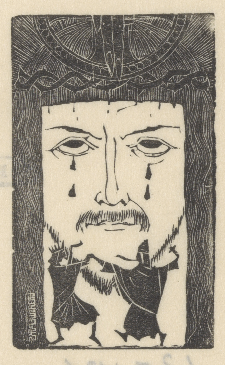 Vrouw bij figuur met doornenkronen om zijn duimen