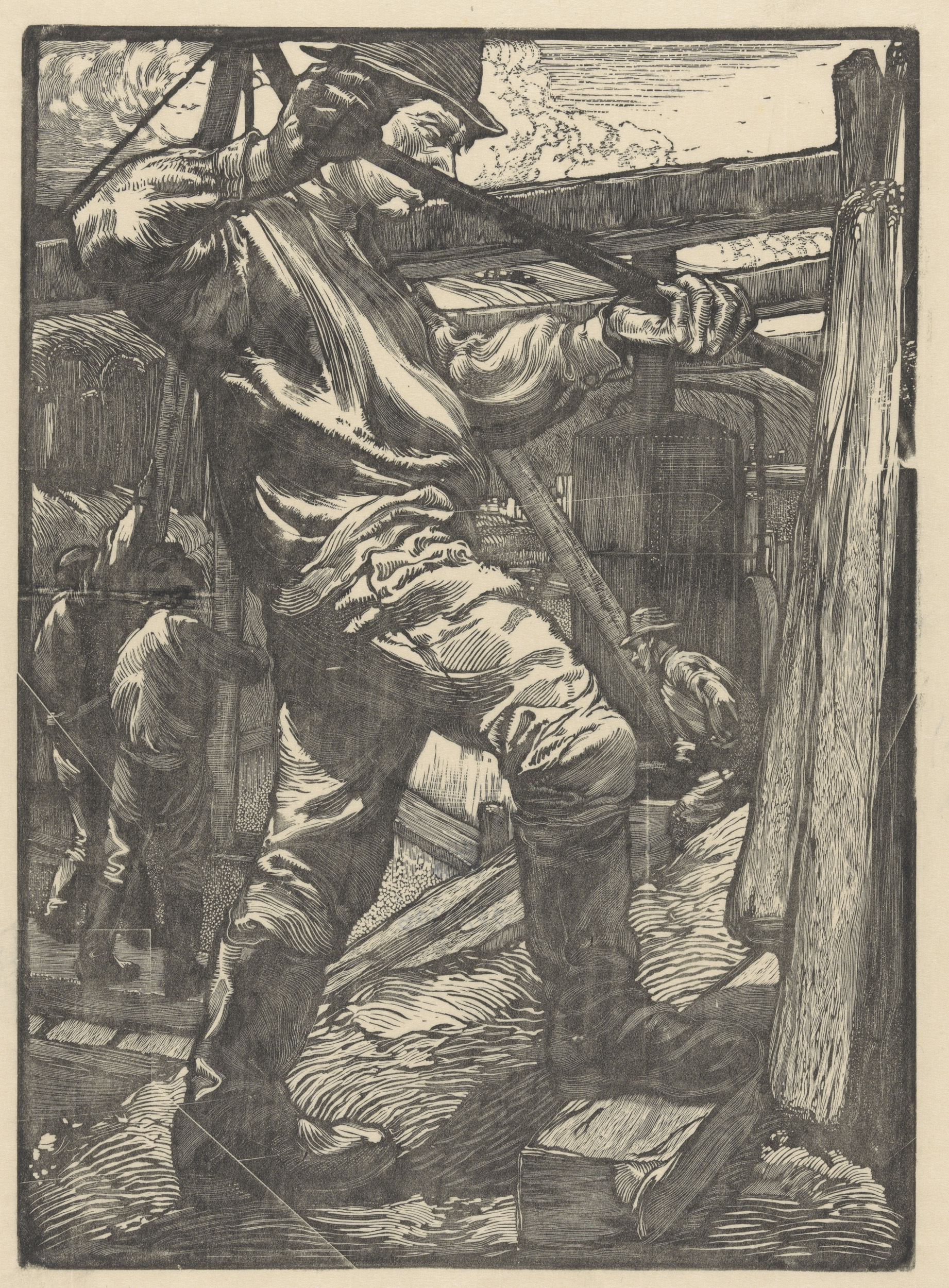 Mannenhoofd en figuren in de regen