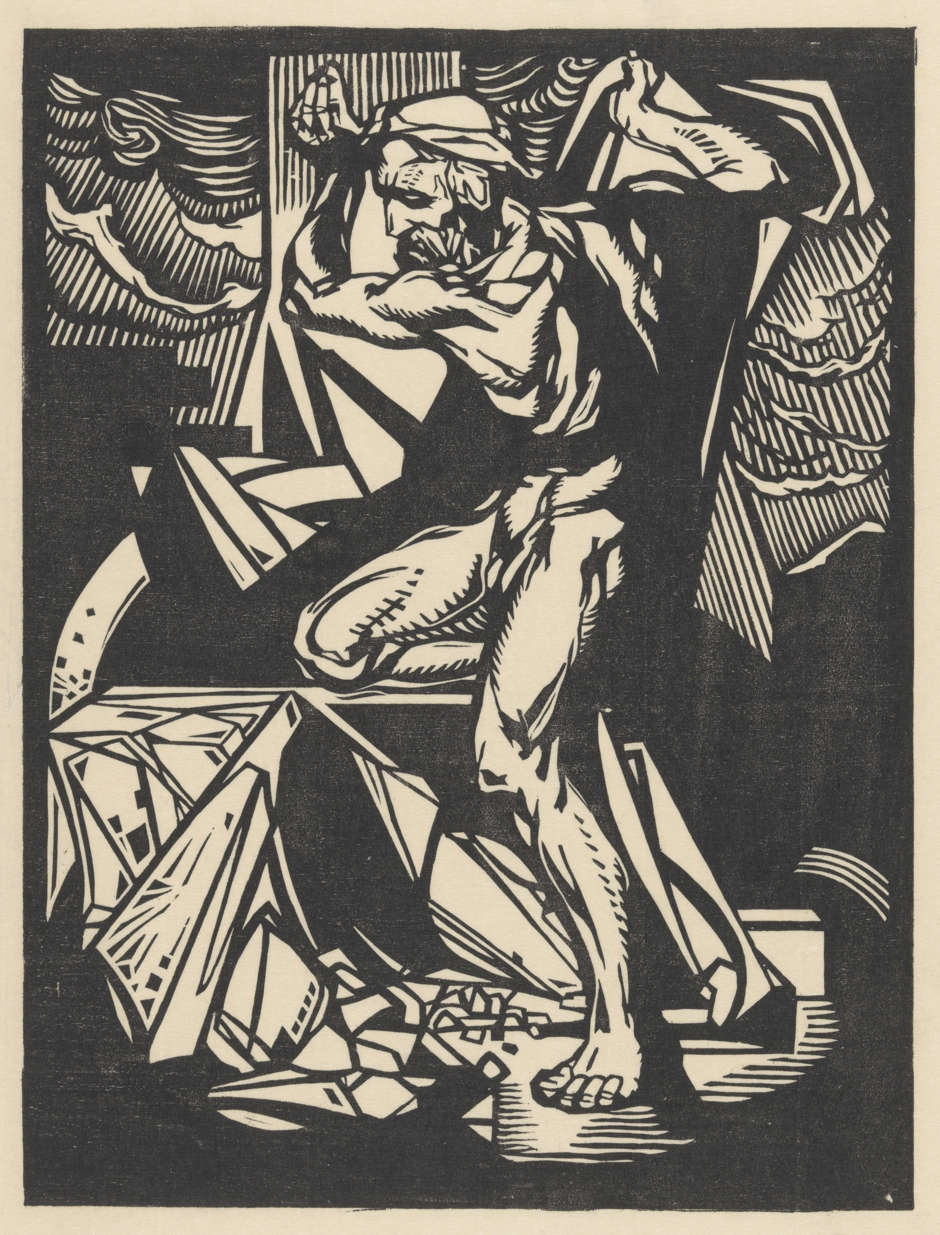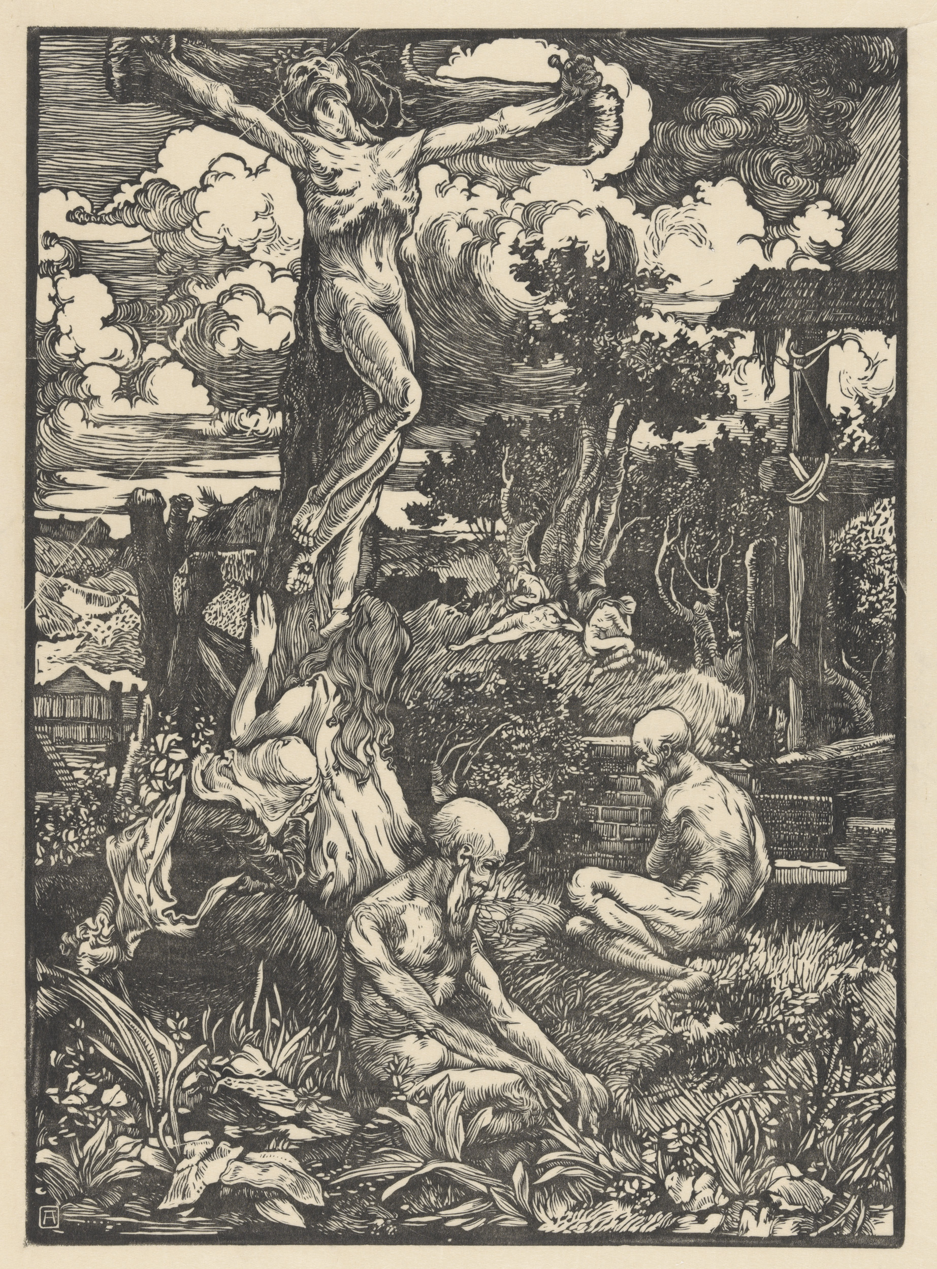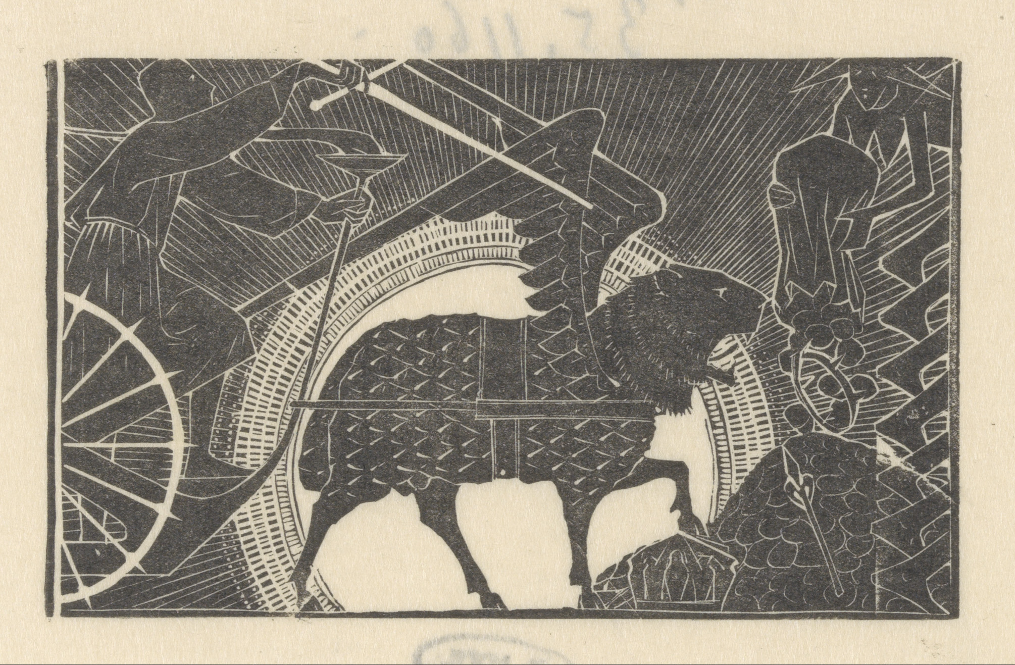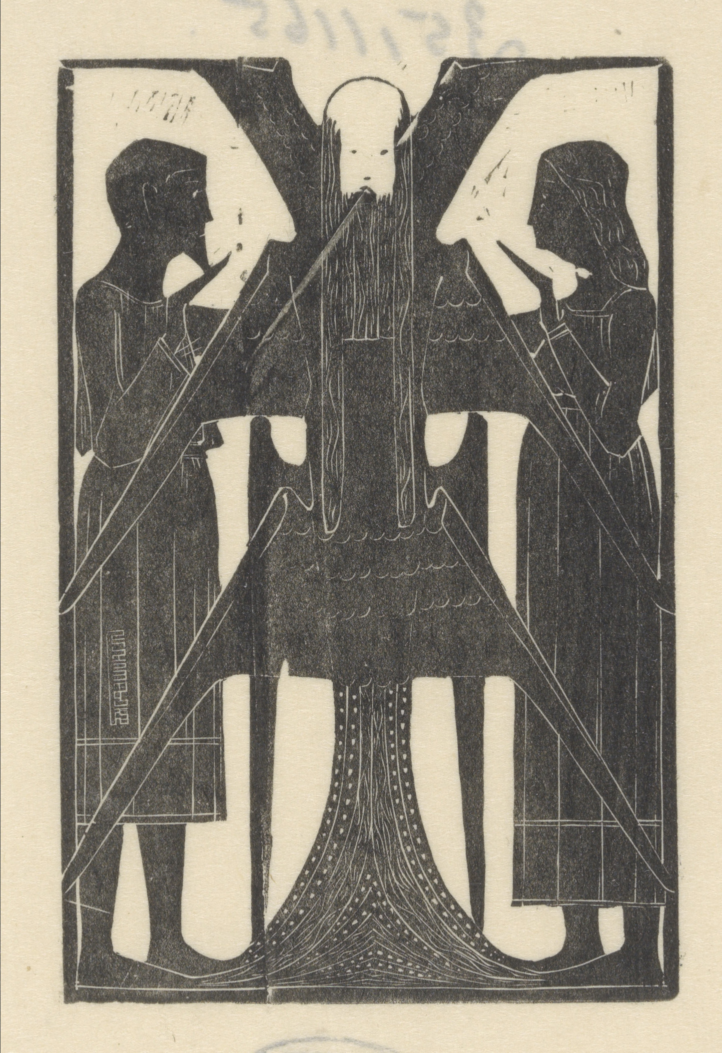 Drie knielende figuren voor gevleugelde man