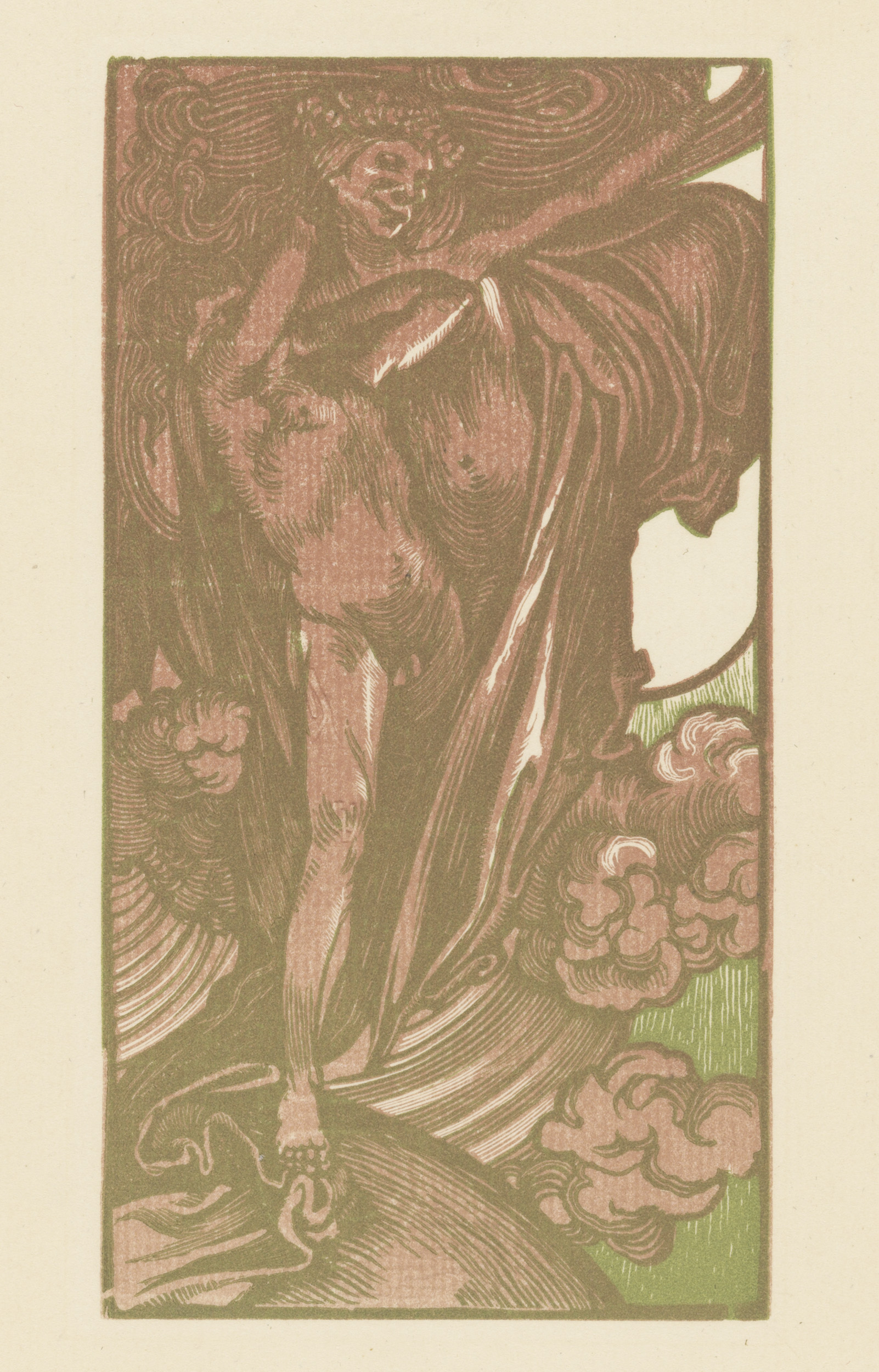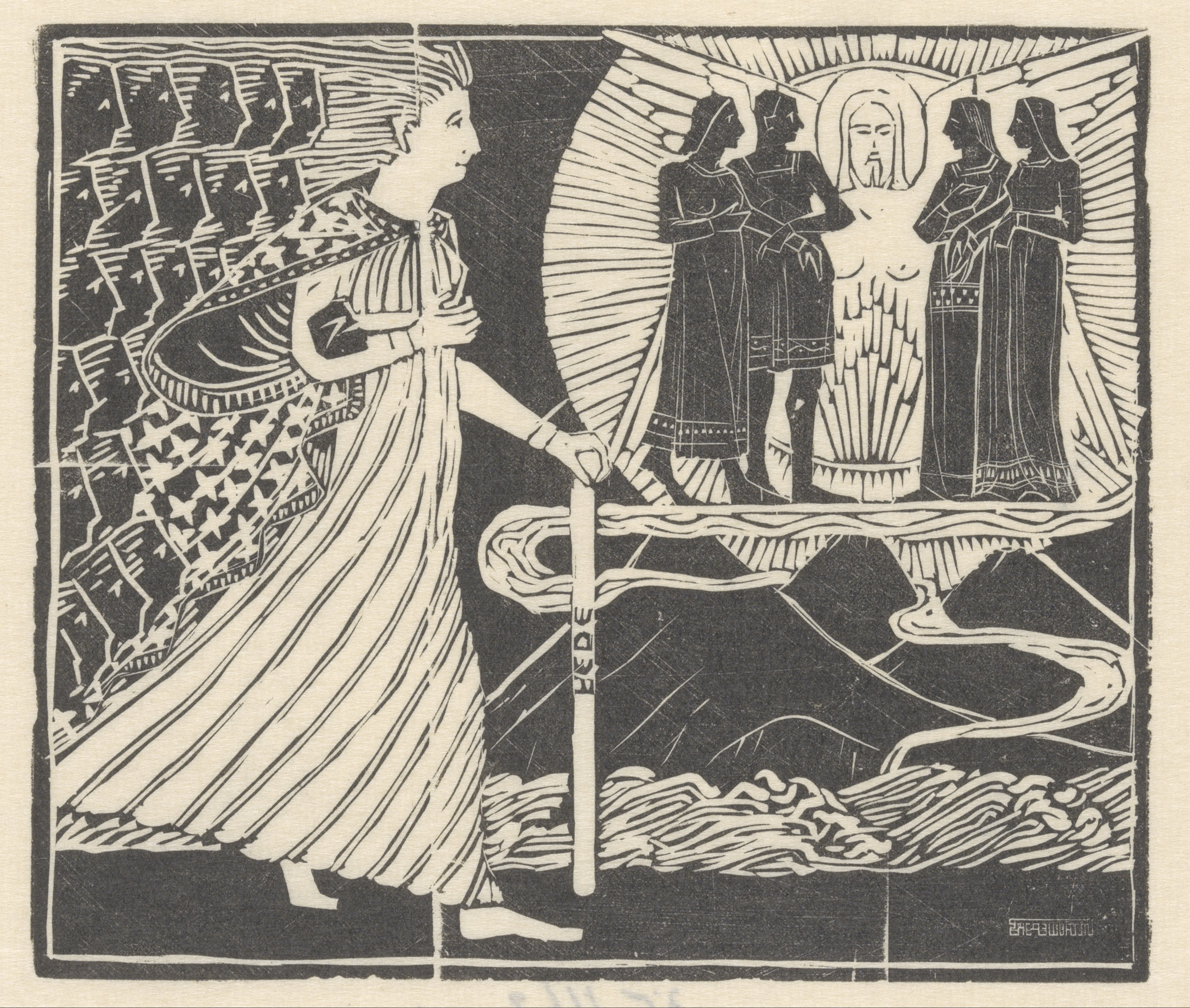 Wandelende vrouw en gevleugelde figuur