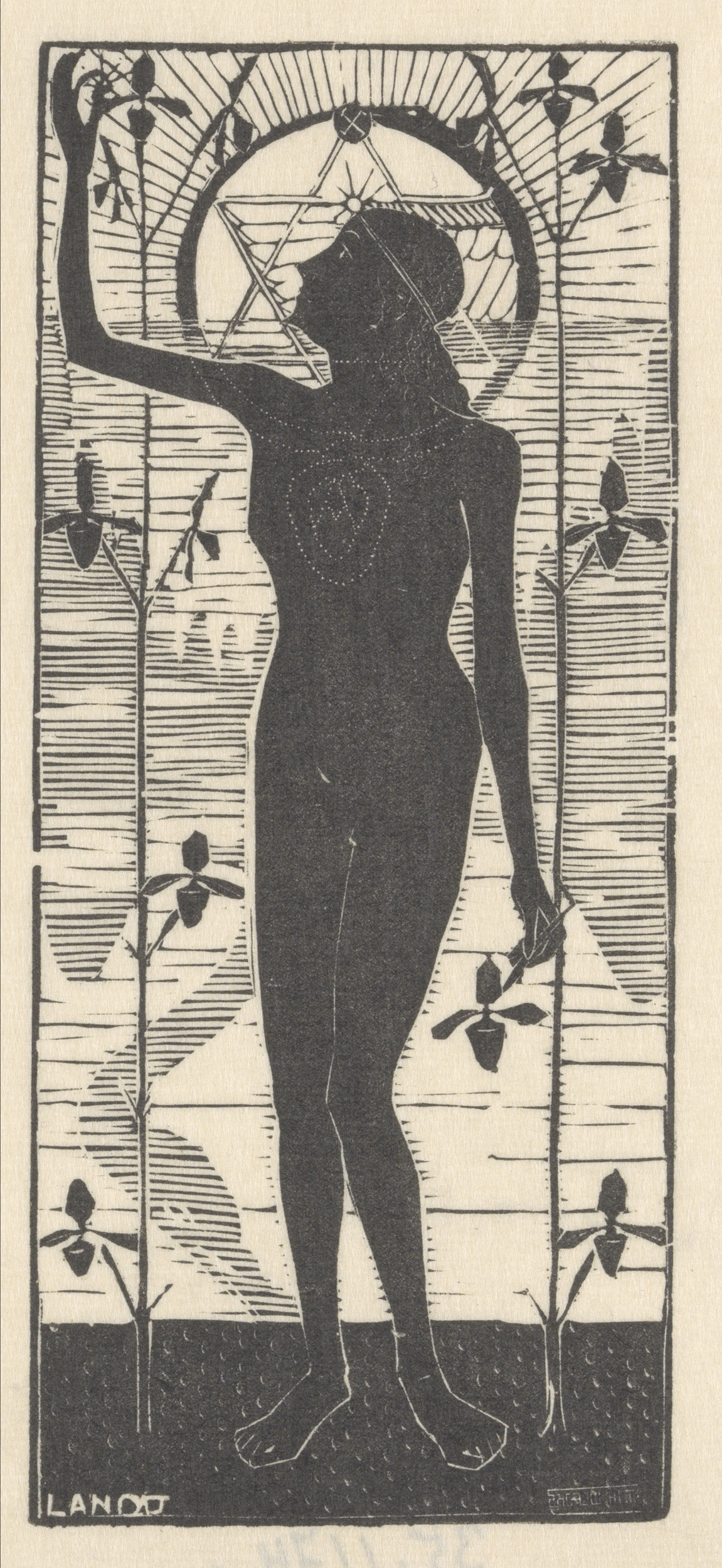 Staande naakte vrouw bij plantenstengels