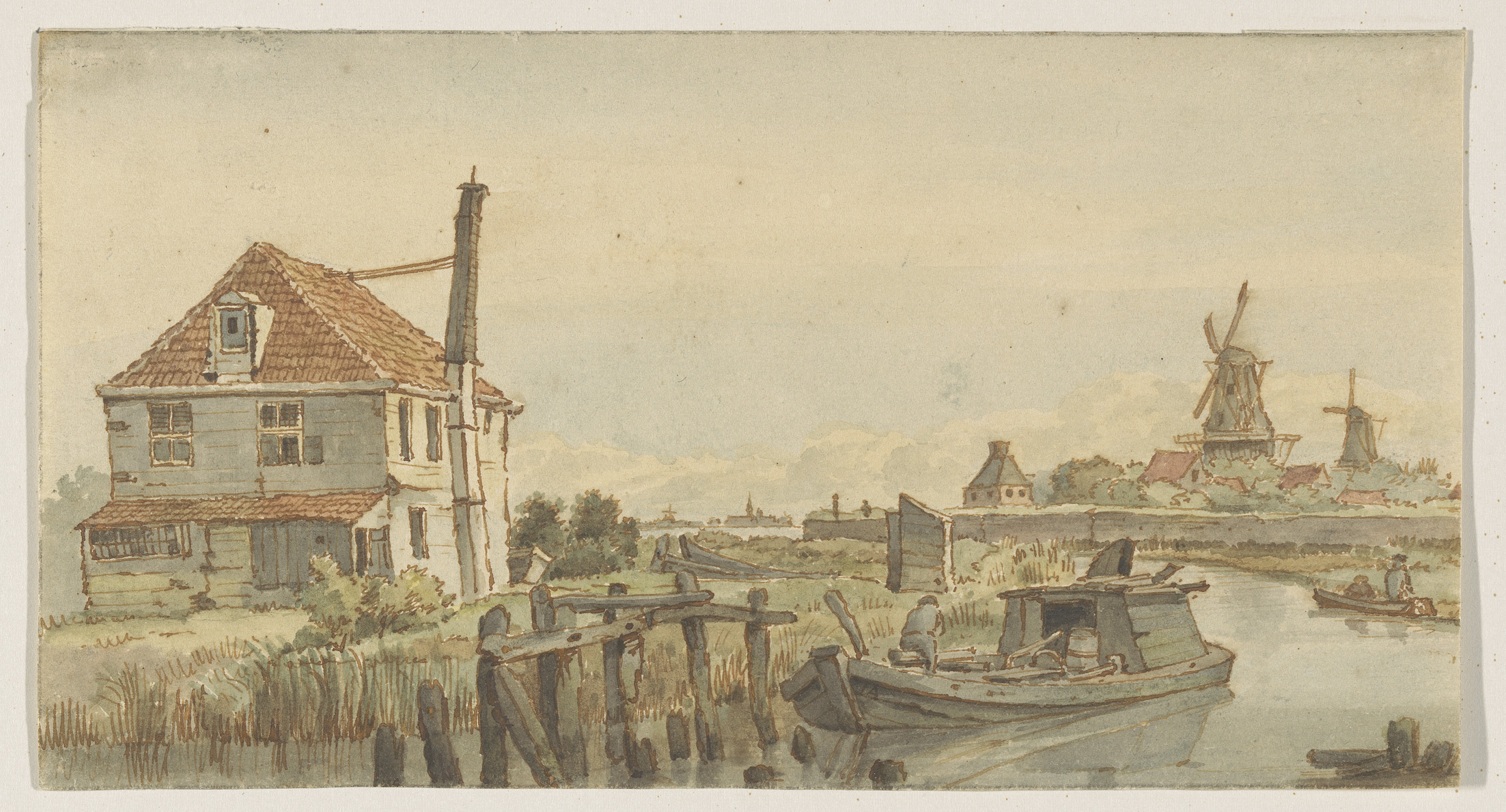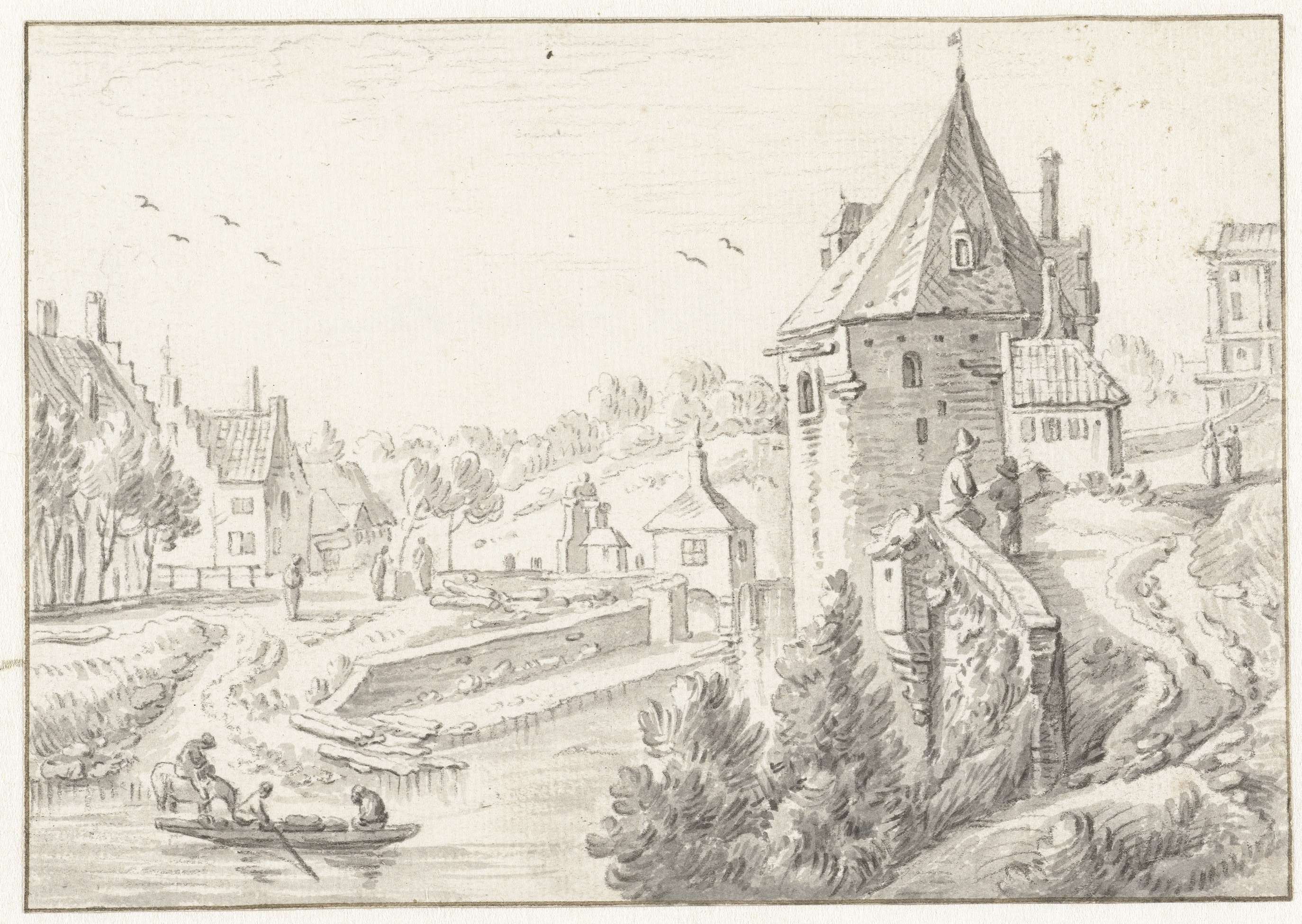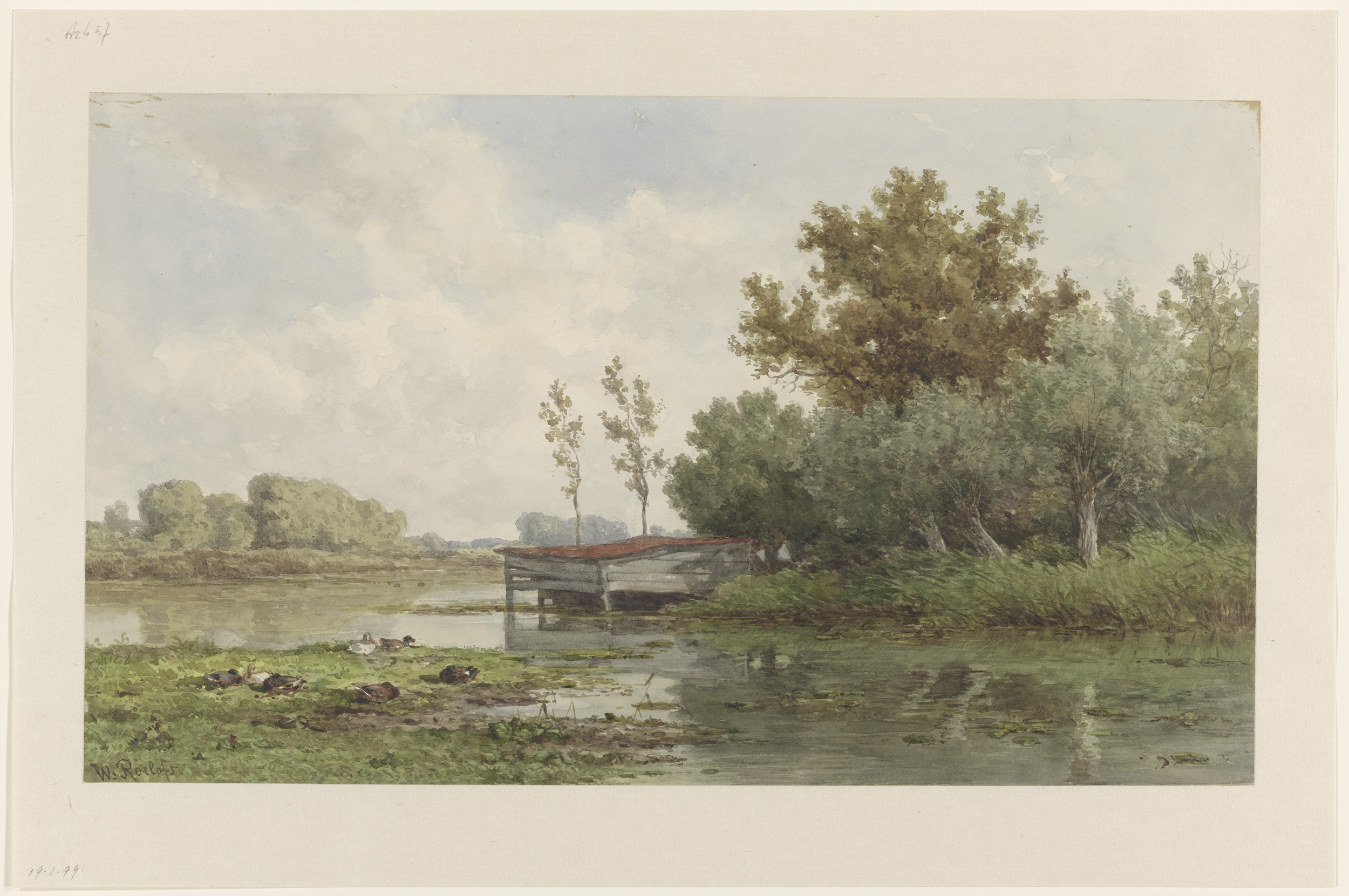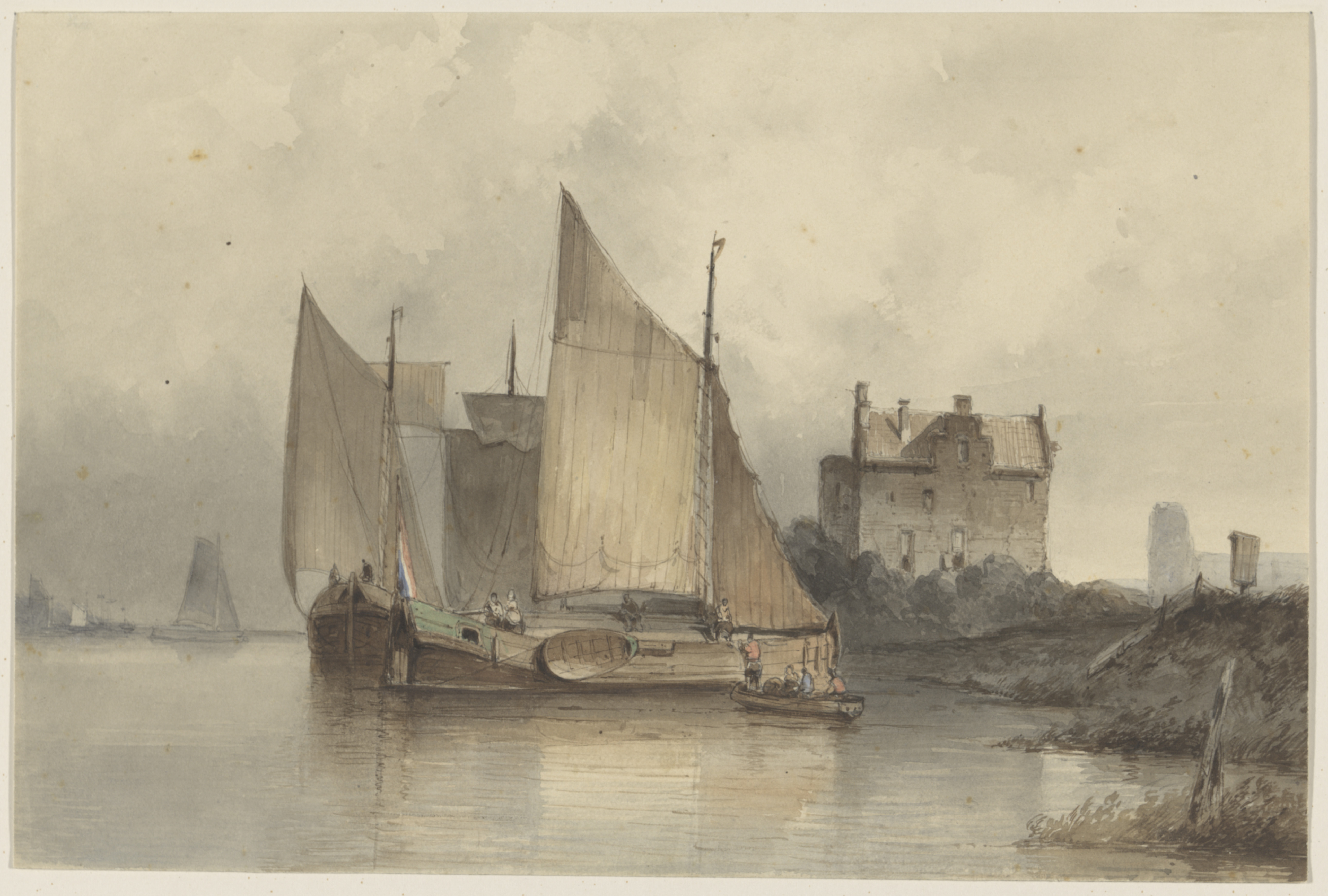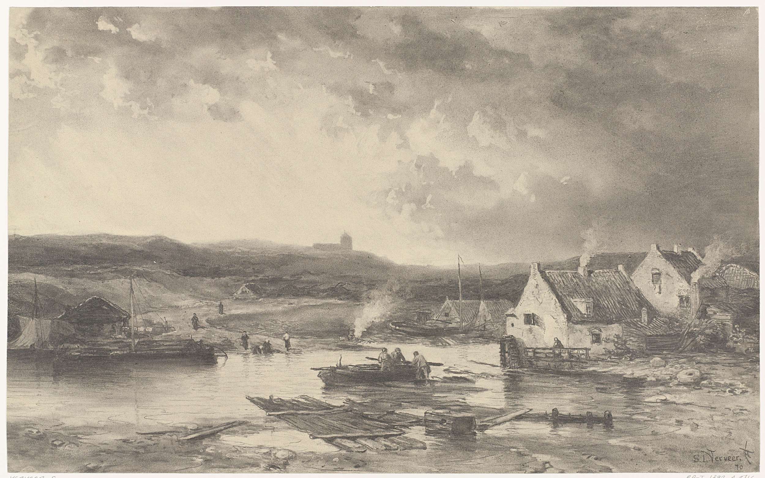 Riviergezicht met enkele schepen, op de achtergrond ...