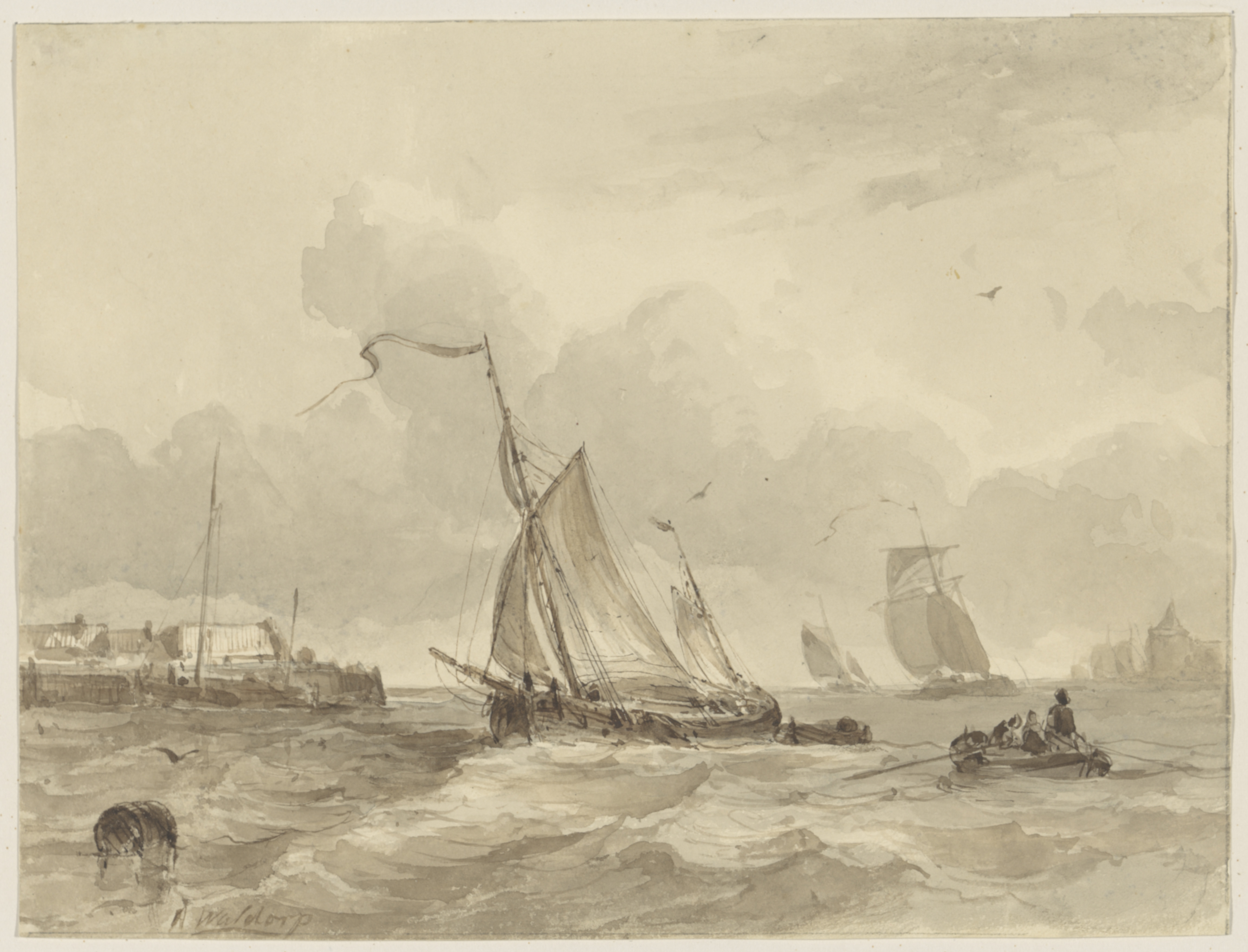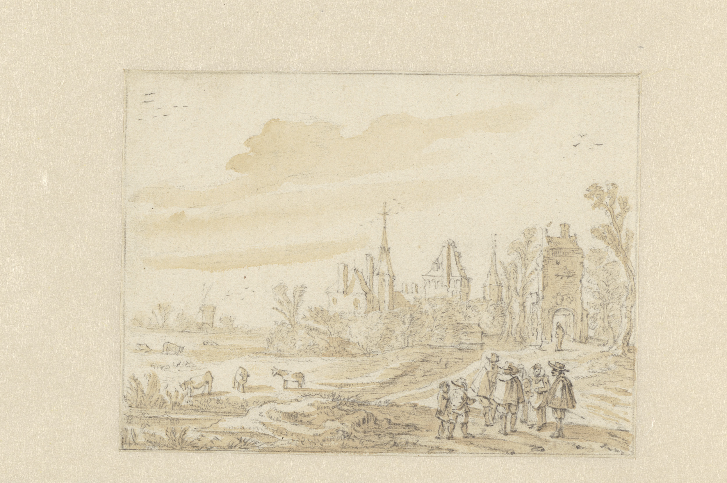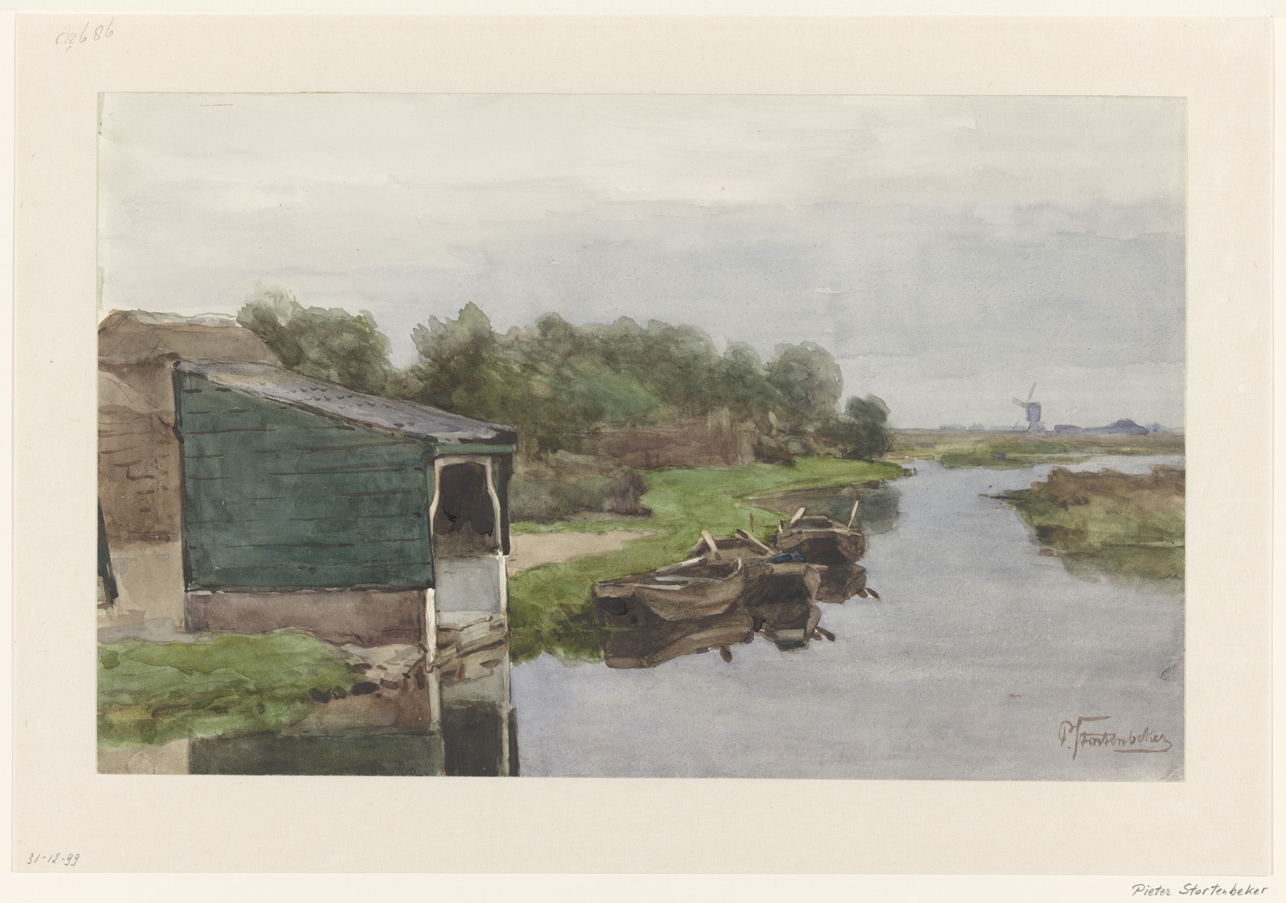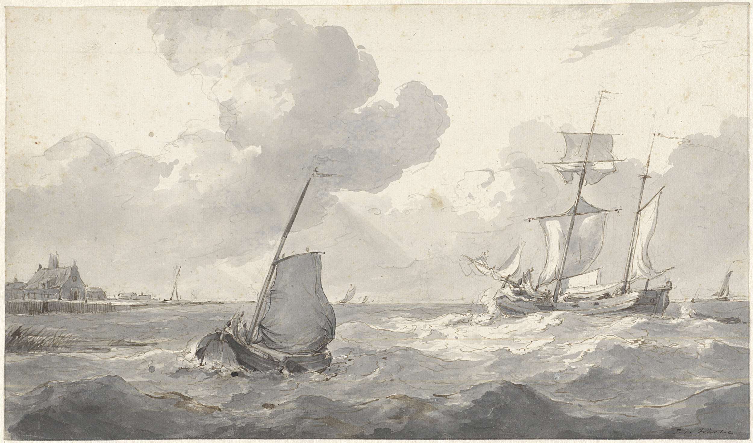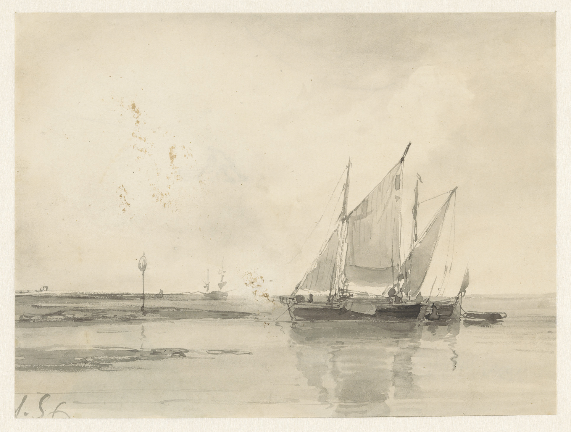 Riviergezicht met enkele schepen, op de achtergrond ...