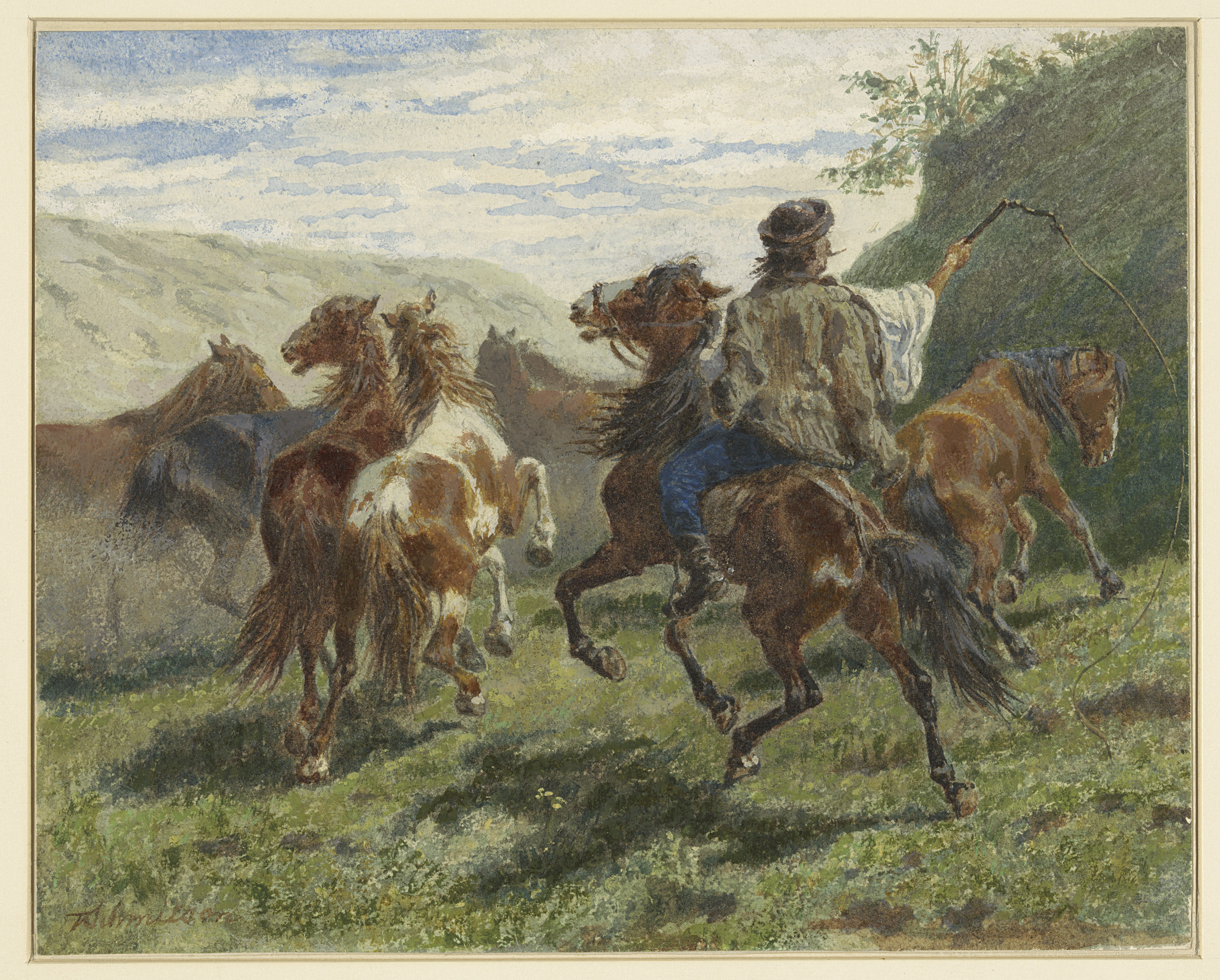 Hongaarse ruiter drijft een aantal paarden naar de a...