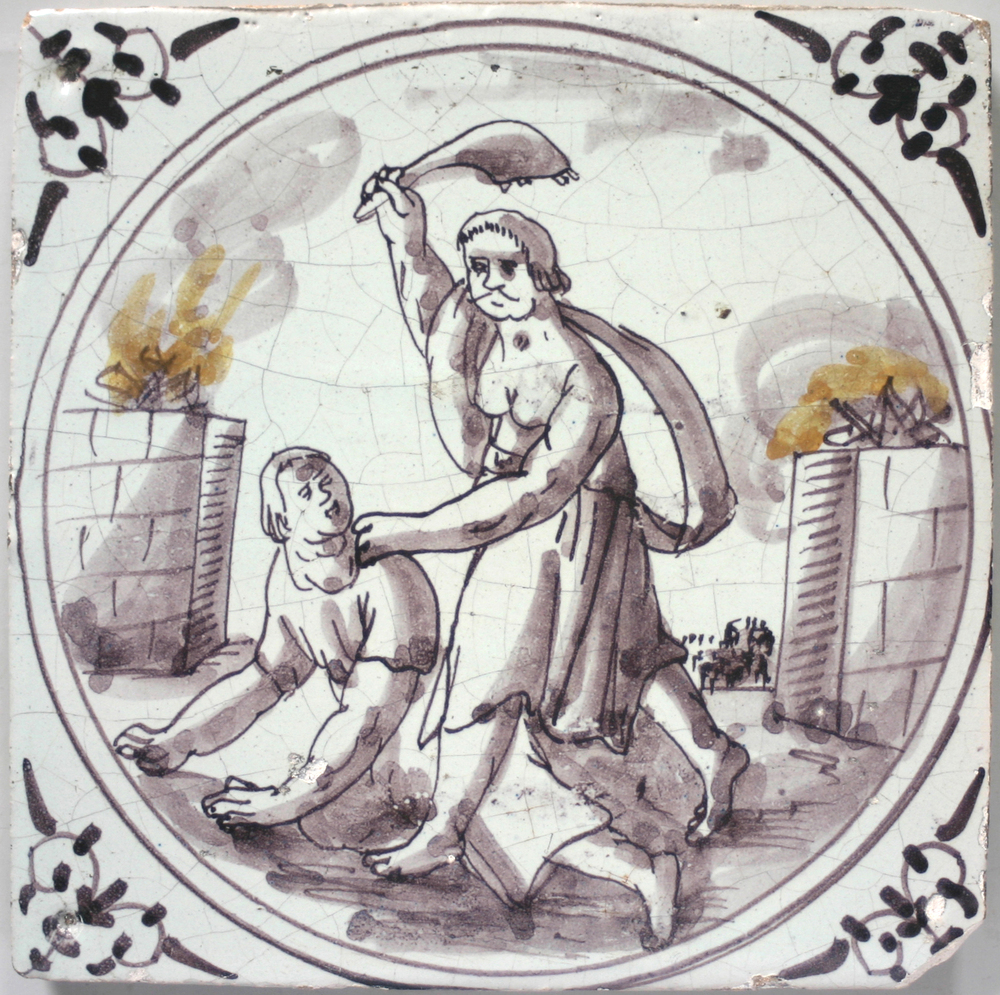 Tegel van keramiek met tinglazuur, voorstellende: Ad...