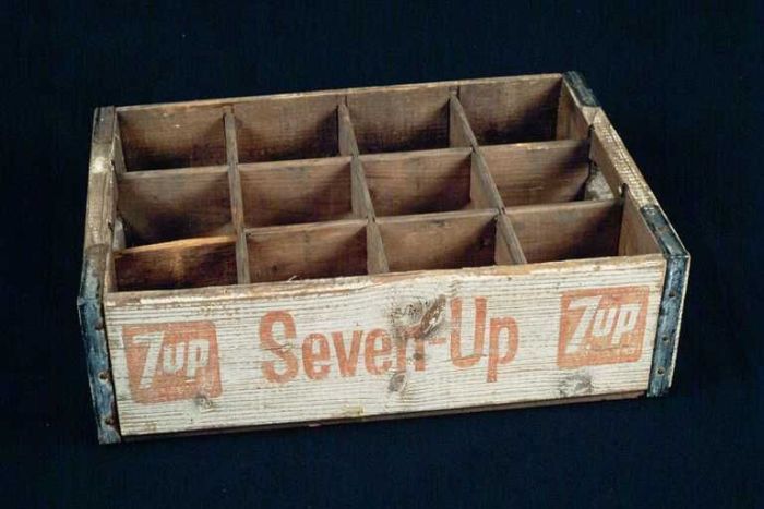 Houten krat met indeling voor twaalf Seven-Up flesjes
