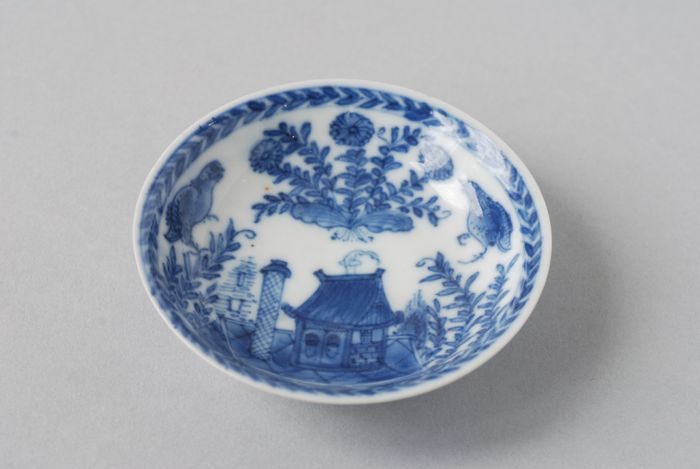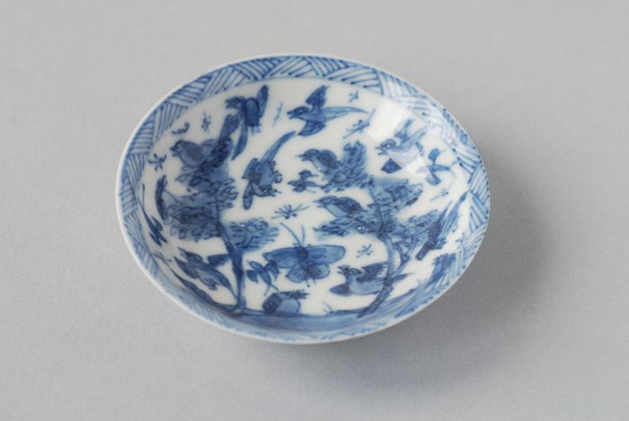 Witte schotel met blauwe bomen en vogels