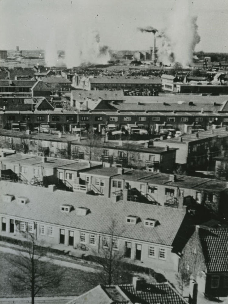 Foto IJmuiden tijdens bombardements aanval. tekst: "...