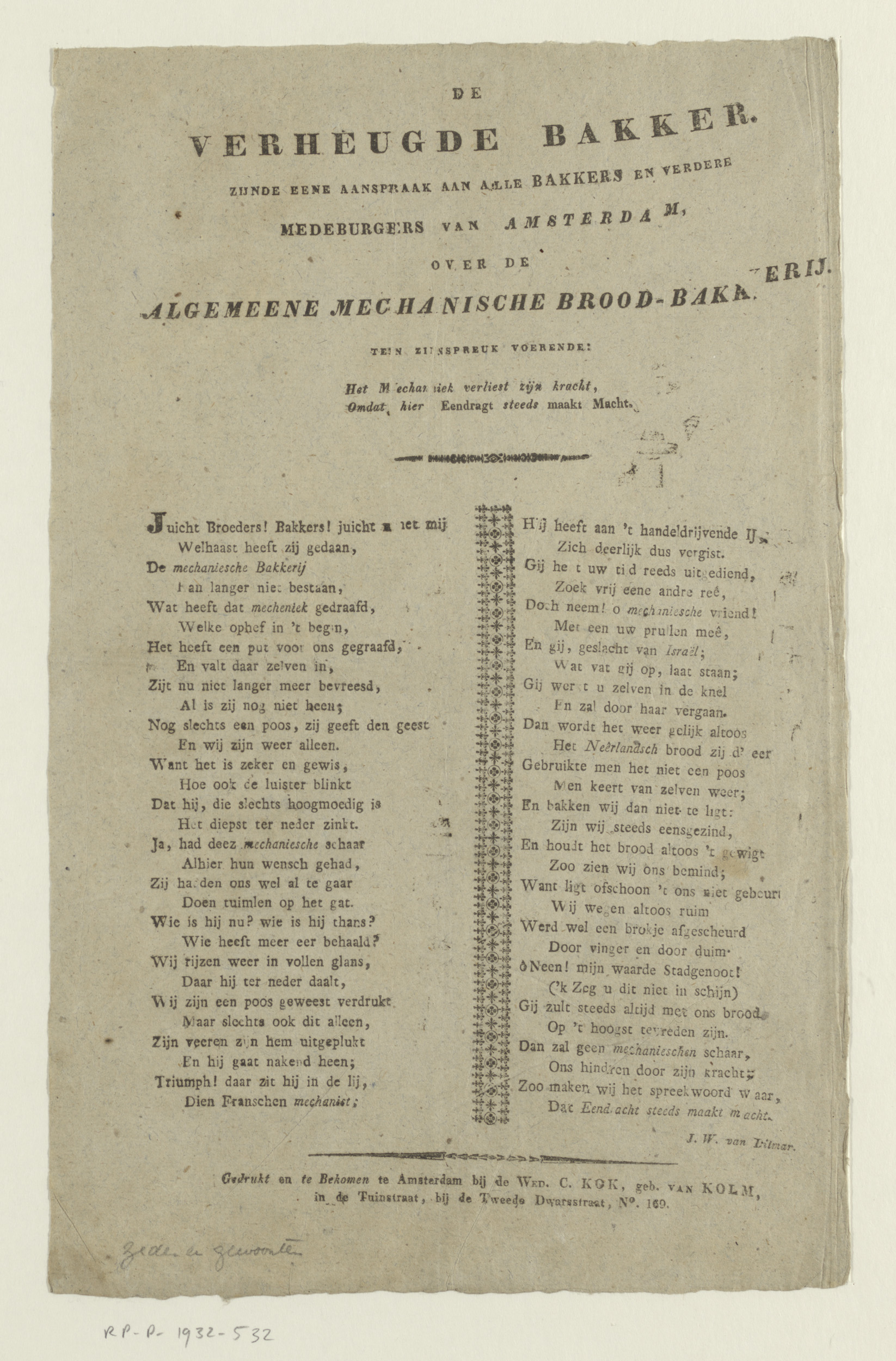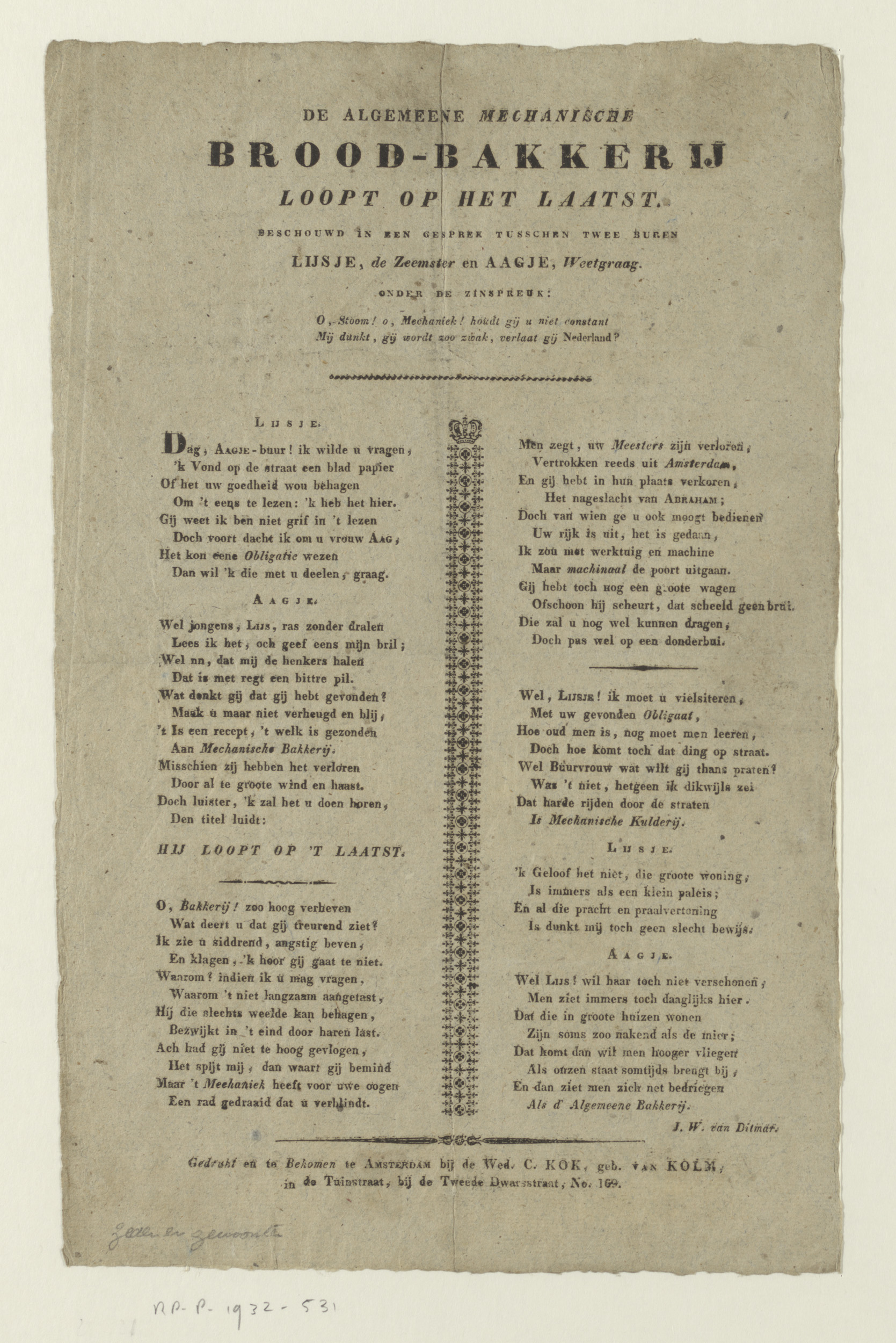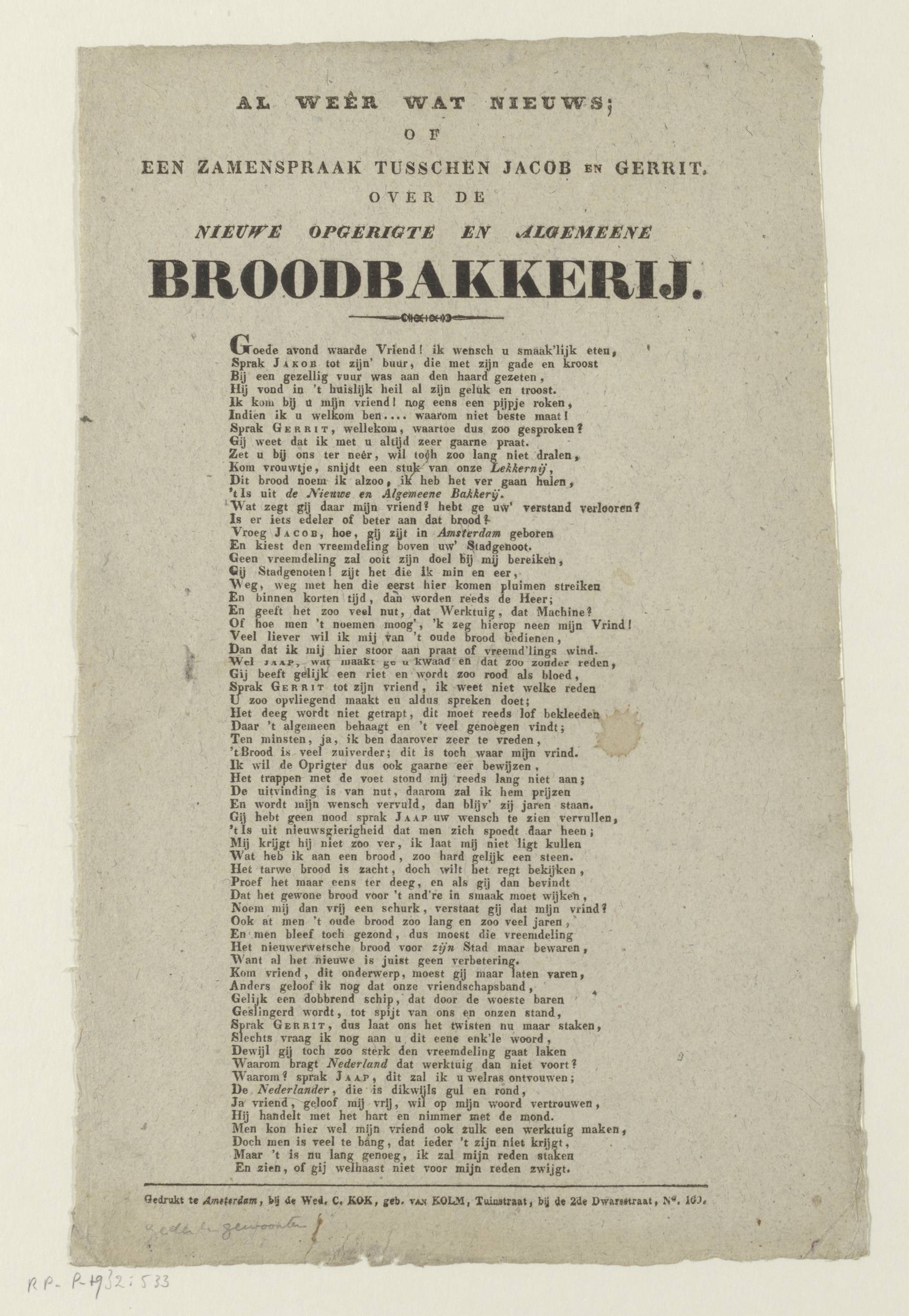 Gedicht over de Algemeene Mechanische Broodbakkerij