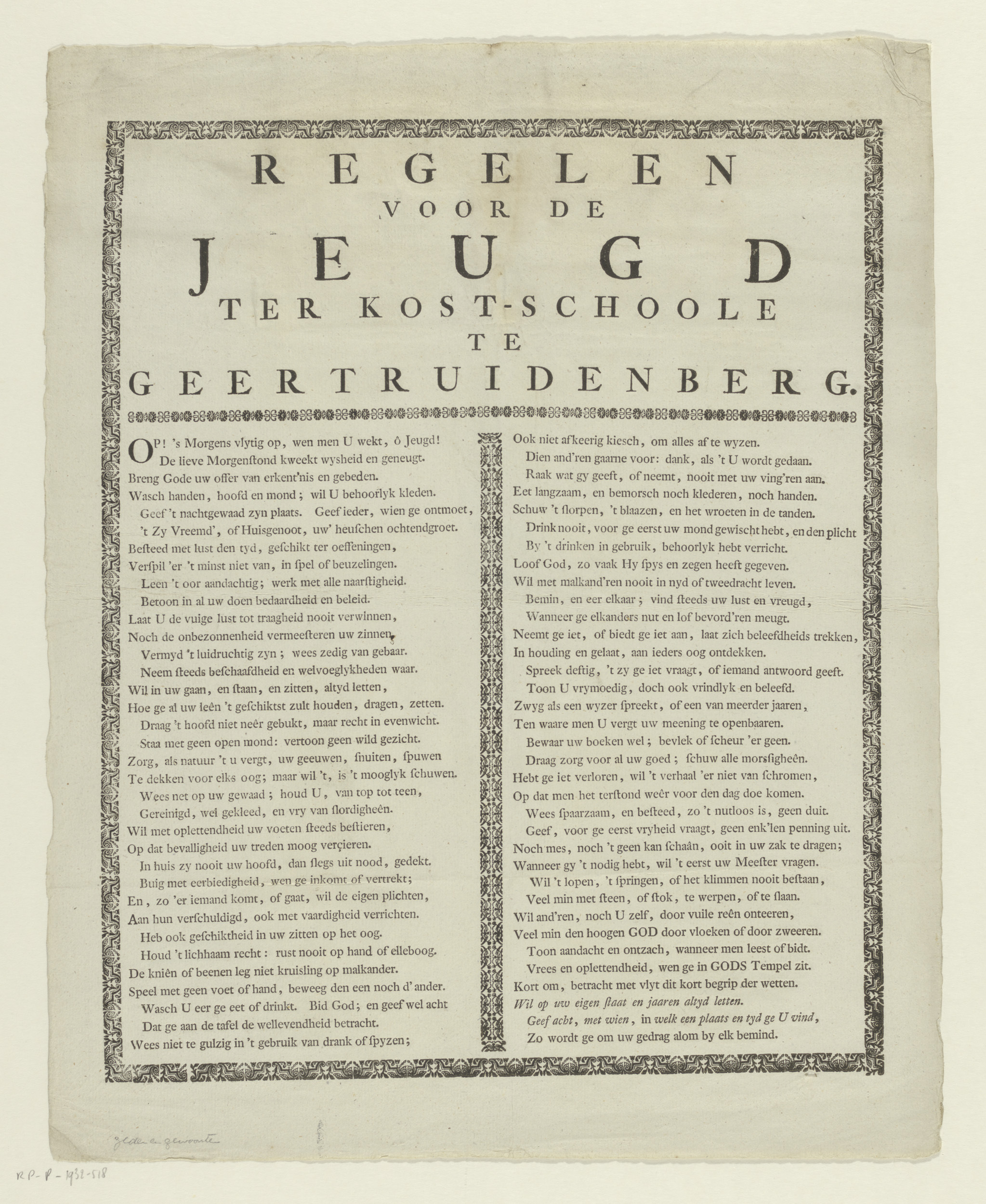 Tekstblad met regels voor jongeren op de Kostschool ...