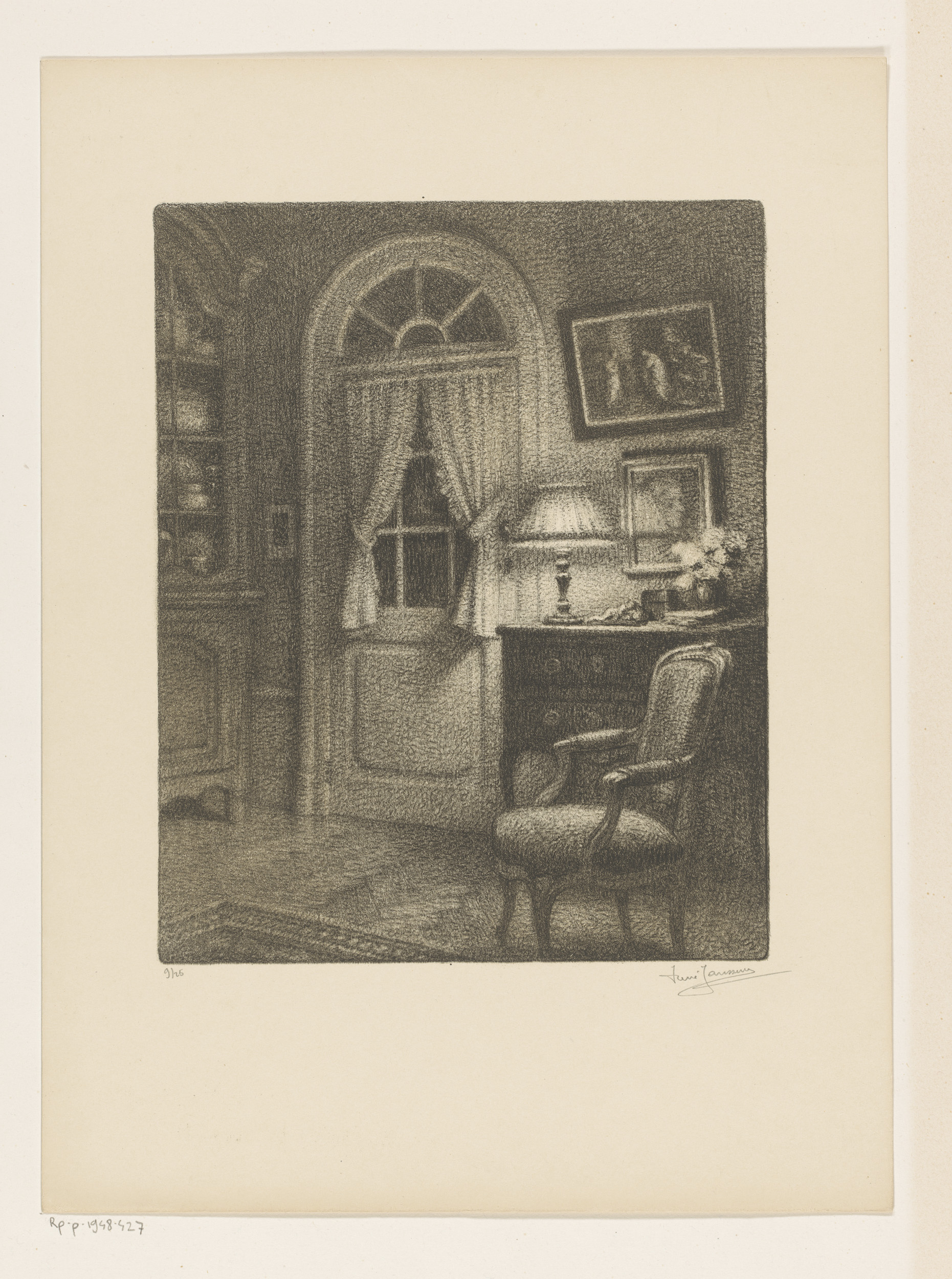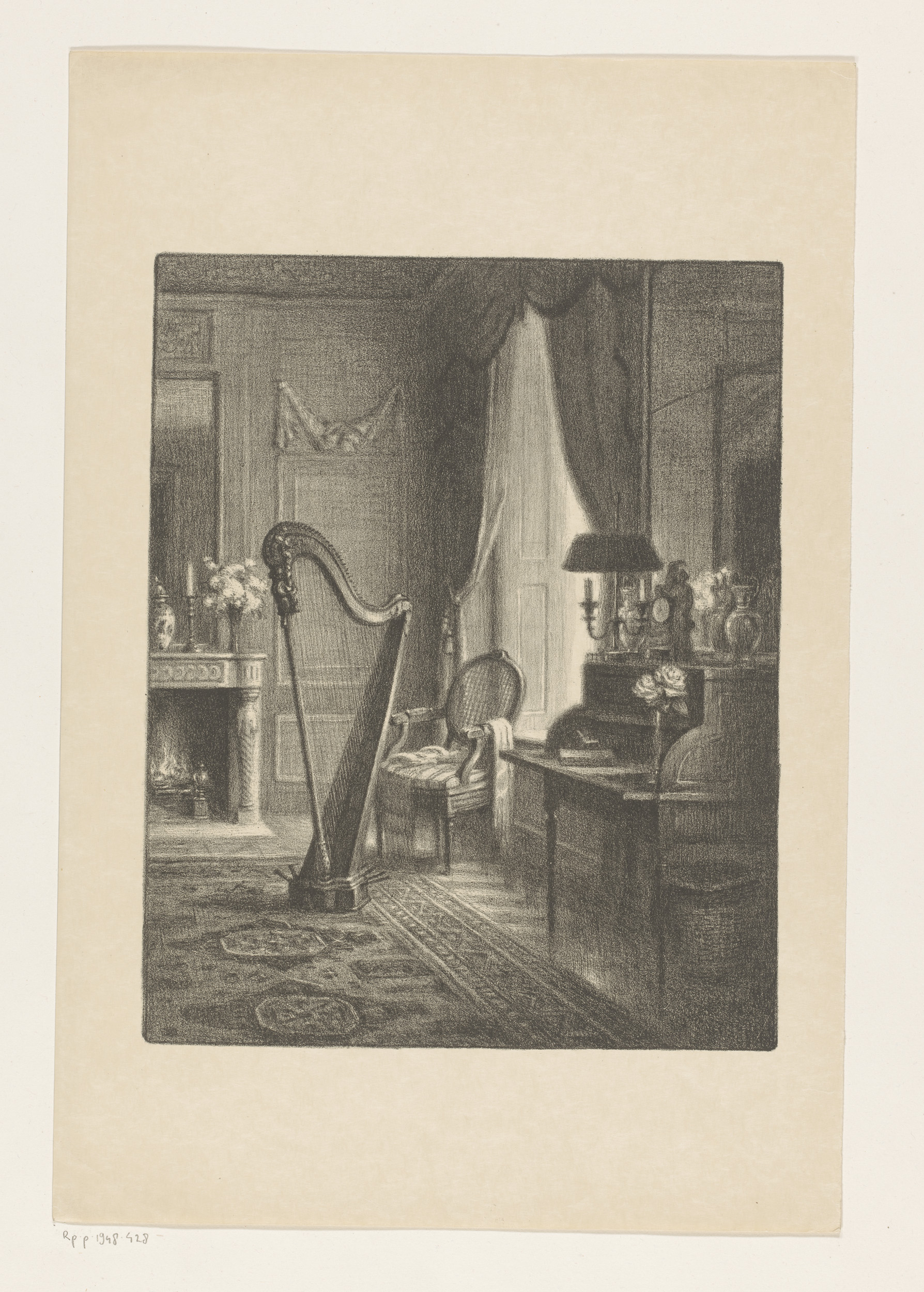 Interieur met haard, secretaire en harp