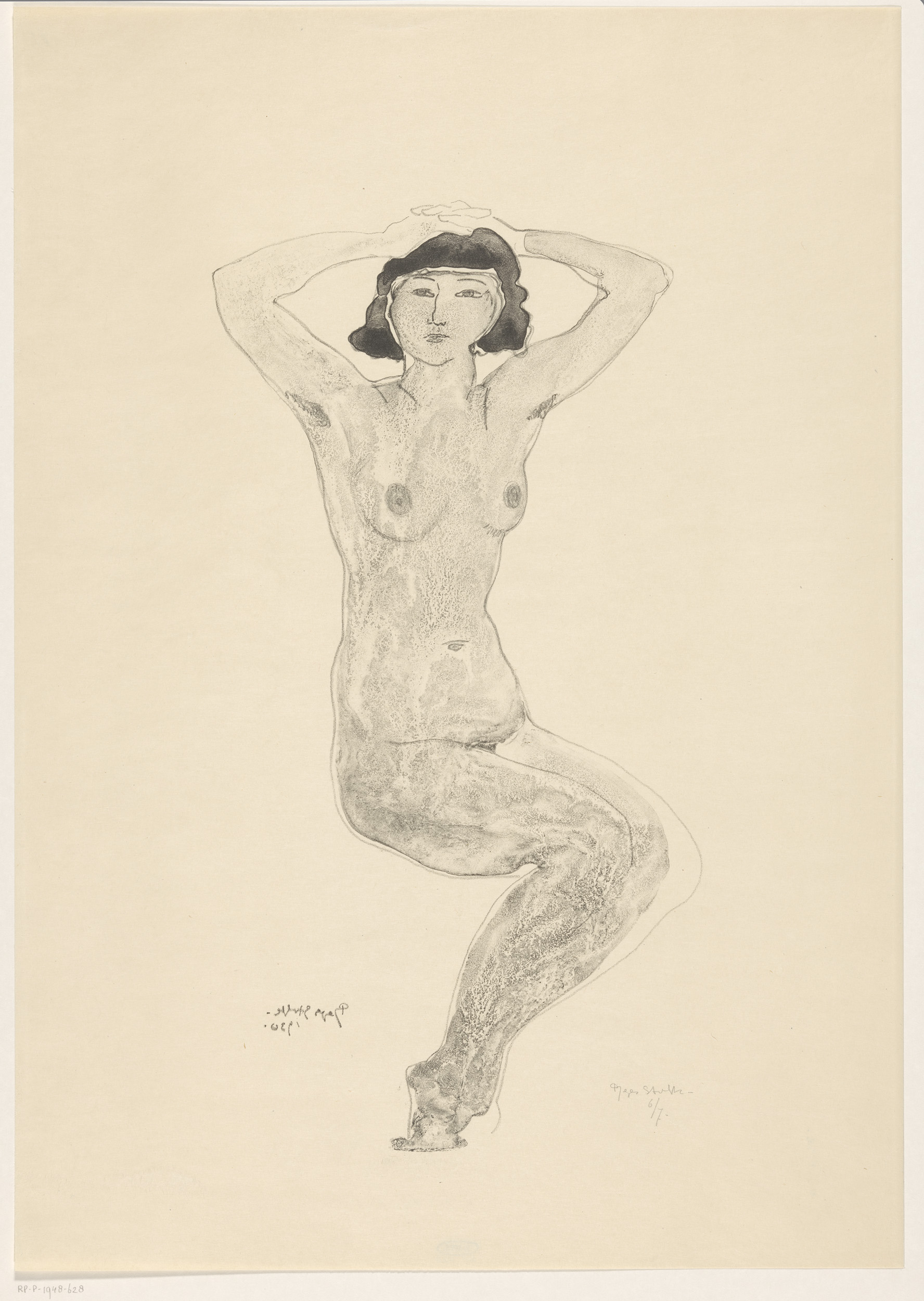 Zittende naakte vrouw met handen op het hoofd