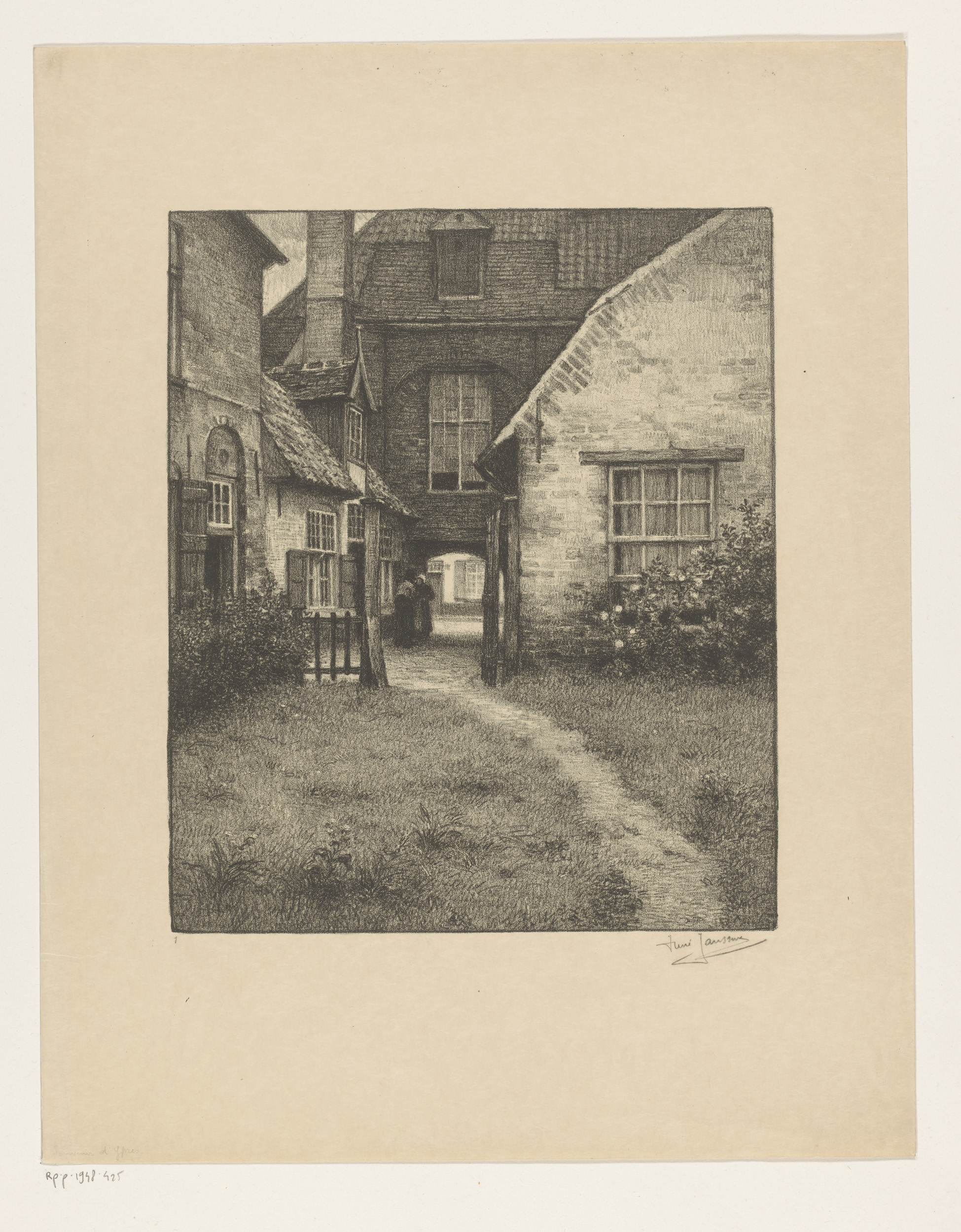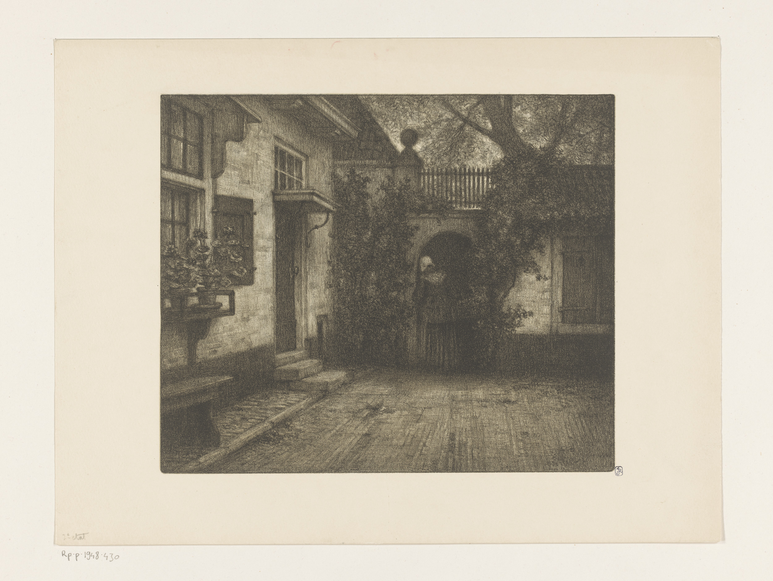 Plein voor een huis met een vrouw bij een poort, in ...