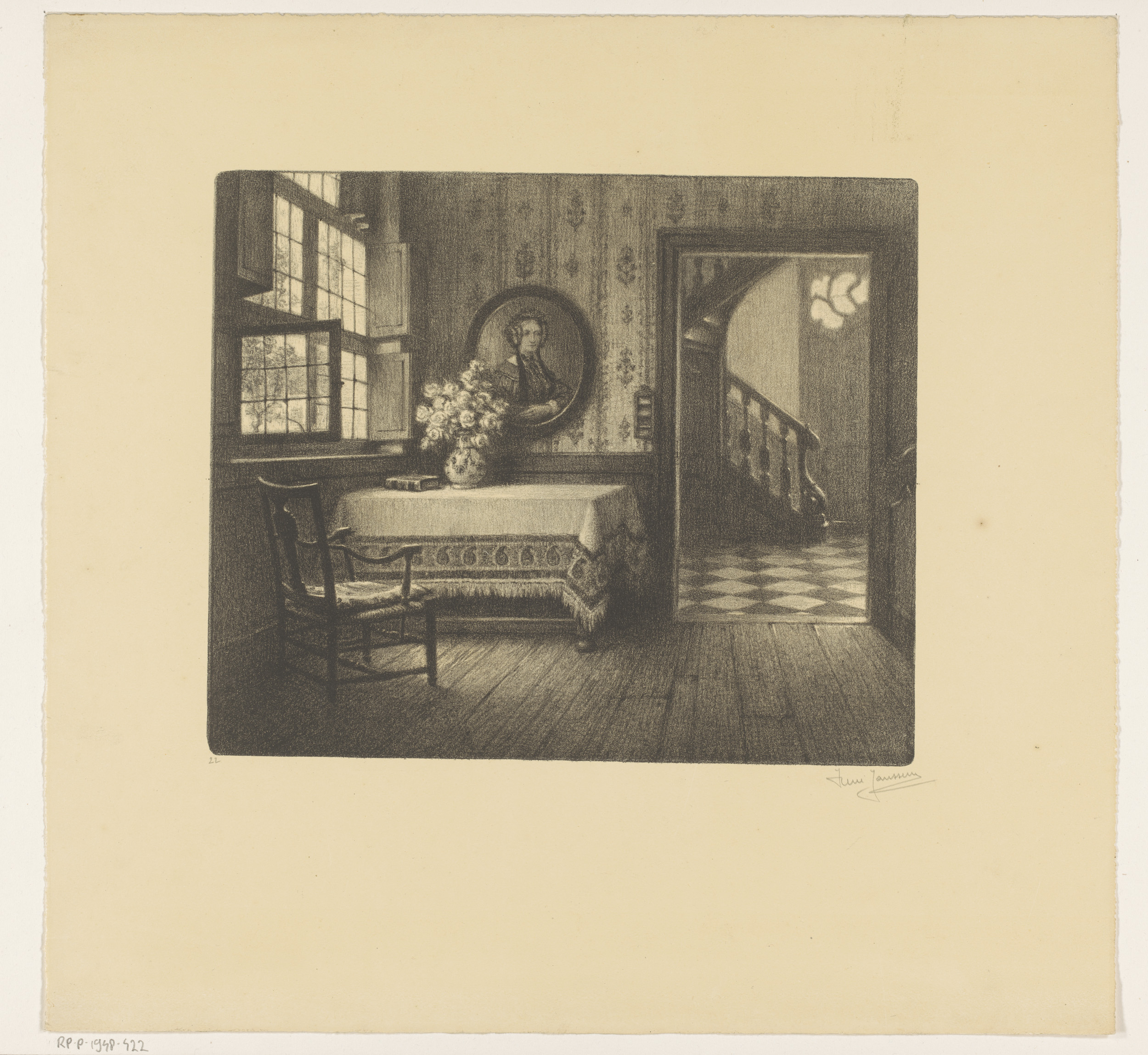 Interieur met portret, tafel en doorkijk op een gang