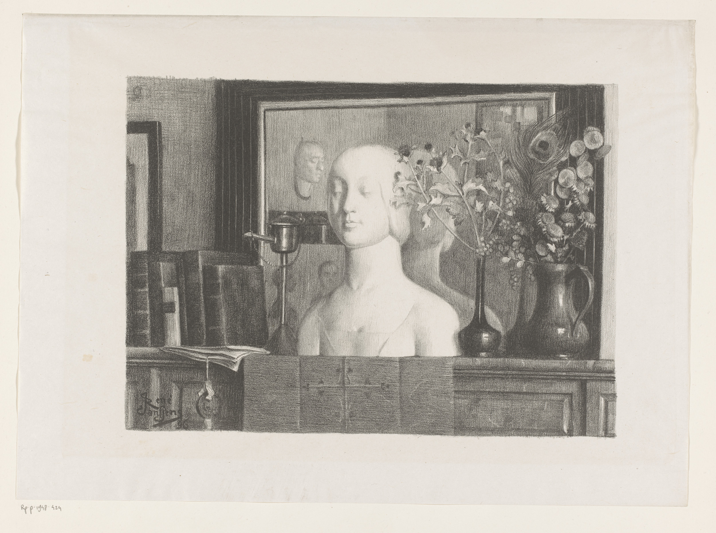 Stilleven van een schoorsteenmantel met een beeld, v...