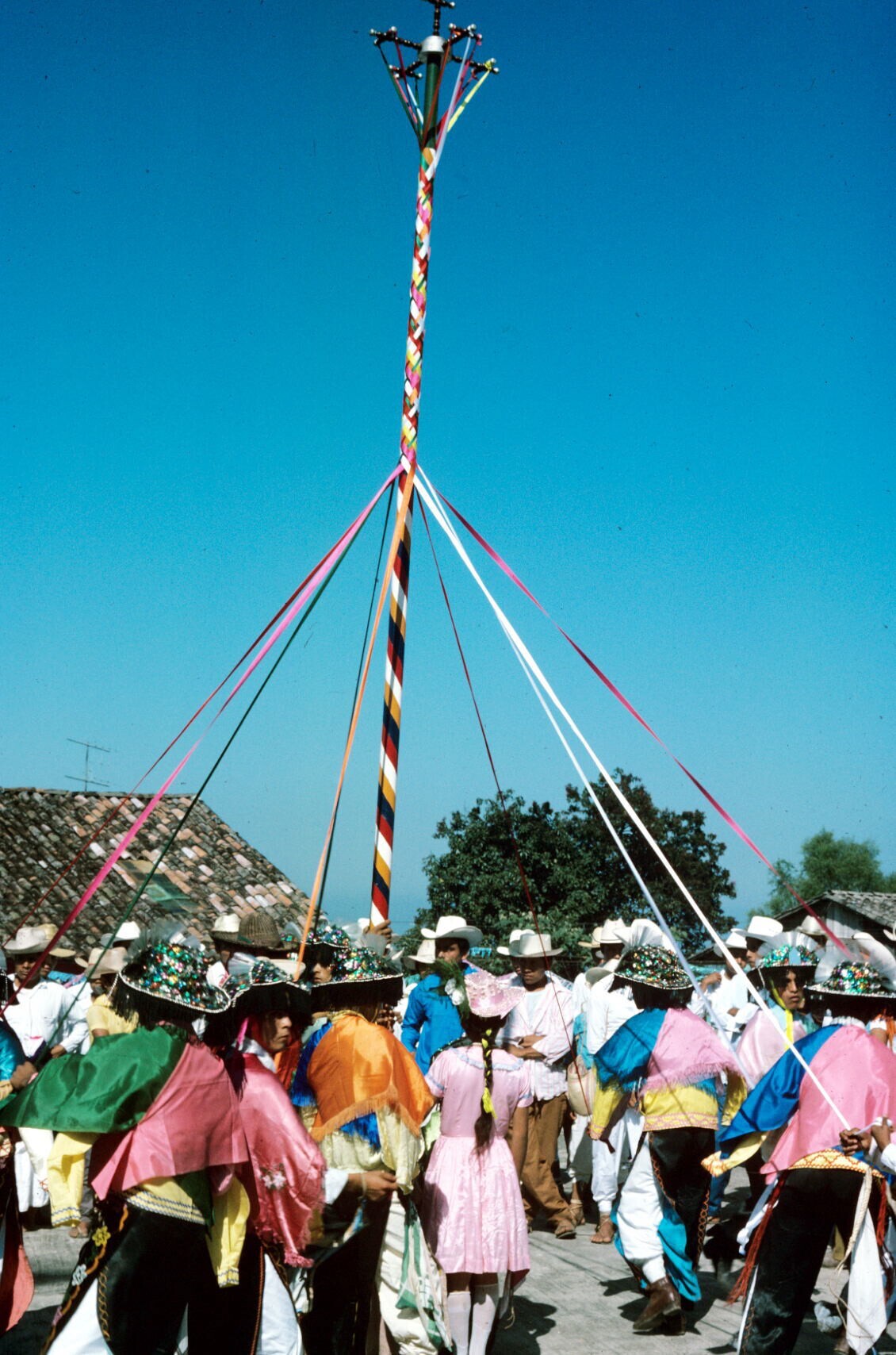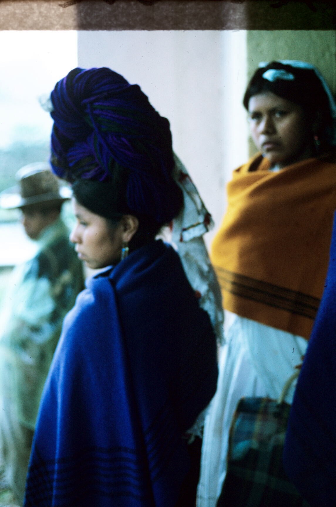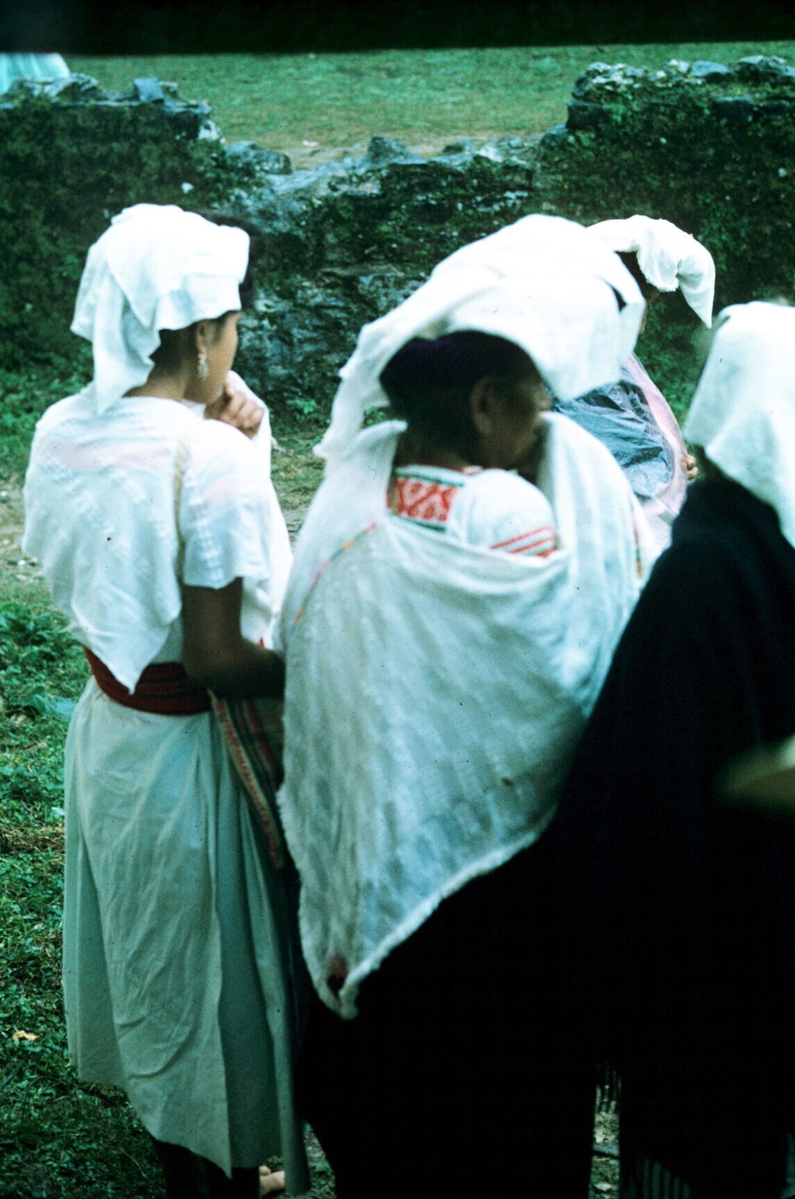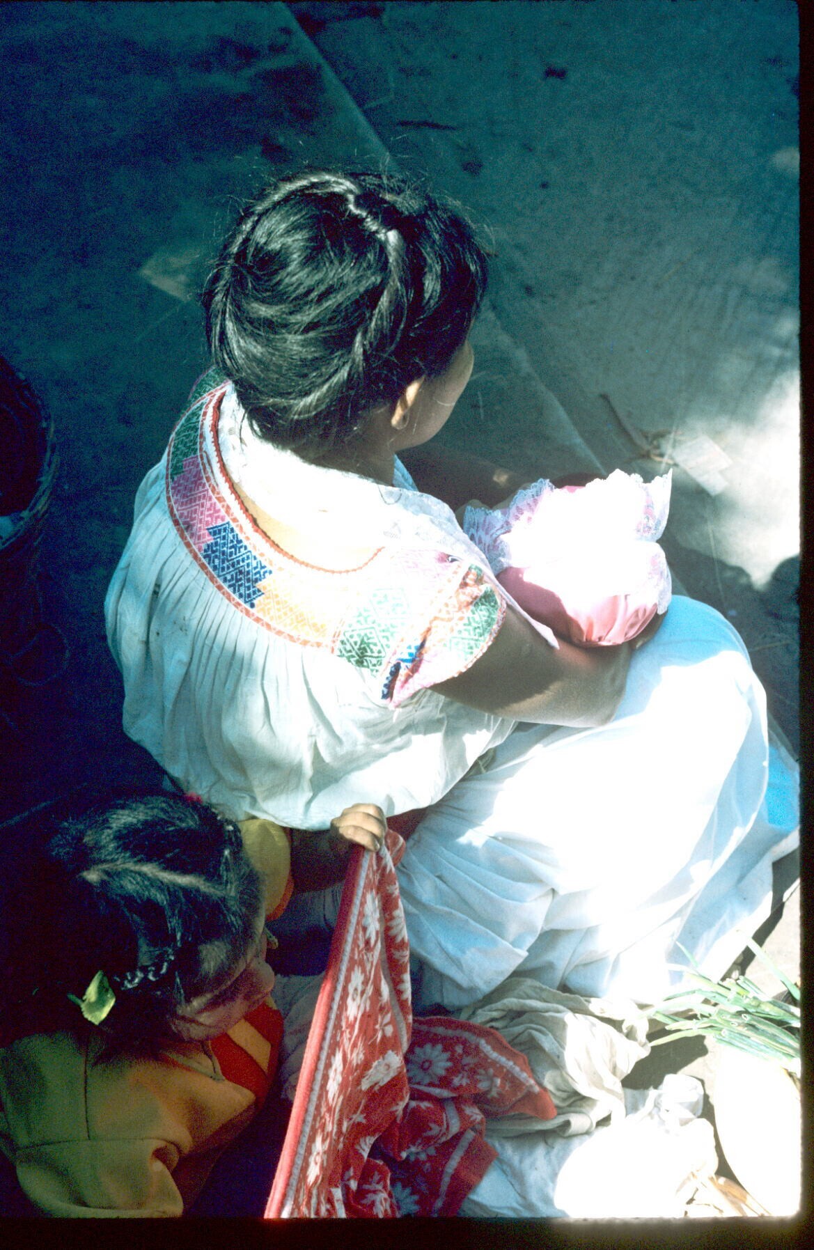 zittende vrouw met maxtahual met huipil, op rug gezien