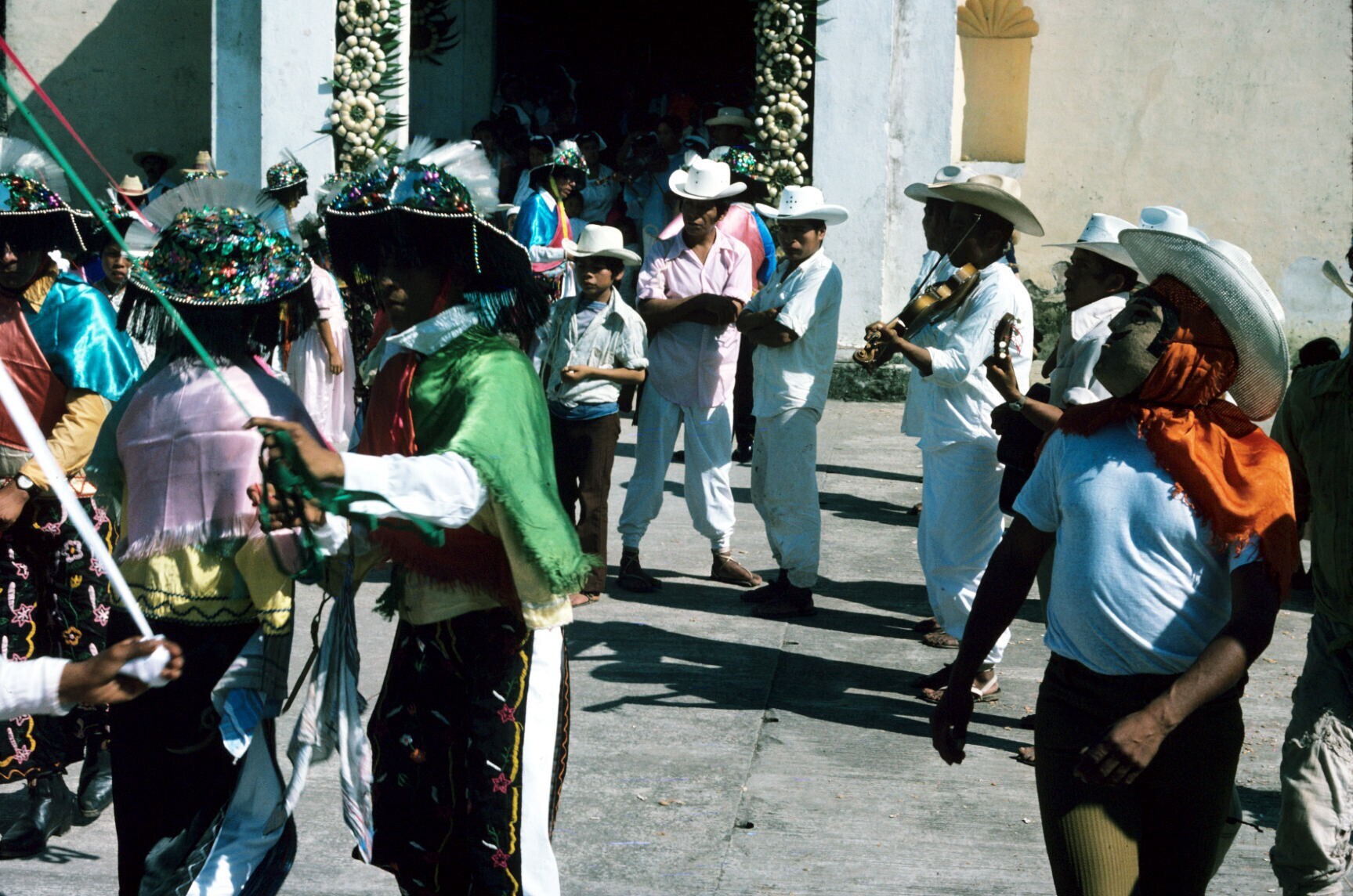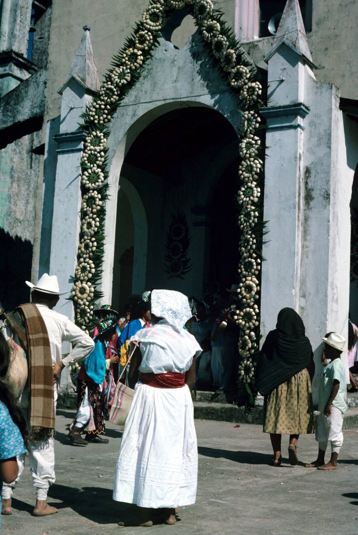 Negritos en publiek bij ingang kerk