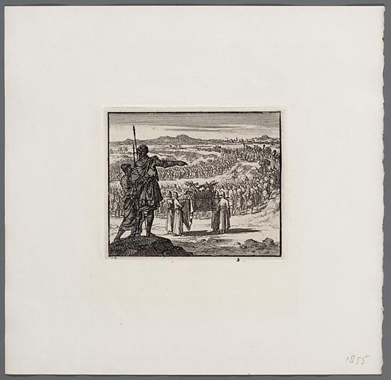 De Israëlieten trekken door de droge Jordaan waarin ...