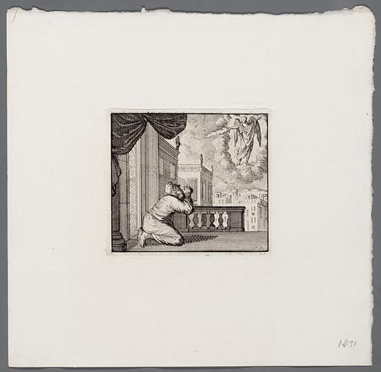 Manoach en zijn vrouw knielen bij het altaar waarbov...