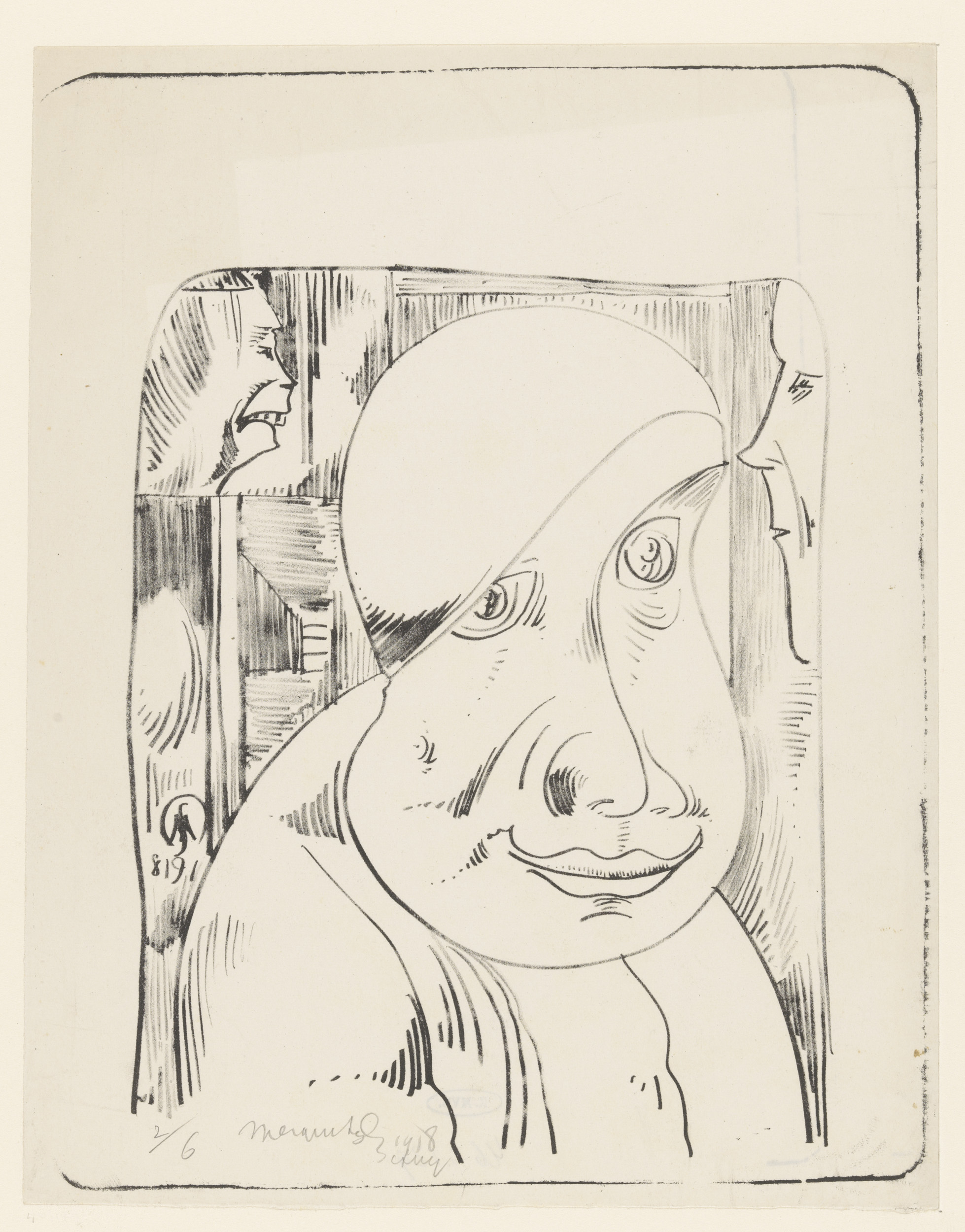 Fantasie: mannenkop met scheve muts, half over het r...