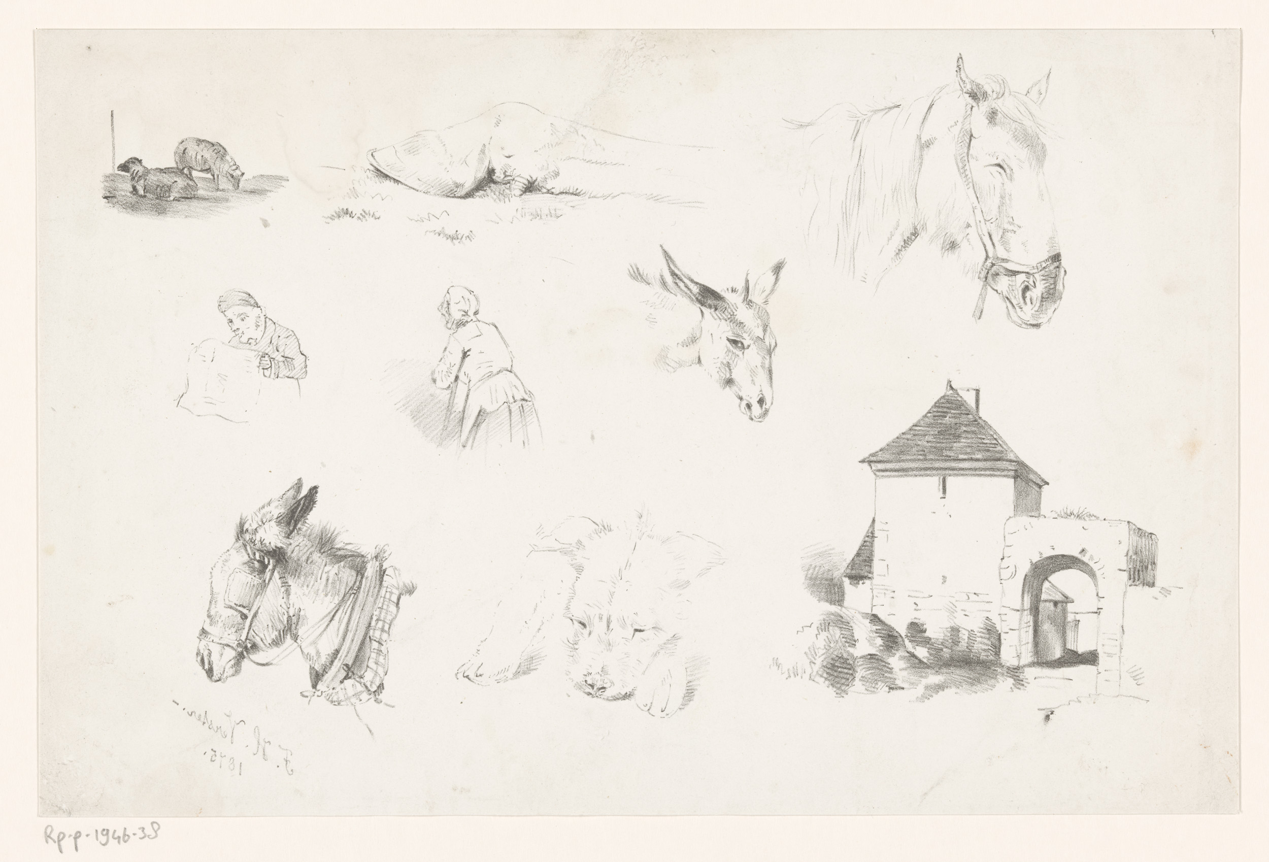 Studies van dieren, figuren en een huis met poort