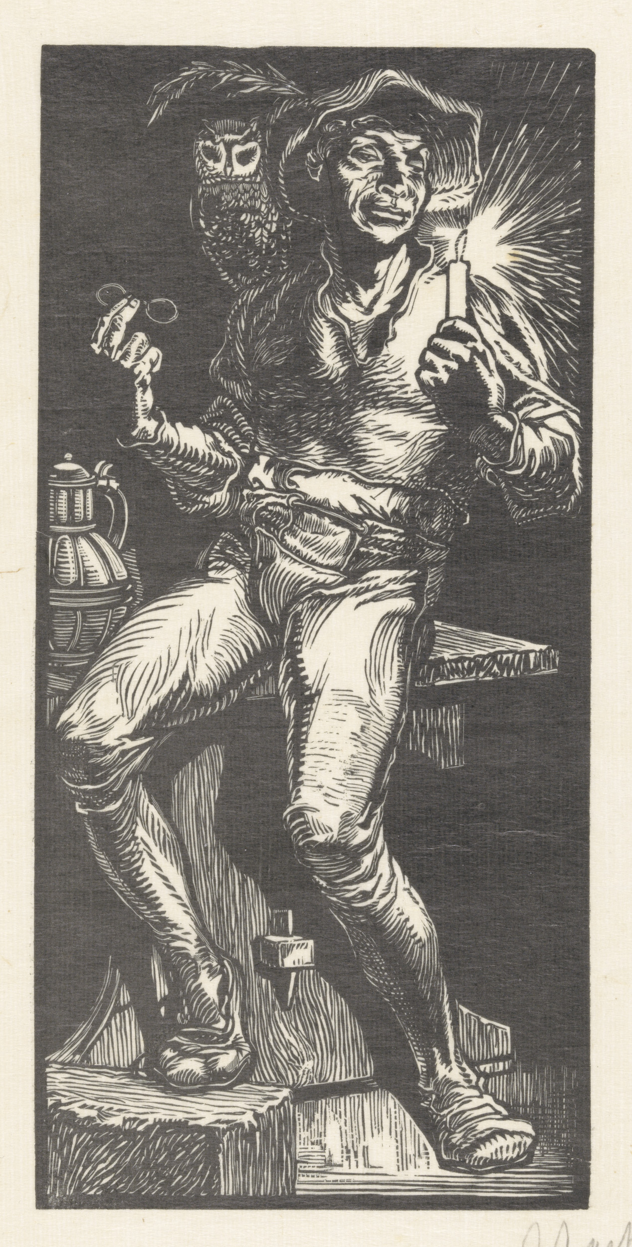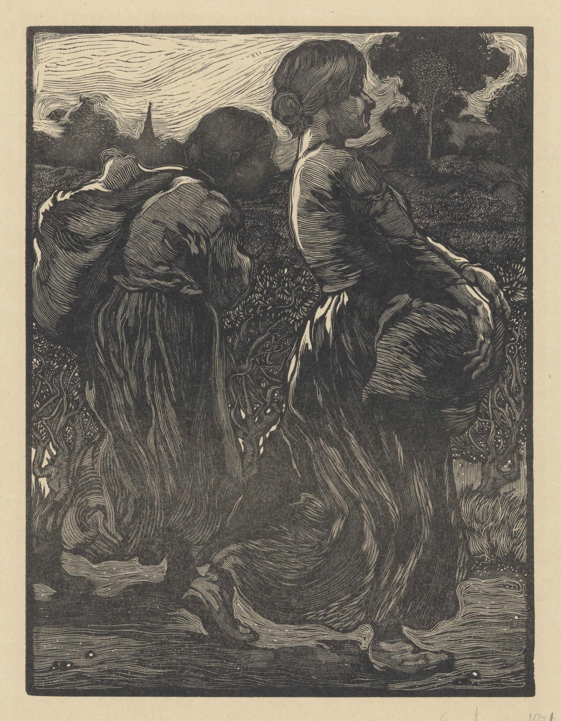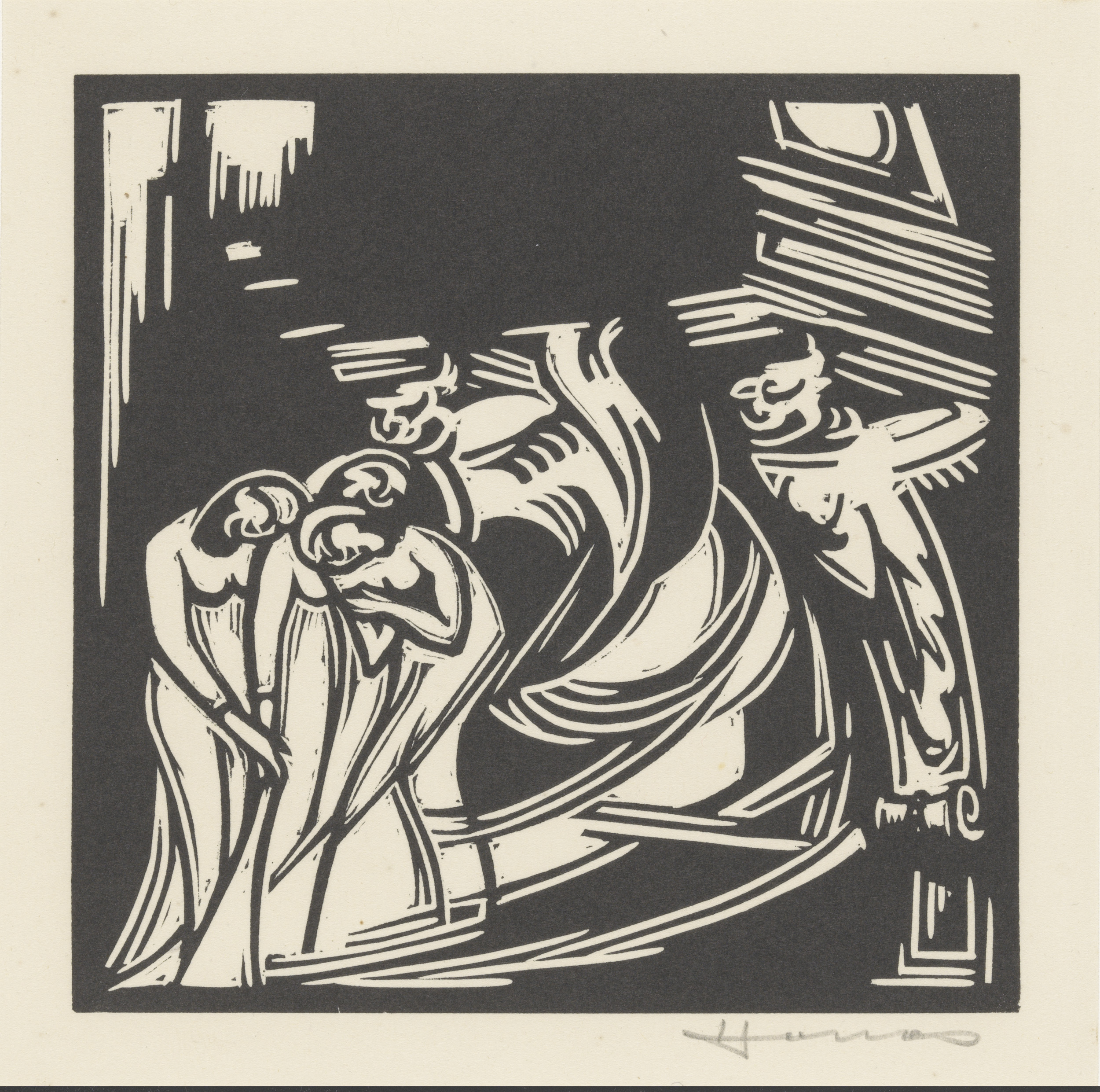 Twee fantasiefiguren bij drie vrouwen