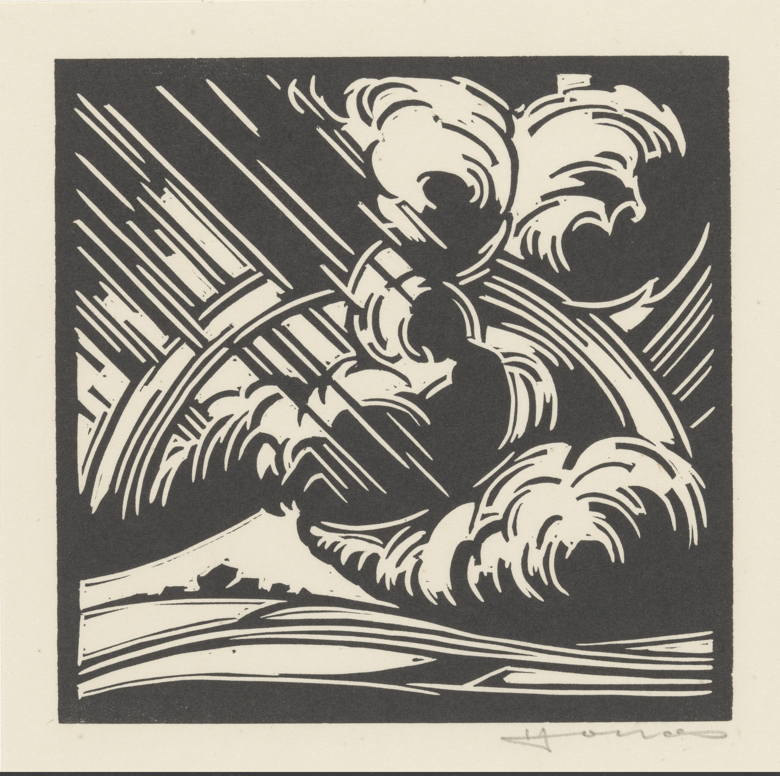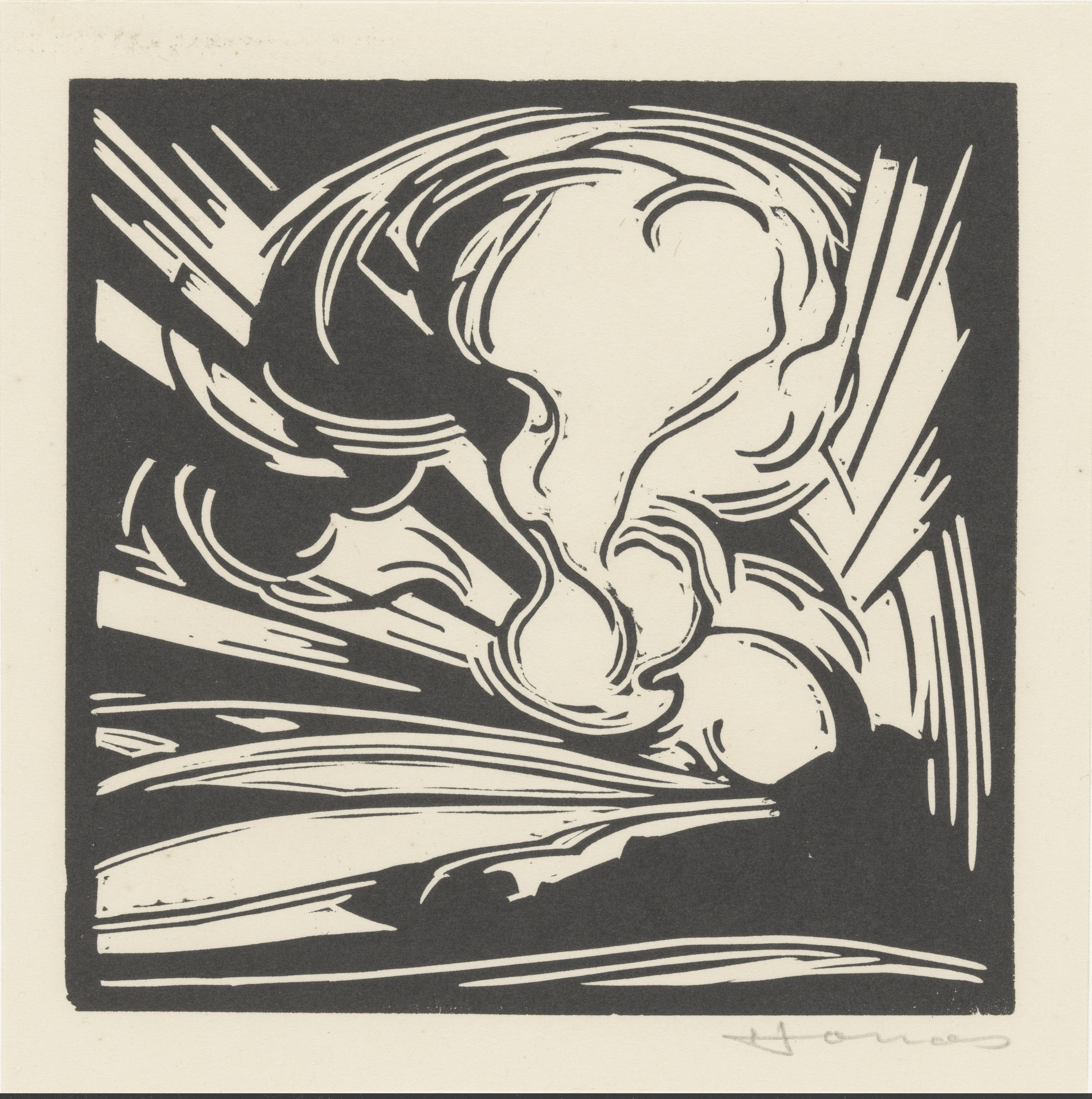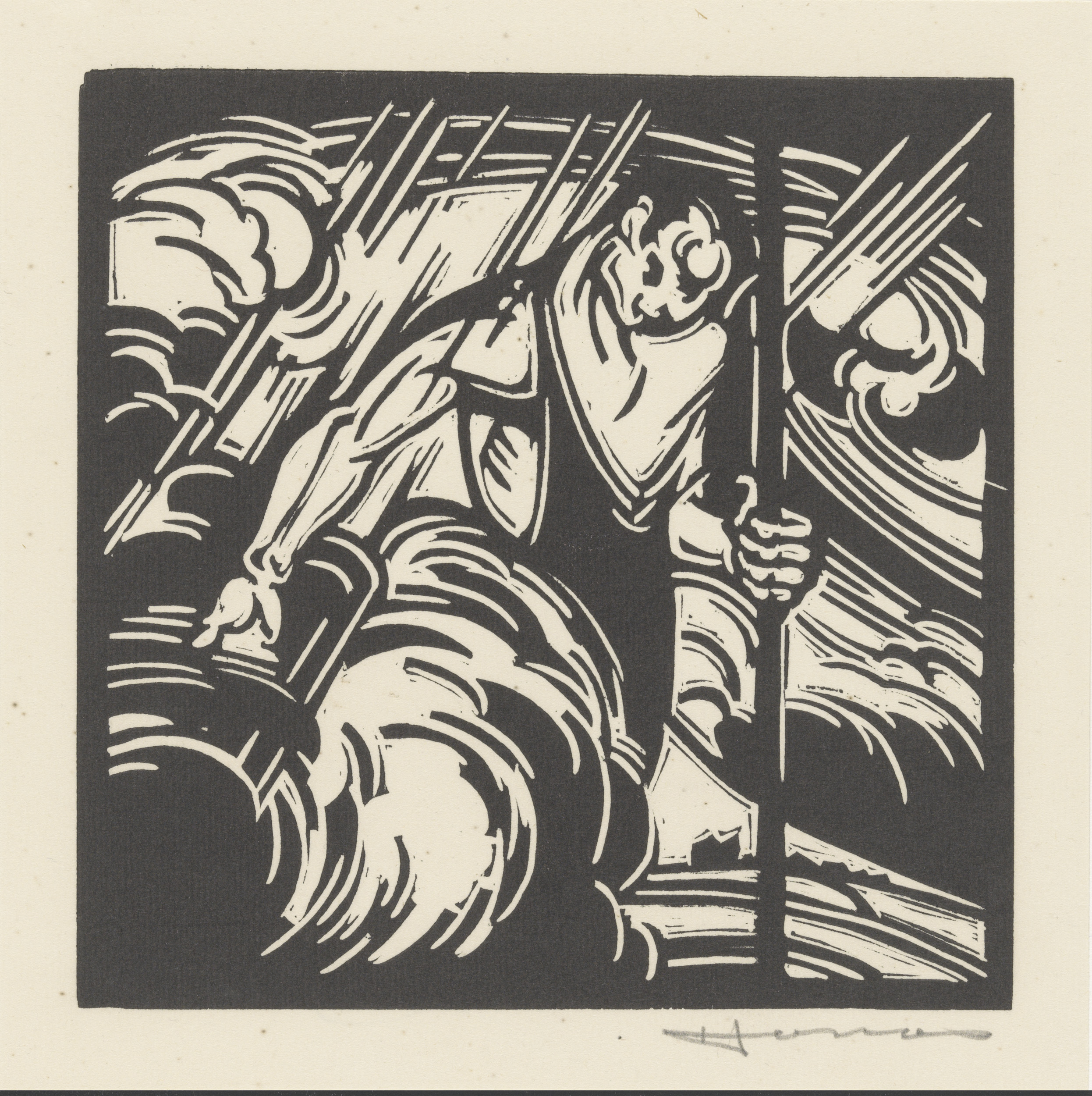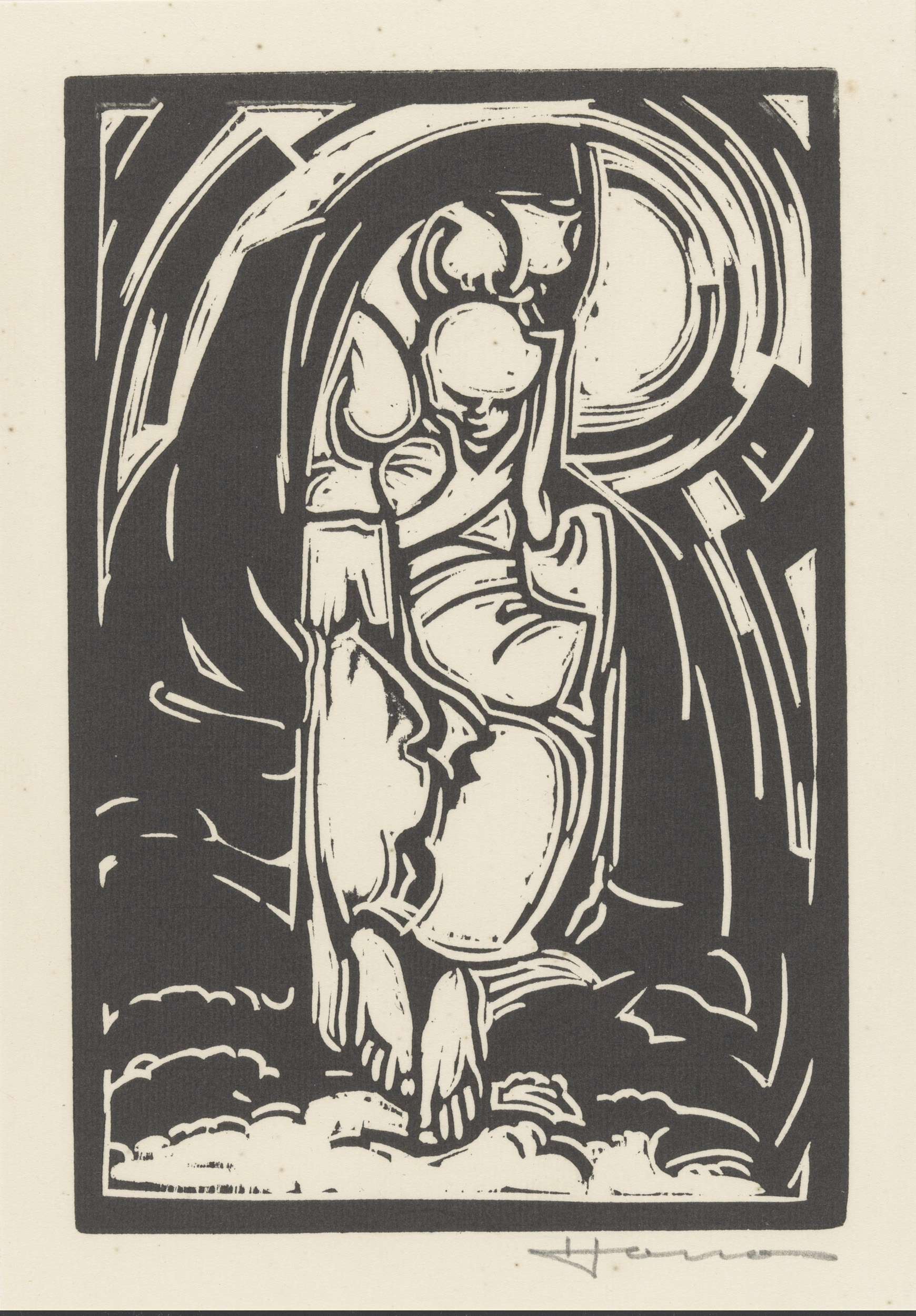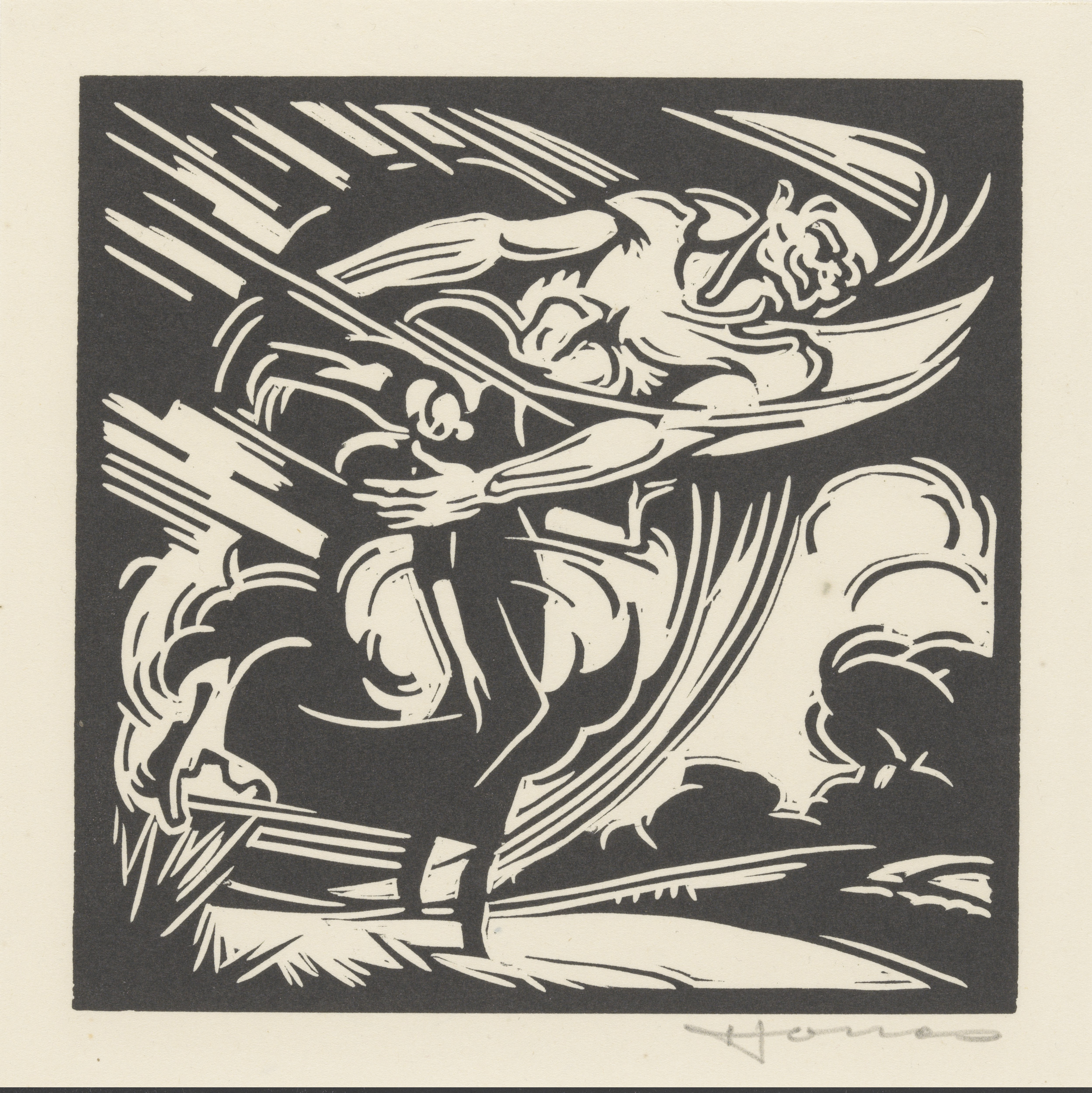 Personificatie van het onweer boven een landschap