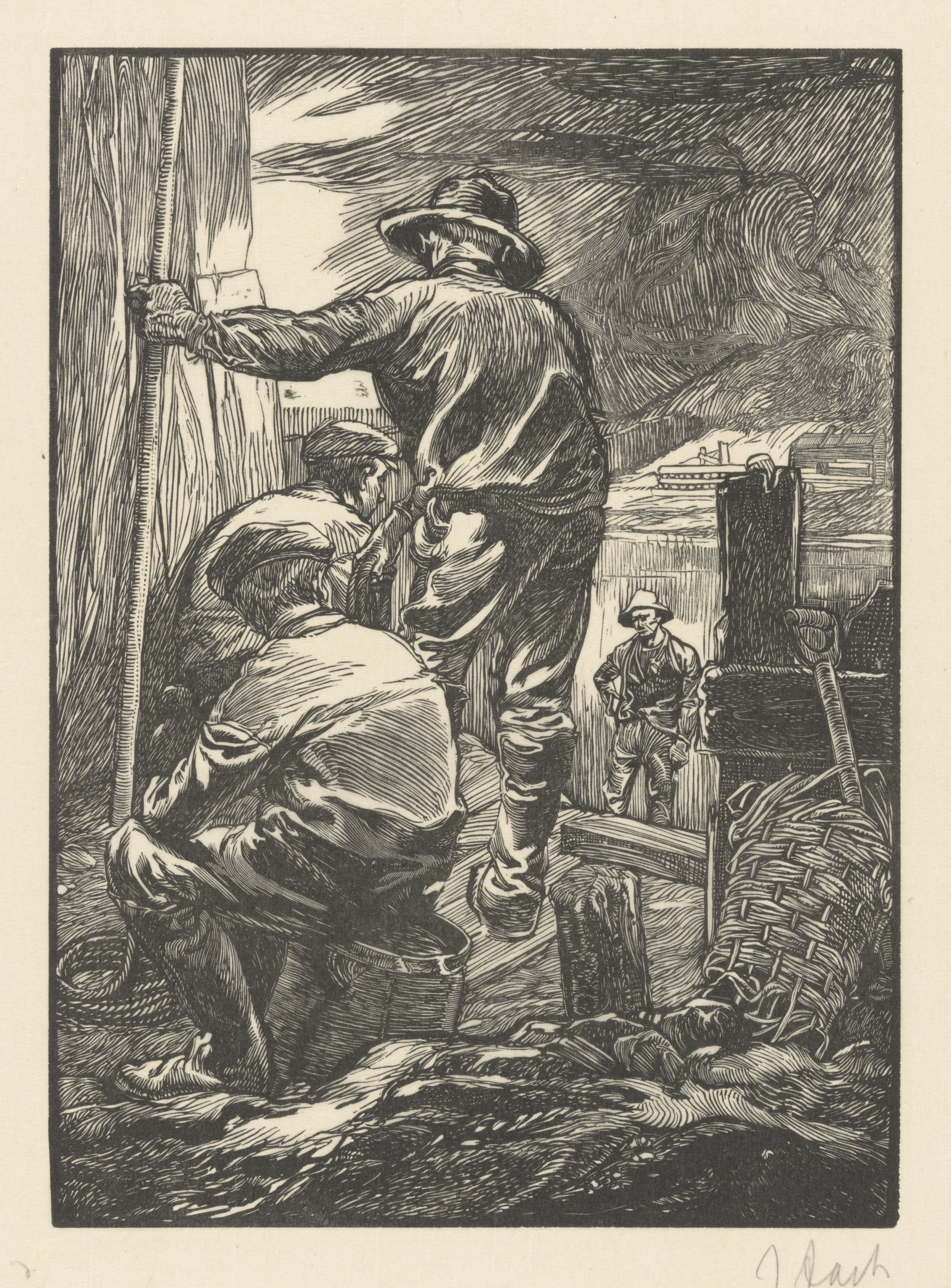 Vier heiende arbeiders bij het water