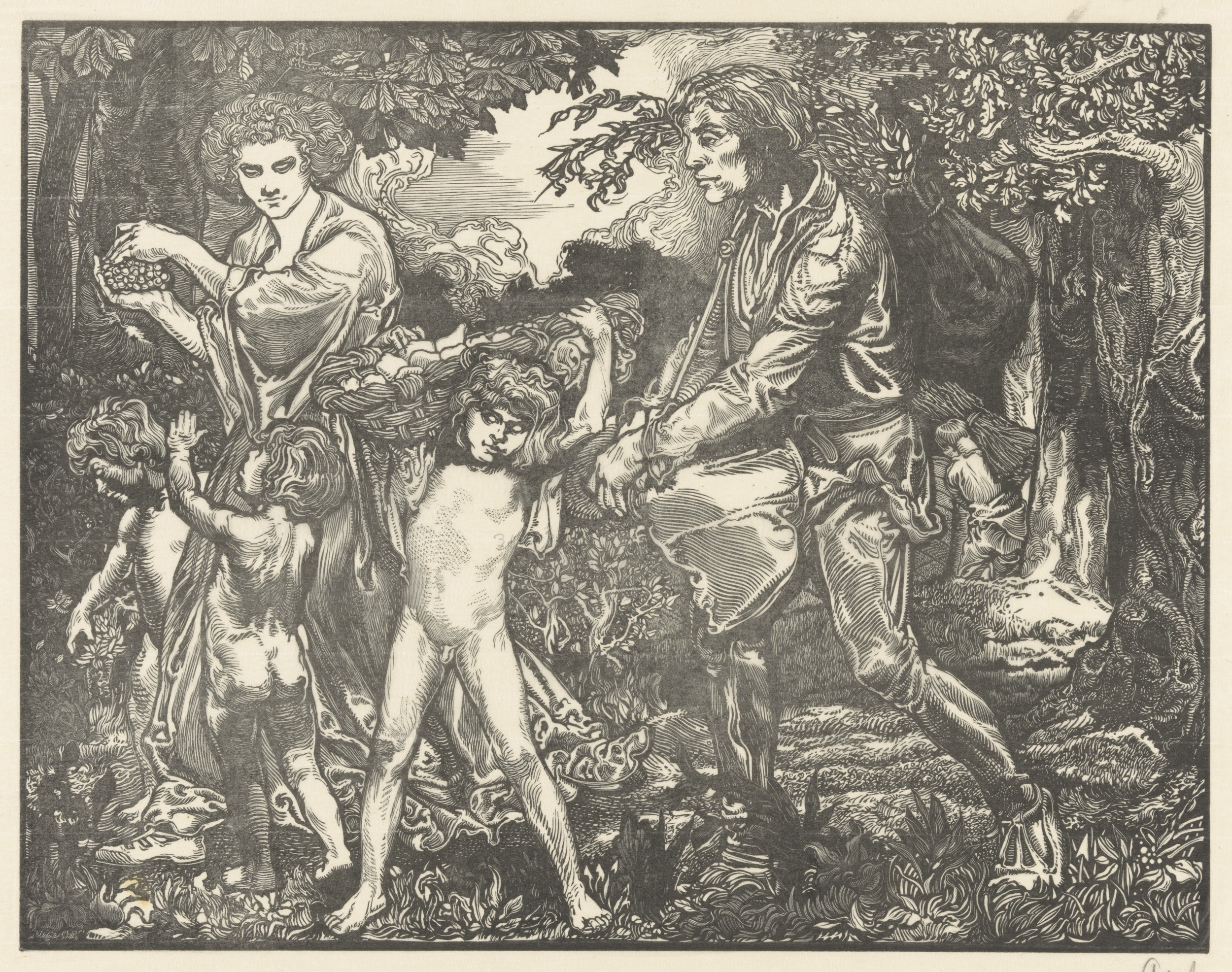 Dansende vrouwen met druiventrossen en sater