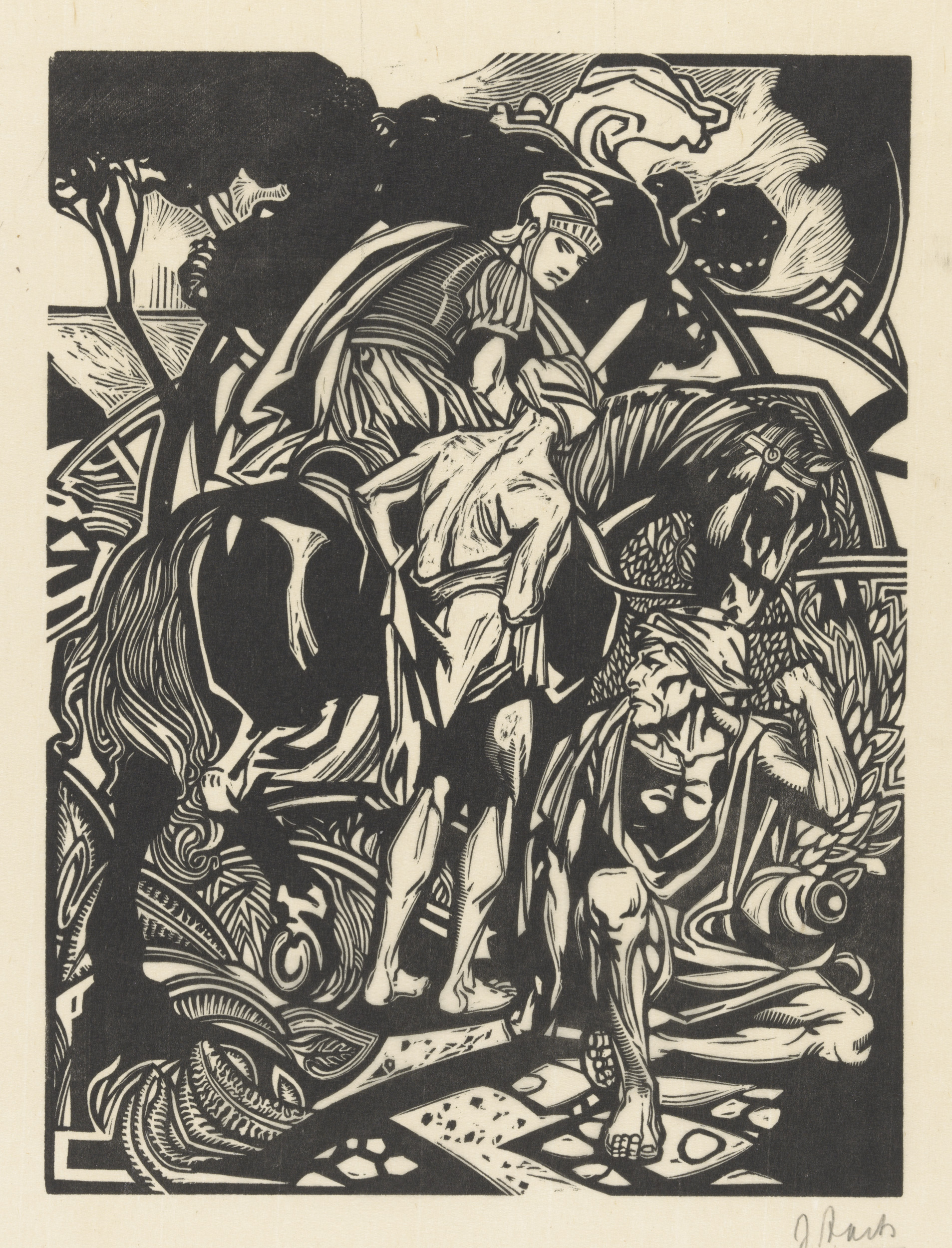 Geknielde figuur in een landschap met bomen