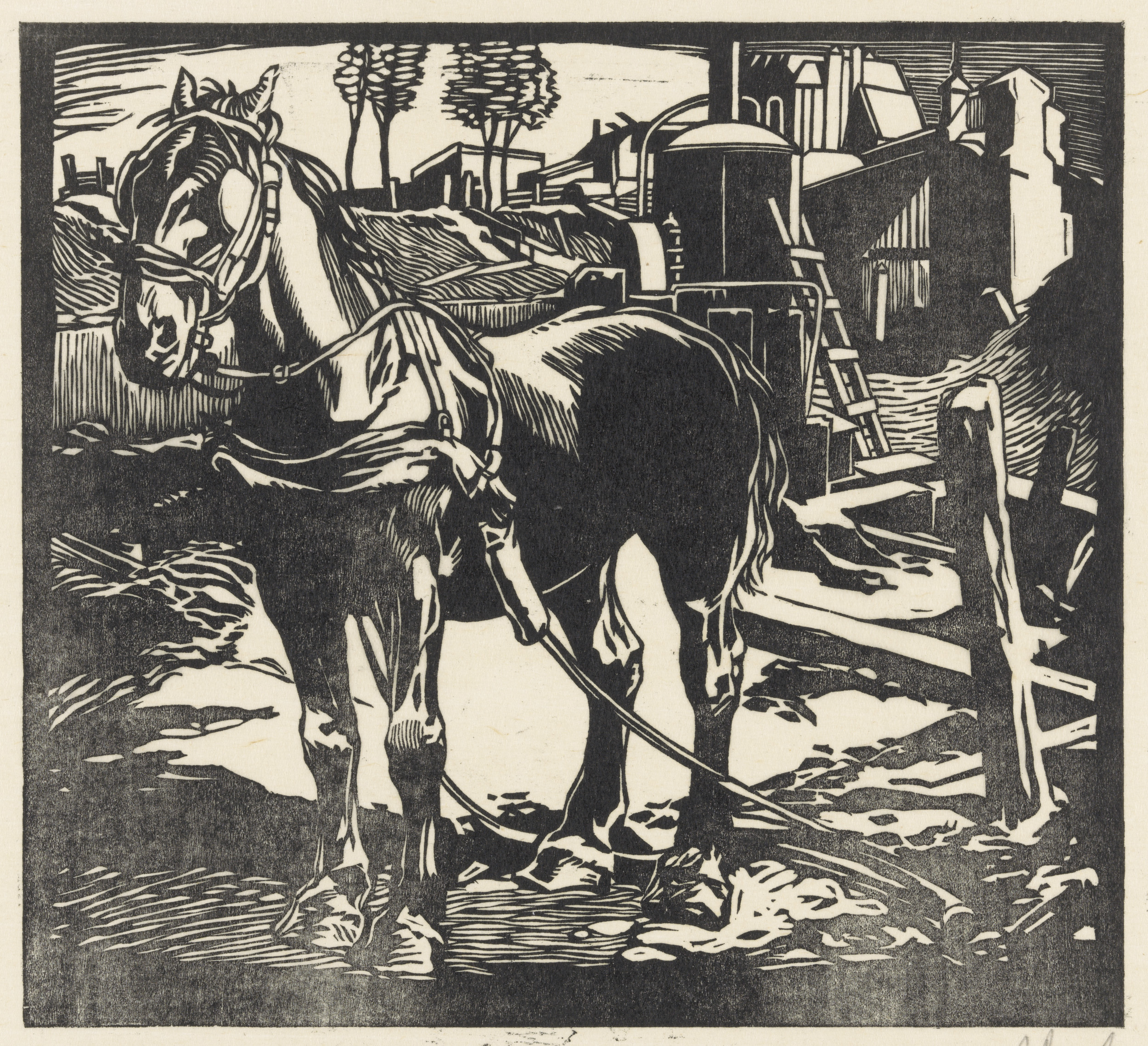 Afgespannen karrenpaard op een bouwplaats