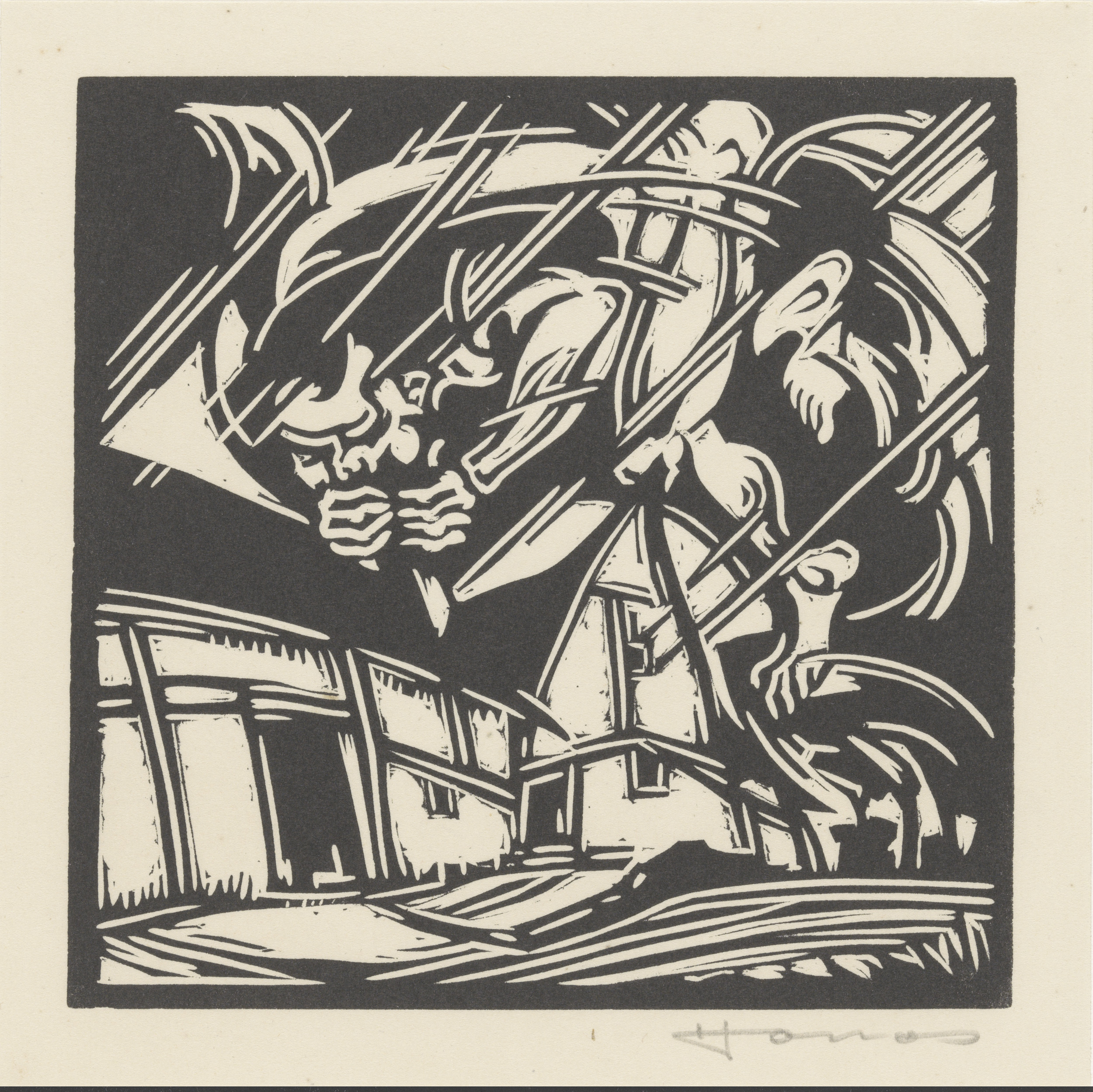 Personificatie van de wind bij een gebouw