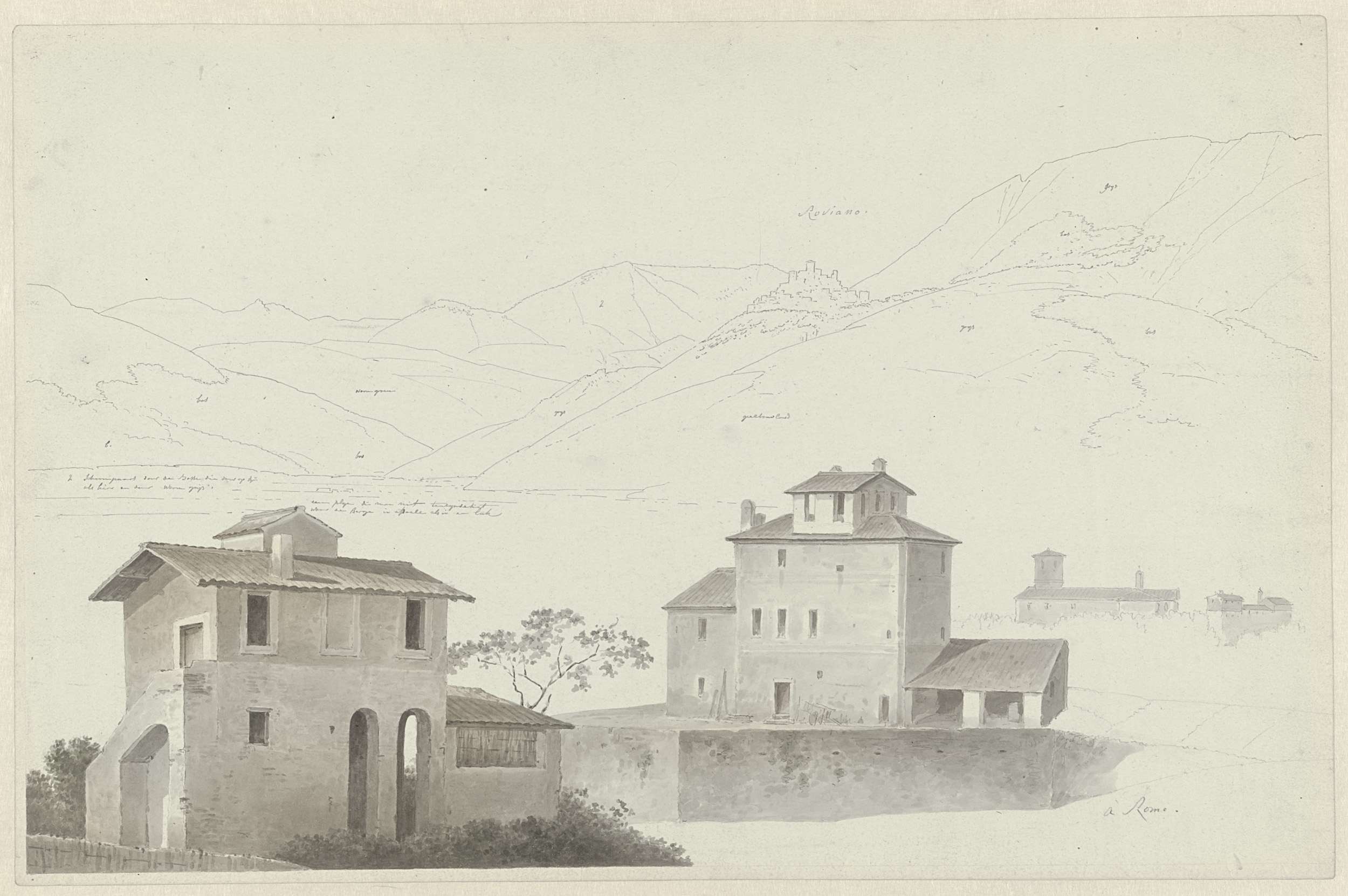 Gezicht op Roviano, op de voorgrond huizen in Rome