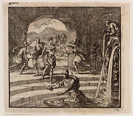 Saul werpt vanaf zijn troon een spies naar de vlucht...