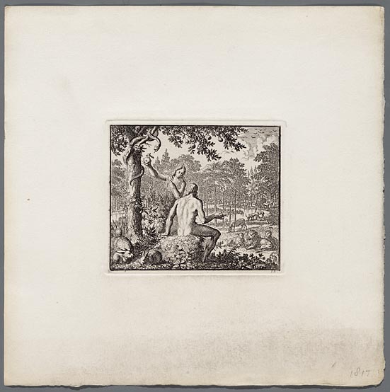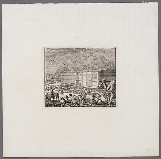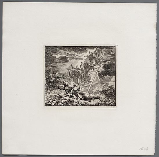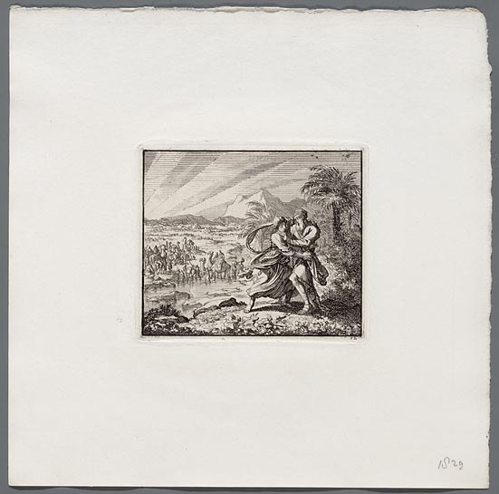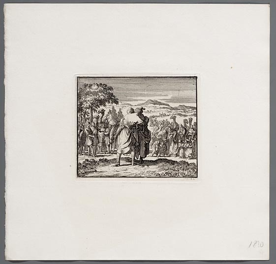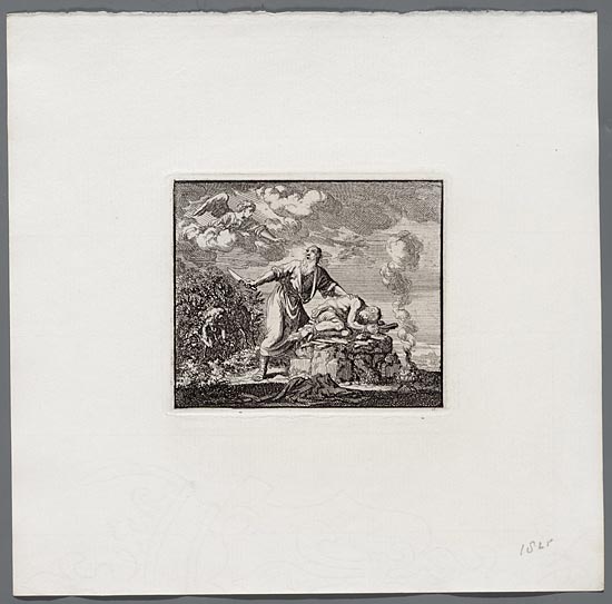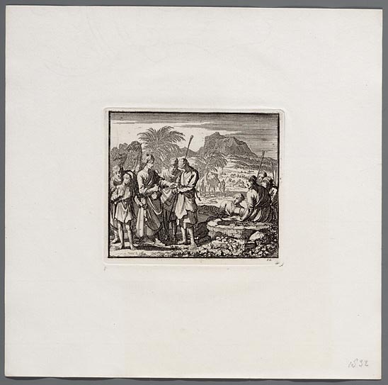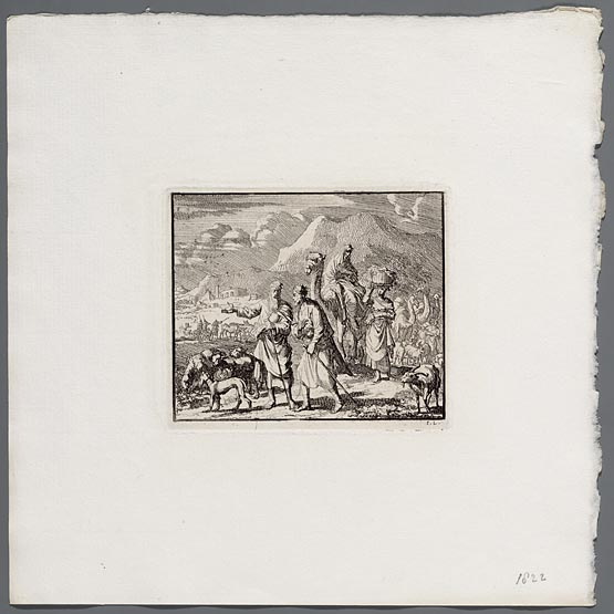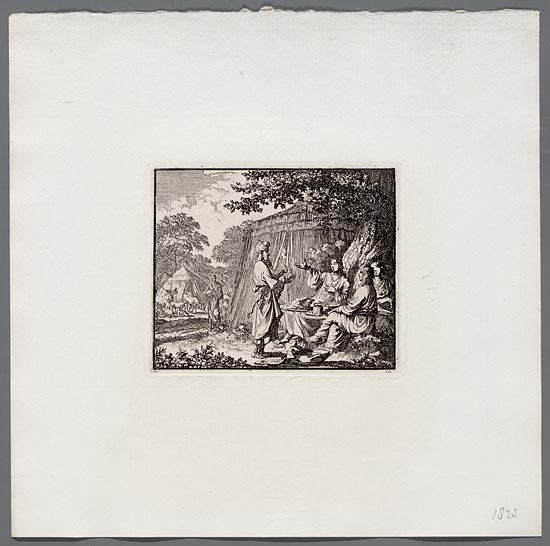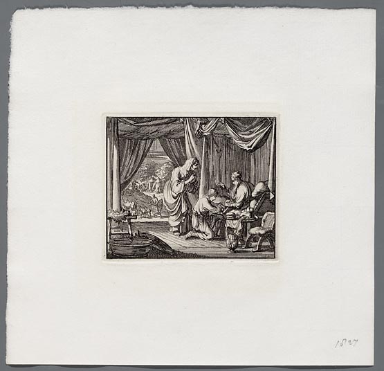 Abraham ontvangt drie engelen, Sara gluurt vanuit de...