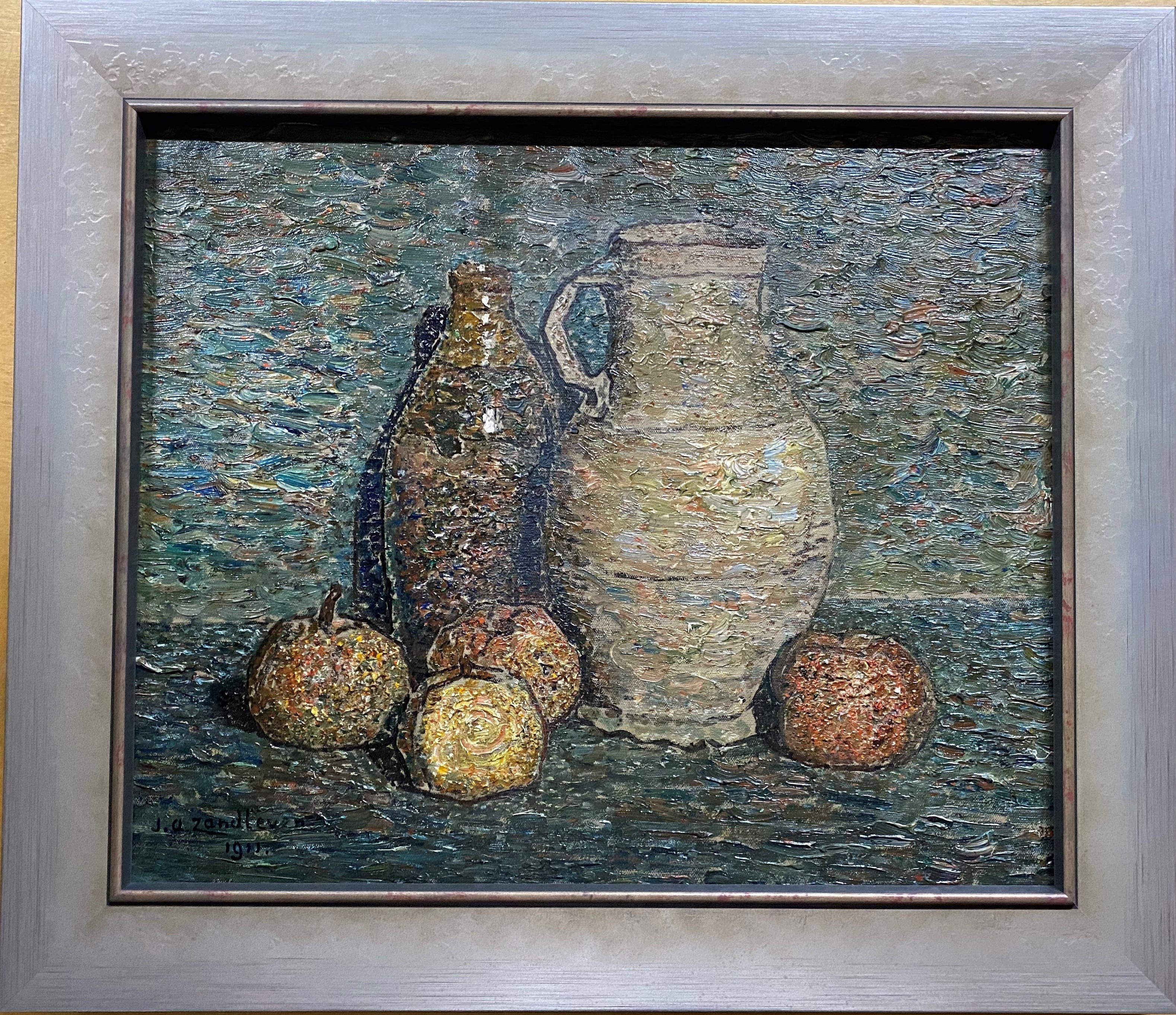 Pointillistisch stilleven met 2 grés kannen en 4 appels
