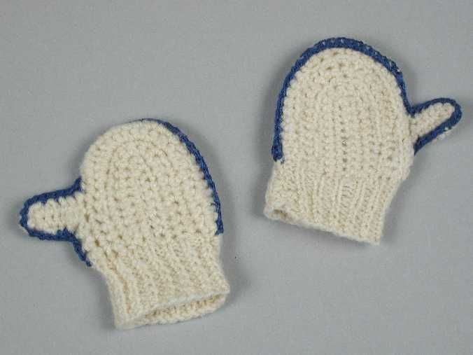 Paar poppenwanten, gehaakt en gebreid van crèmekleur...