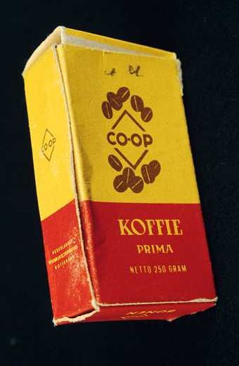 Klein rechthoekig pak "Co-op" koffie, geel en rood