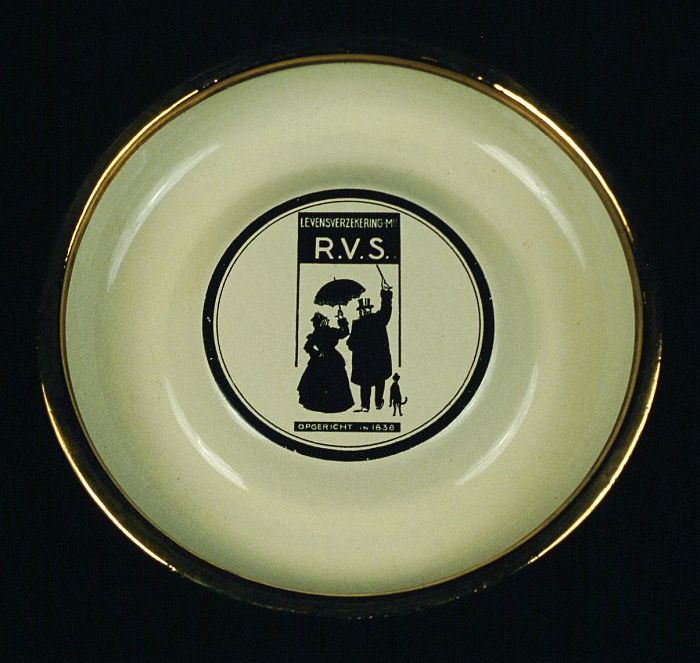 Asbak met "Levensverzekering Mij. R.V.S." en "Opgeri...