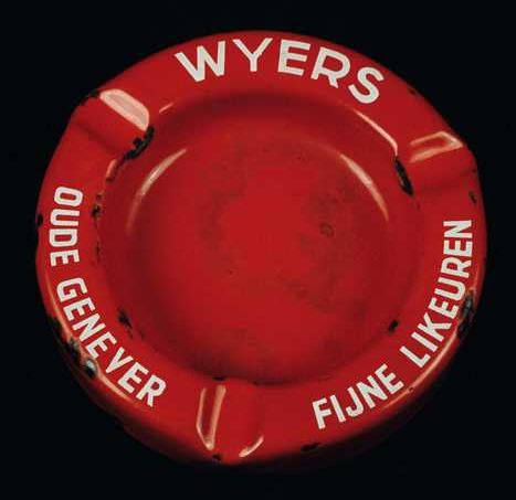 Rode ronde asbak van "Wyers Oude genever Fijne likeu...