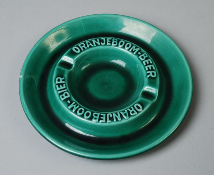 Groene asbak met "Oranjeboom-bier. Oranjeboom-beer"