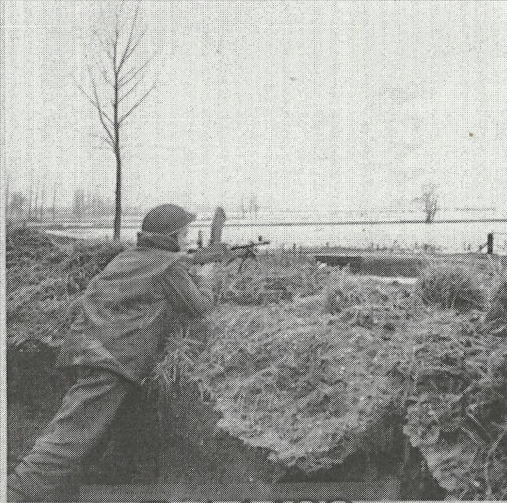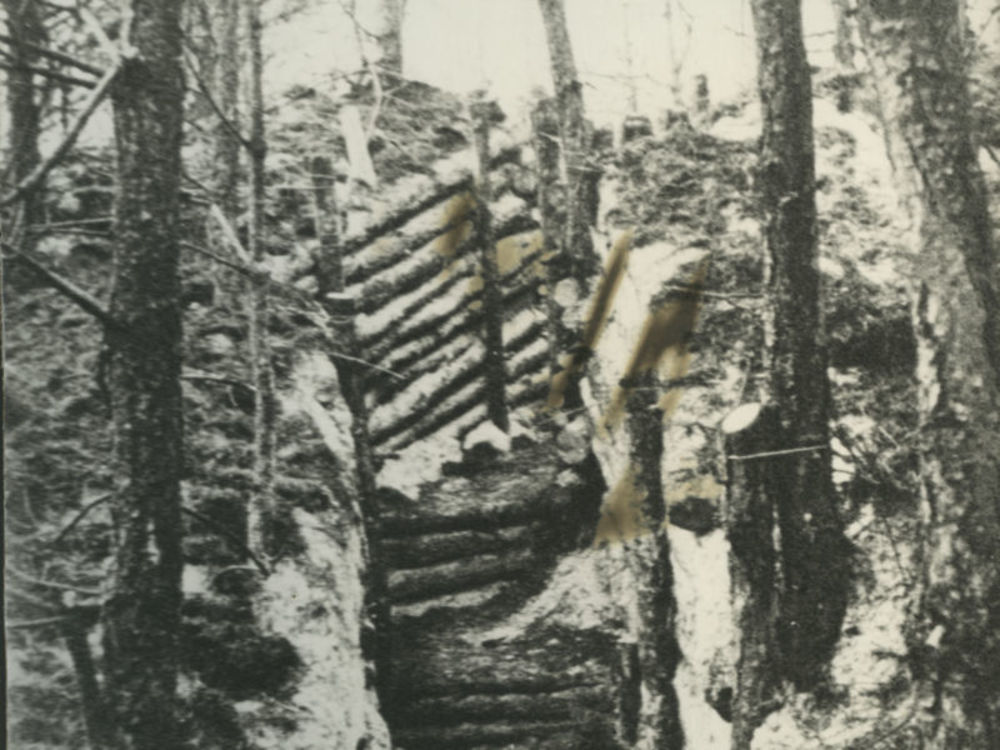 Foto van loopgraaf tussen bomen. Tekst achterop: "On...